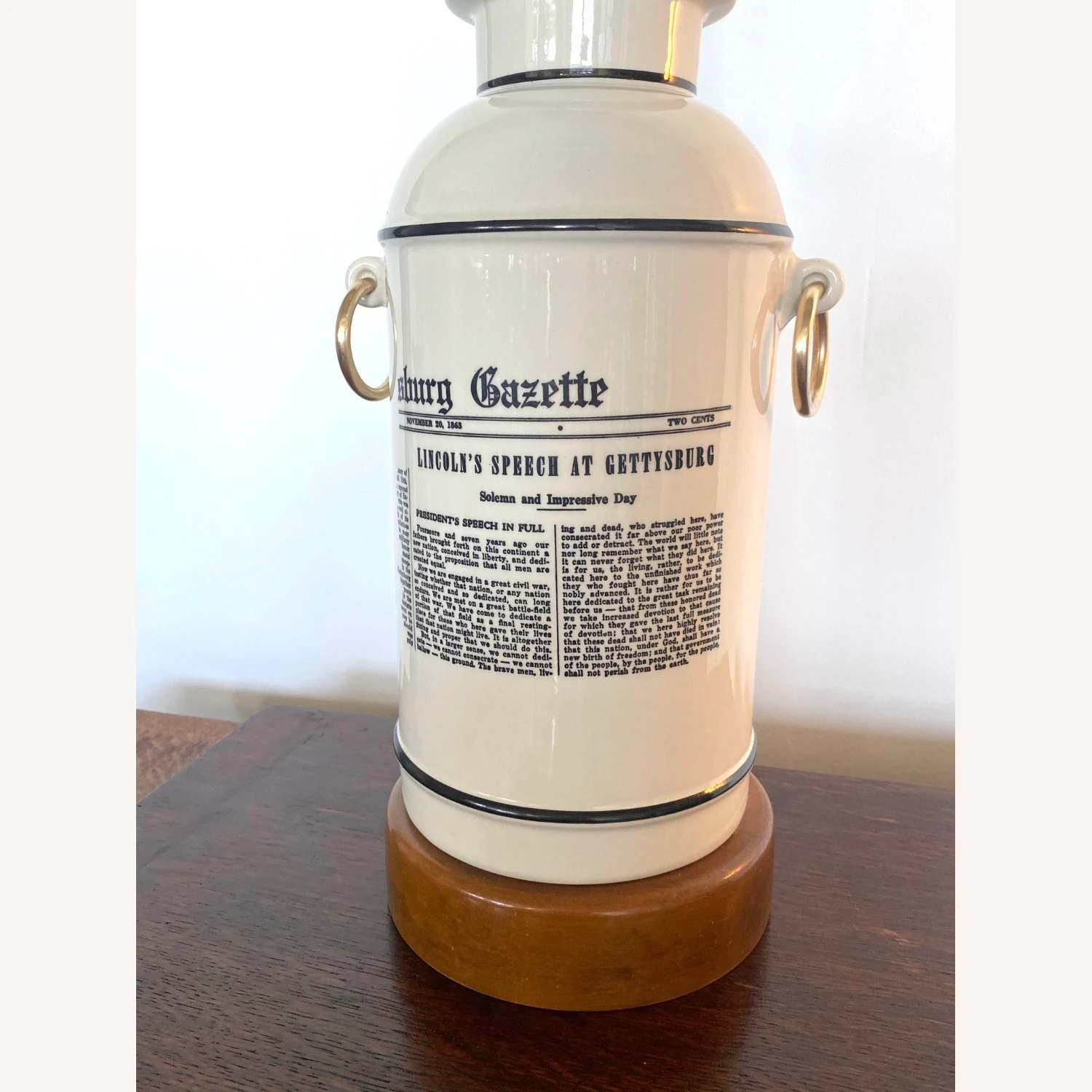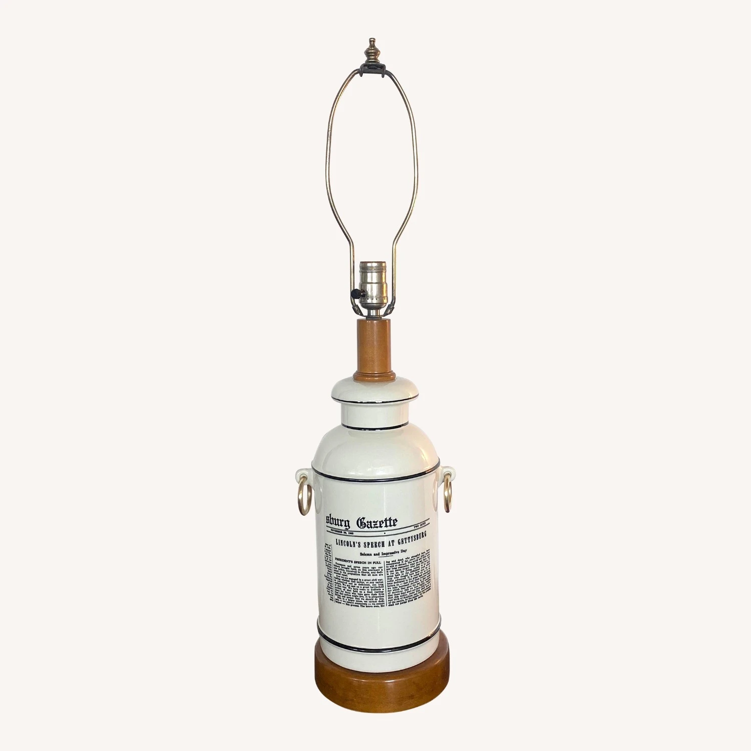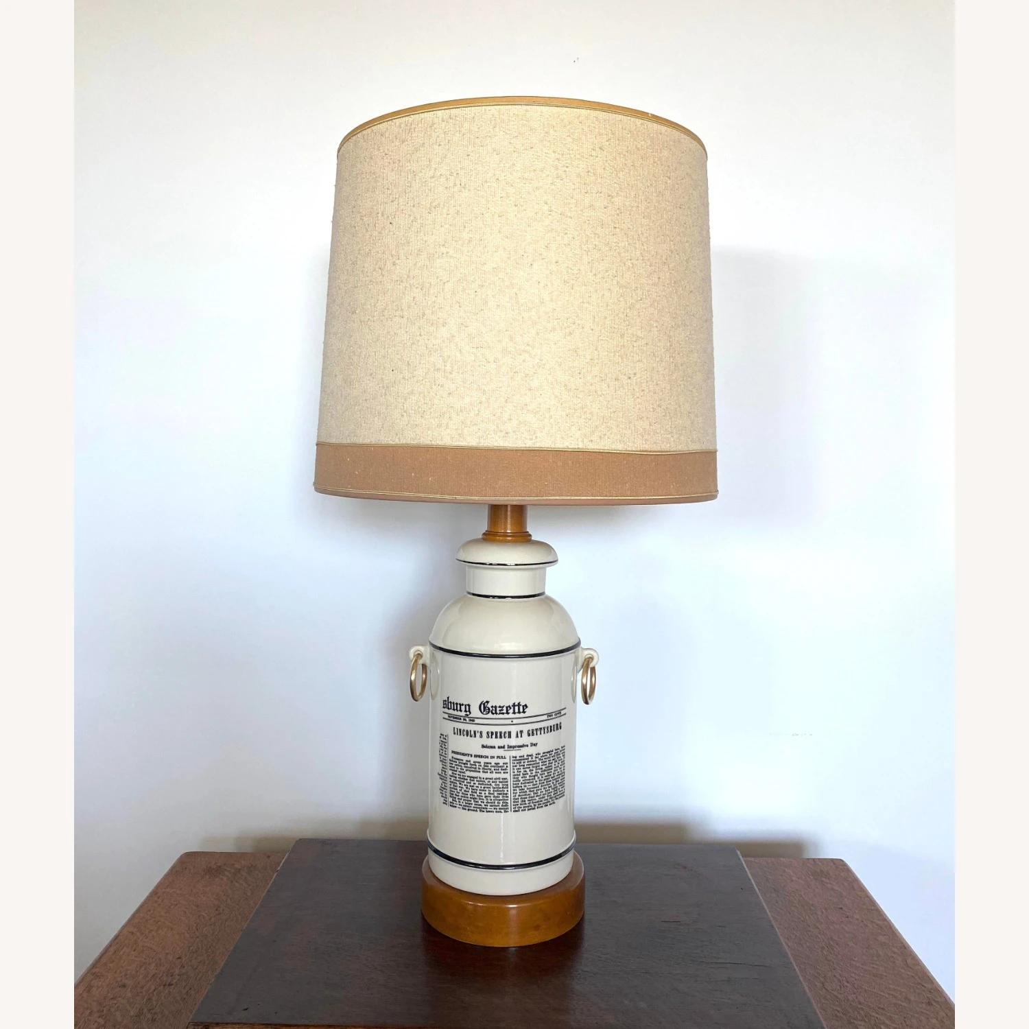 Seller’s Notes: This Mid-Century Forslund Gettysburg Address Lamp is an amazing find. Crafted with ceramic and maple wood base and neck, with original shade. Accented with pure brass ringlets. Superior in design simplicity, sturdy and an intriguing accent to any decor. Bottom is felt lined. In working order.