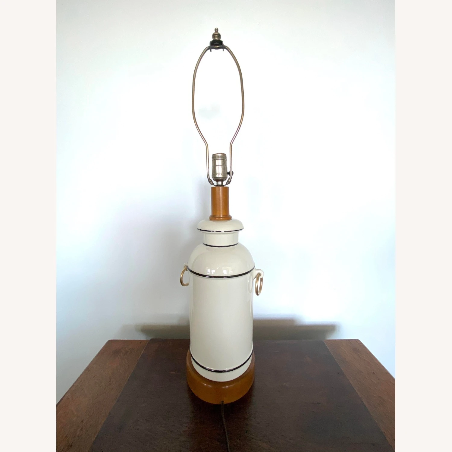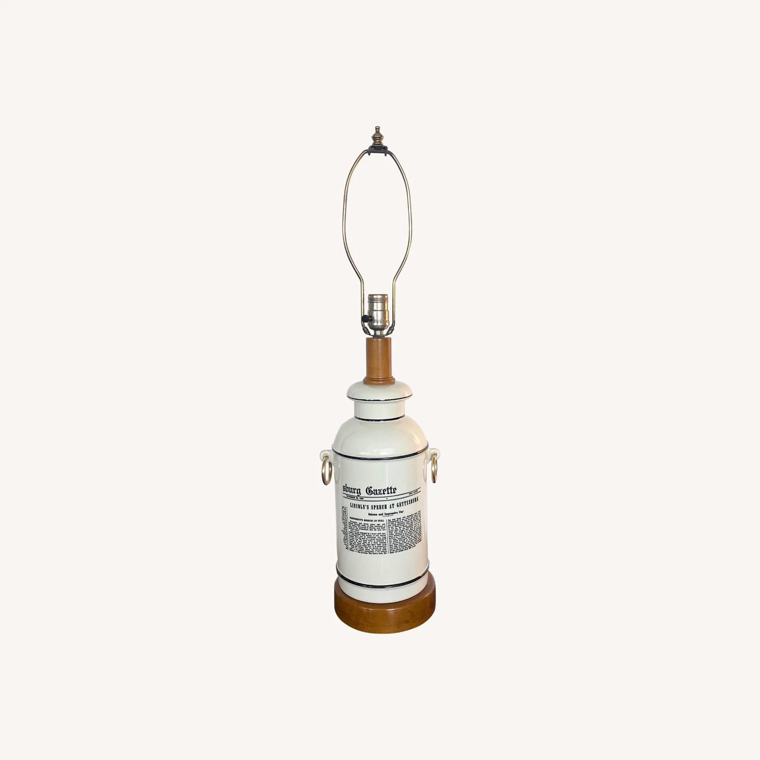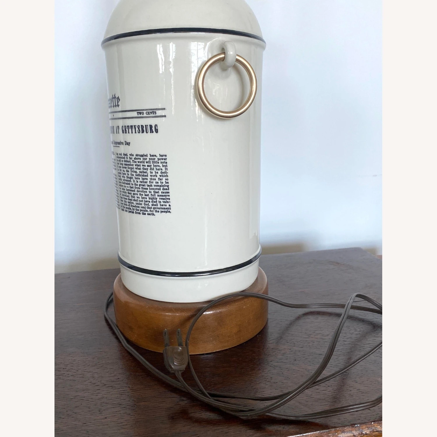 Seller’s Notes: This Mid-Century Forslund Gettysburg Address Lamp is an amazing find. Crafted with ceramic and maple wood base and neck, with original shade. Accented with pure brass ringlets. Superior in design simplicity, sturdy and an intriguing accent to any decor. Bottom is felt lined. In working order.