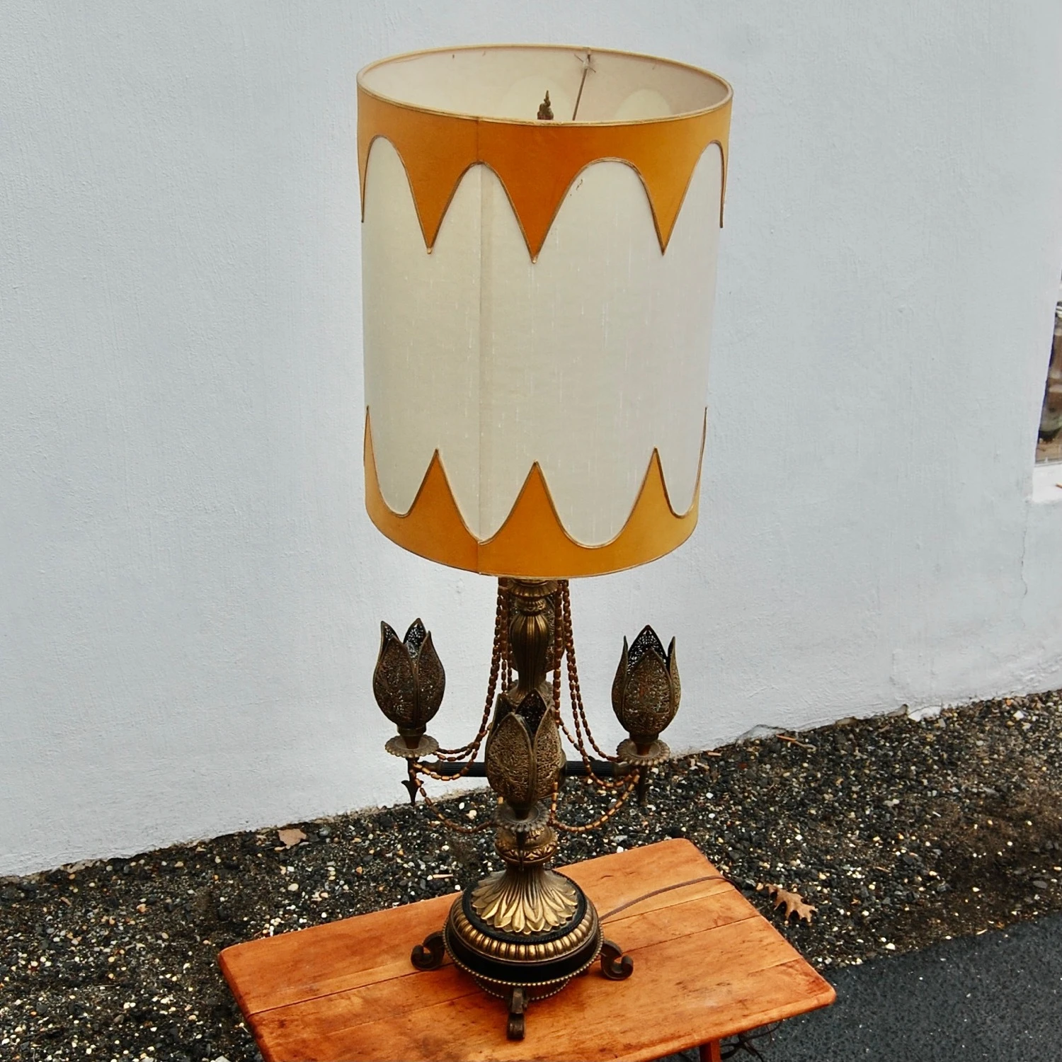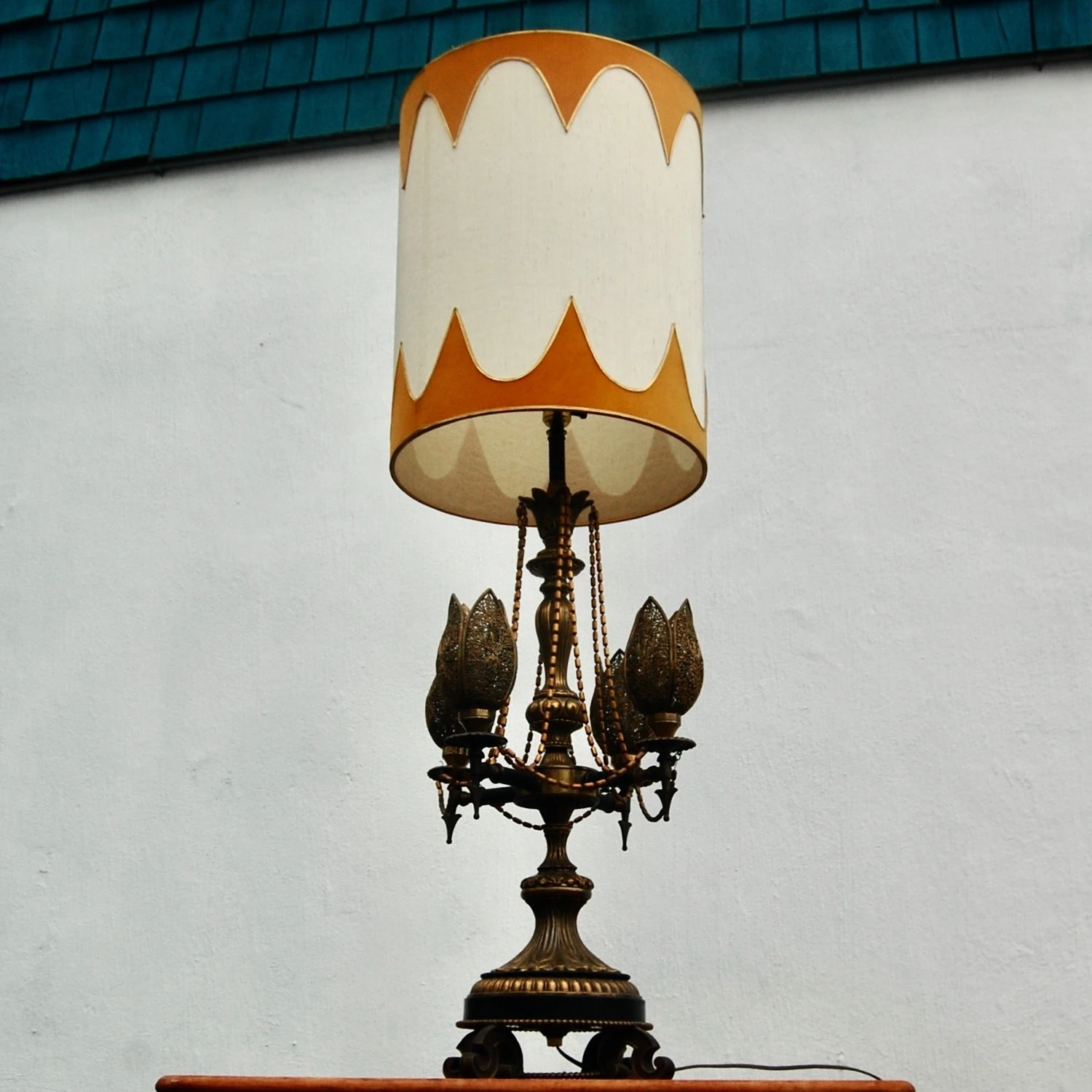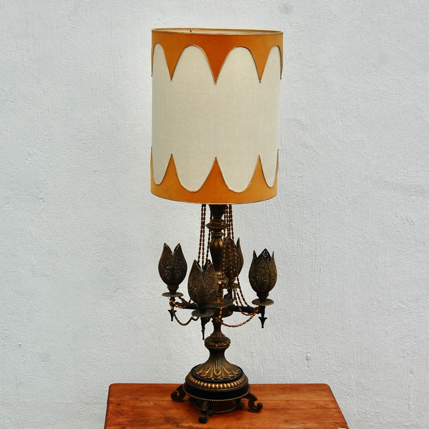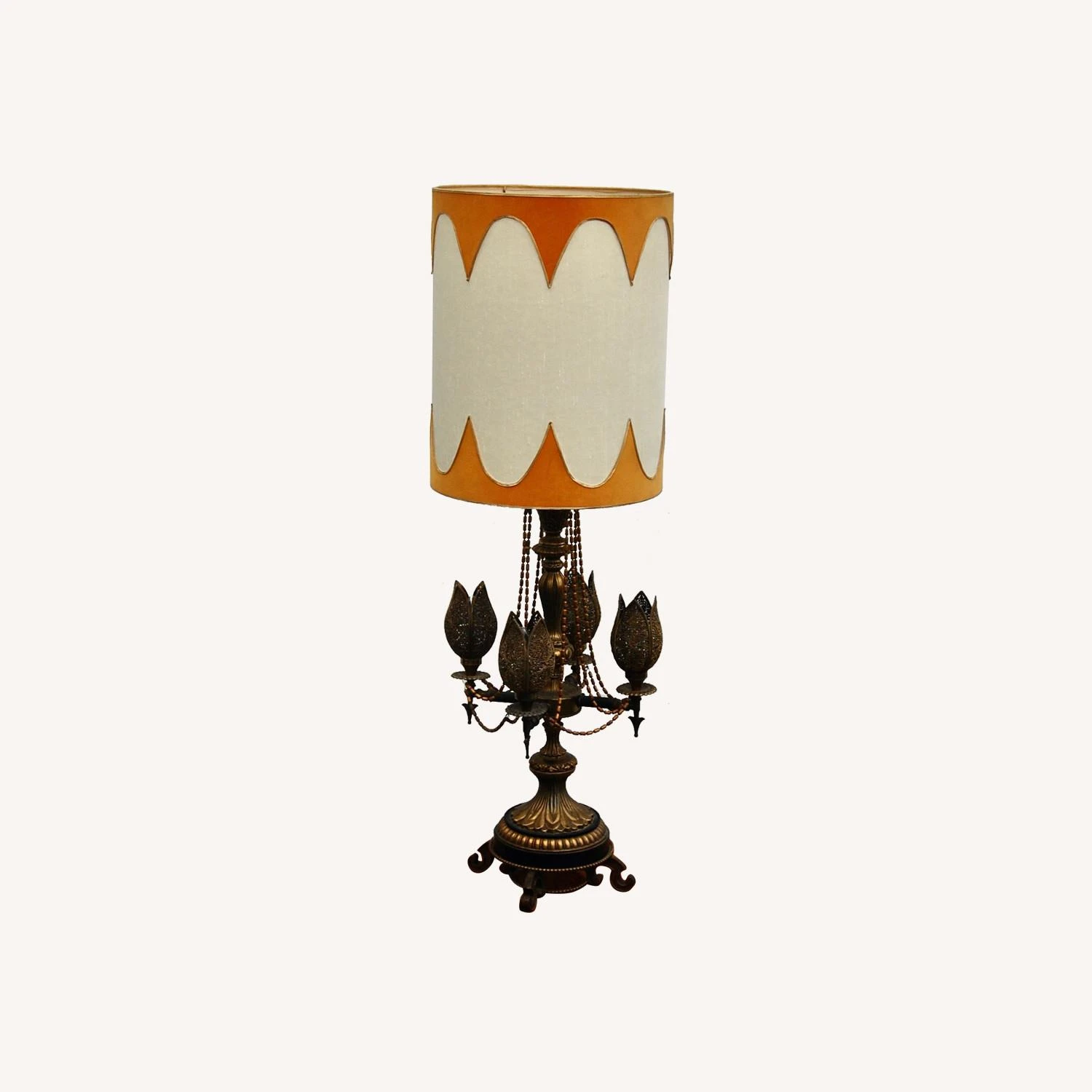 Seller’s Notes: Beautiful large table lamp from the 1970’s. Perfect for Bohemian or Midcentury Decor! Rendered in brass with four pod shaped floral lights. these pods are perforated brass. They are switched separately from the main light. The base has a leaf pattern base sitting a scrolling feet. The oversized lamp white shade it original and in very good vintage condition. Trimmed with scalloped orange trim at the top and bottom of the shade. Overall height, including shade is 47″. This piece is in good working order.