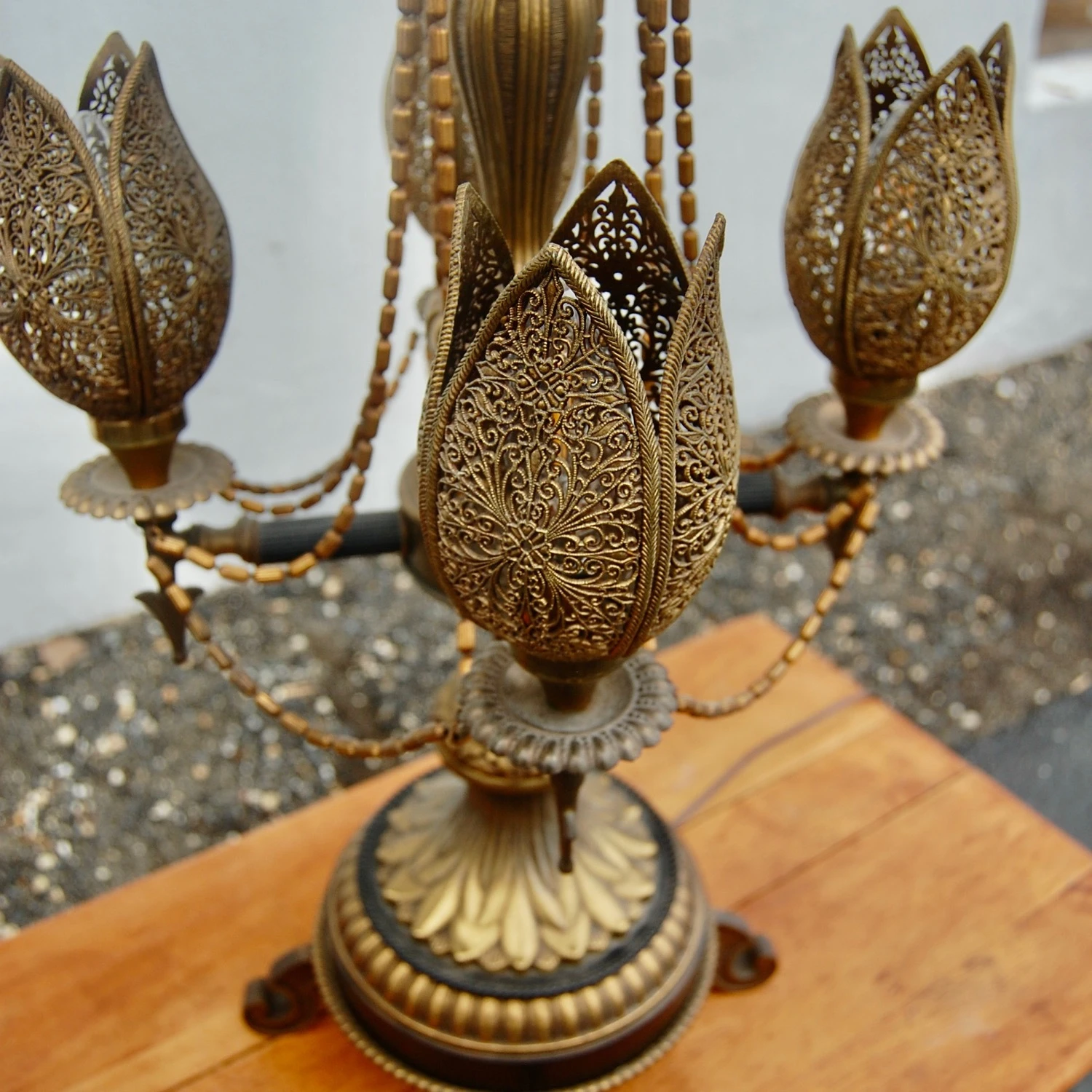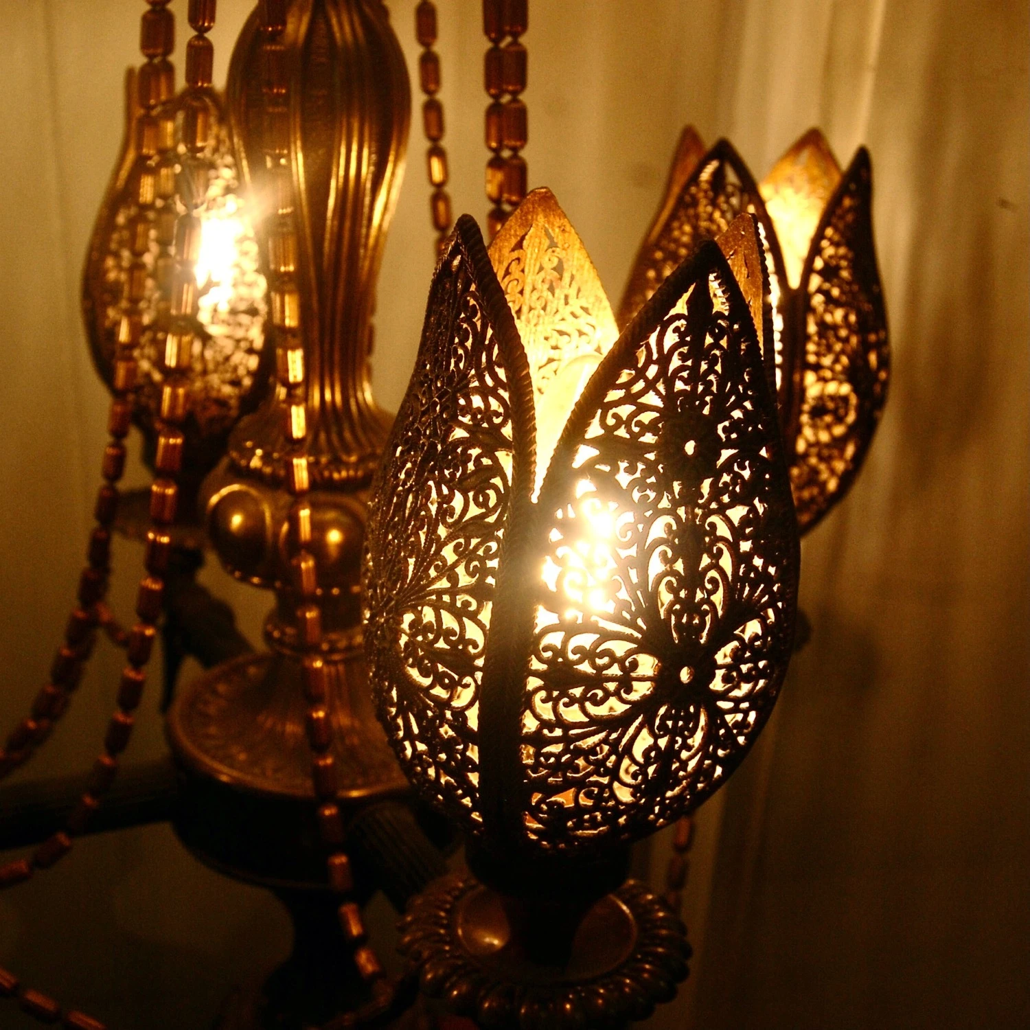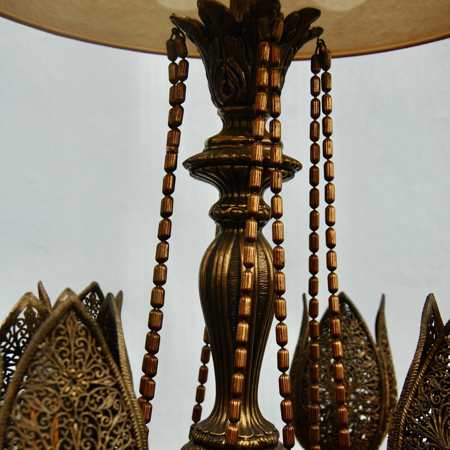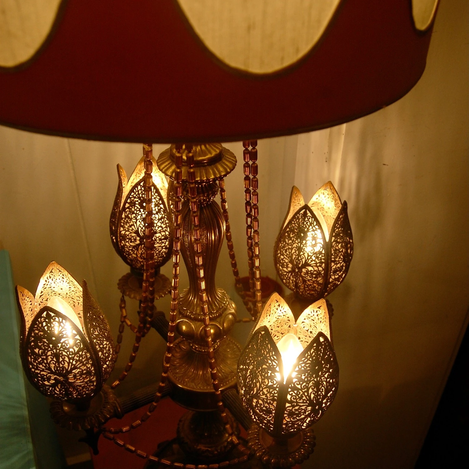 Seller’s Notes: Beautiful large table lamp from the 1970’s. Perfect for Bohemian or Midcentury Decor! Rendered in brass with four pod shaped floral lights. these pods are perforated brass. They are switched separately from the main light. The base has a leaf pattern base sitting a scrolling feet. The oversized lamp white shade it original and in very good vintage condition. Trimmed with scalloped orange trim at the top and bottom of the shade. Overall height, including shade is 47″. This piece is in good working order.