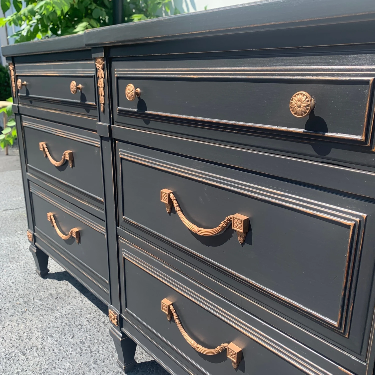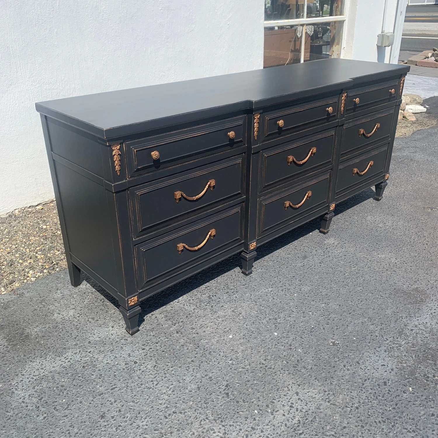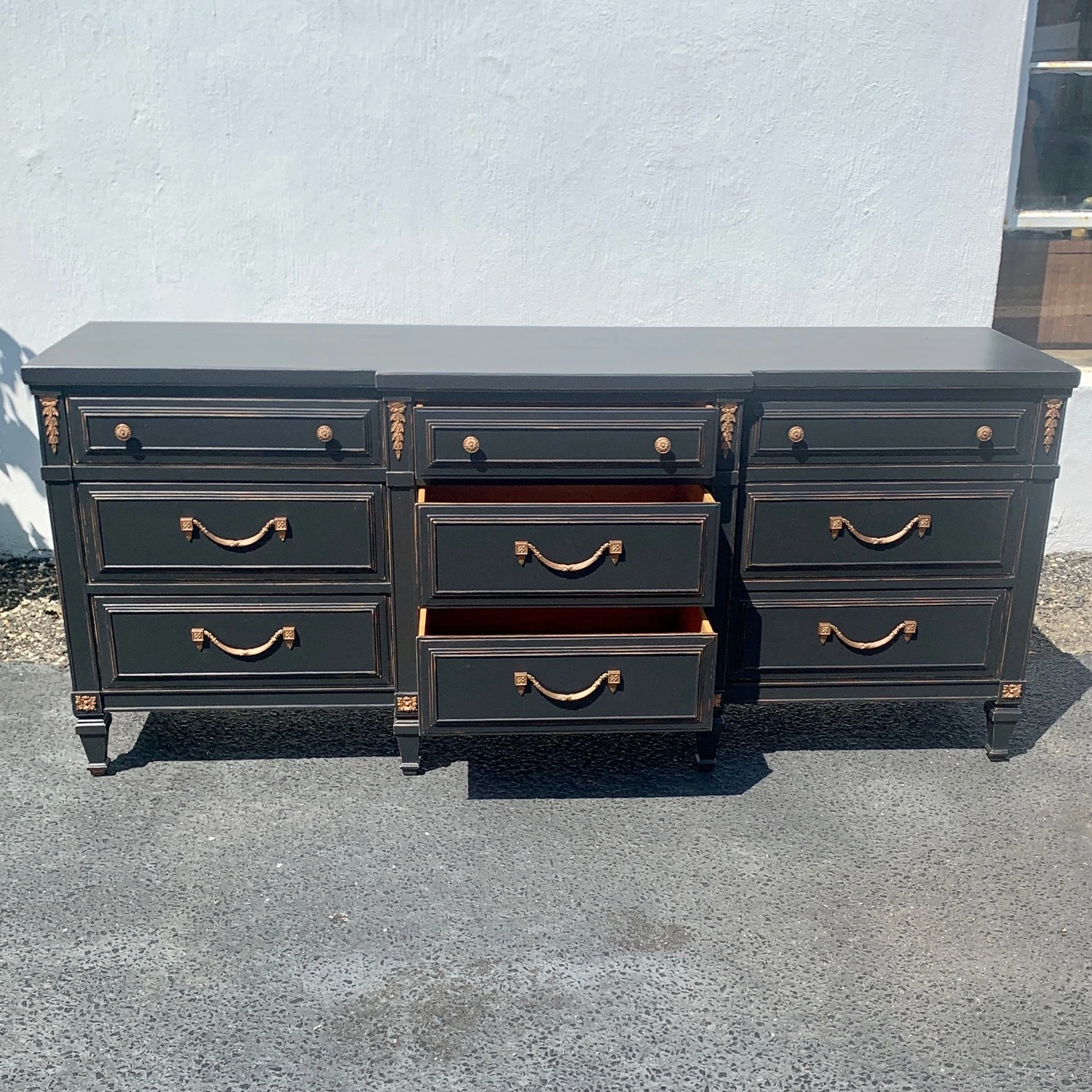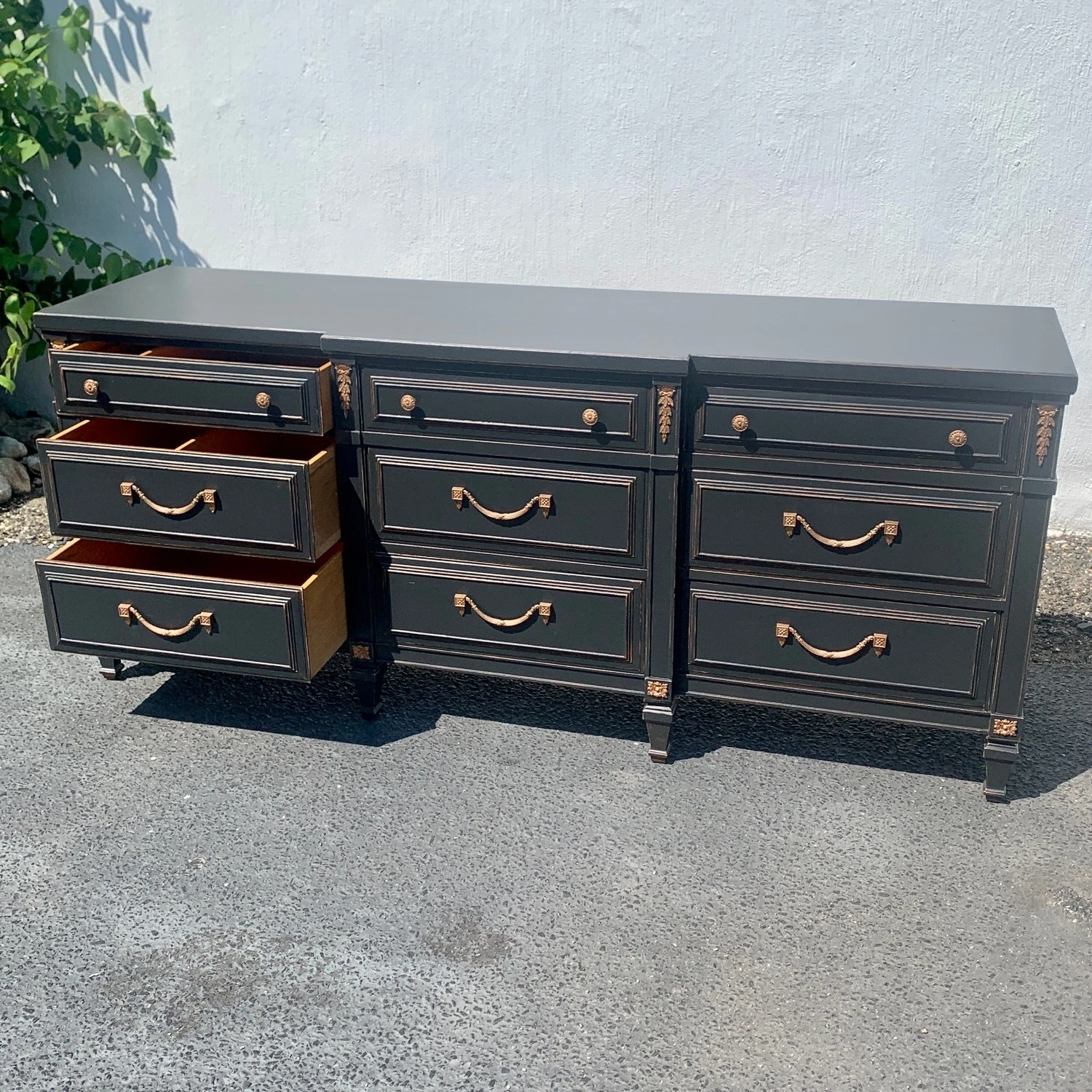 Seller’s Notes: Lowboy dresser from the 1970’s, refinished in black with blueish undertones. Finish has been very slightly distressed along the edges of the piece. this piece features the original pulls and hardware that has been updated with copper gilding wax. There are nine easy moving drawers. this a breakfront piece – the center portion is a couple of inches deeper than the rest of the piece.. This handsome piece, in neutral color, will enhance any room!
