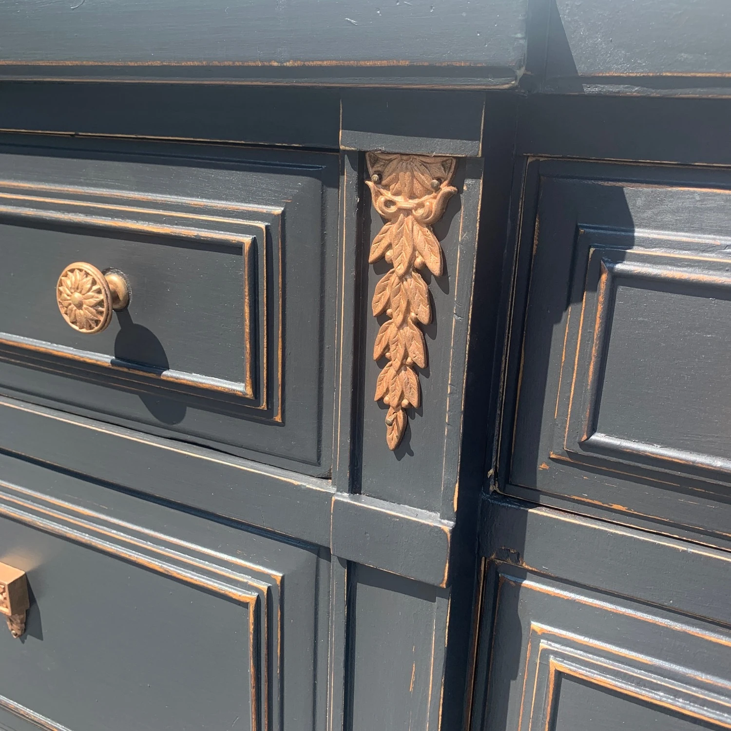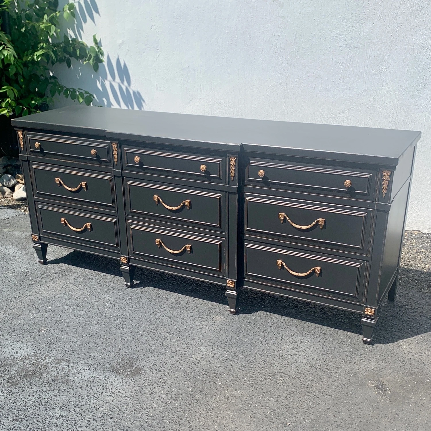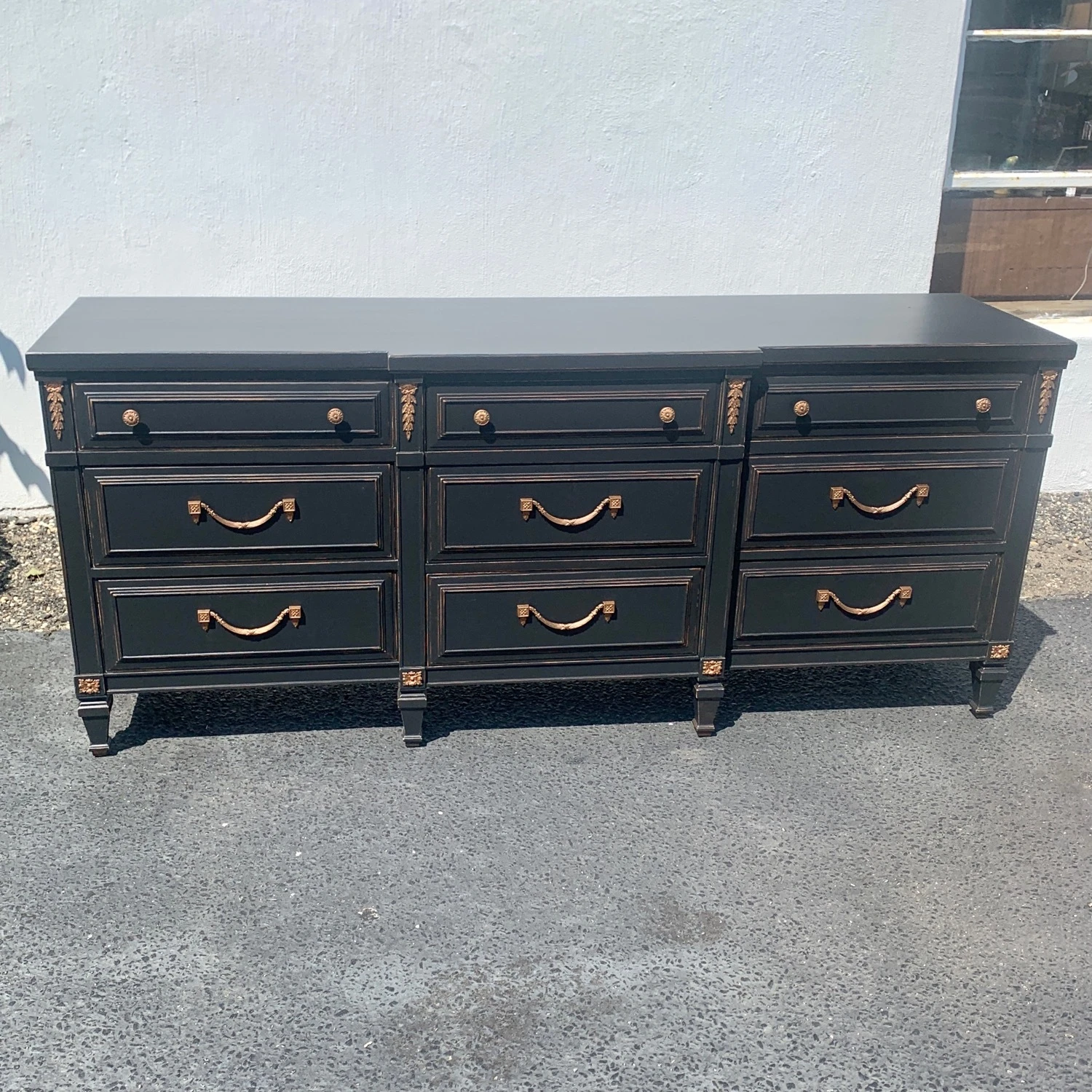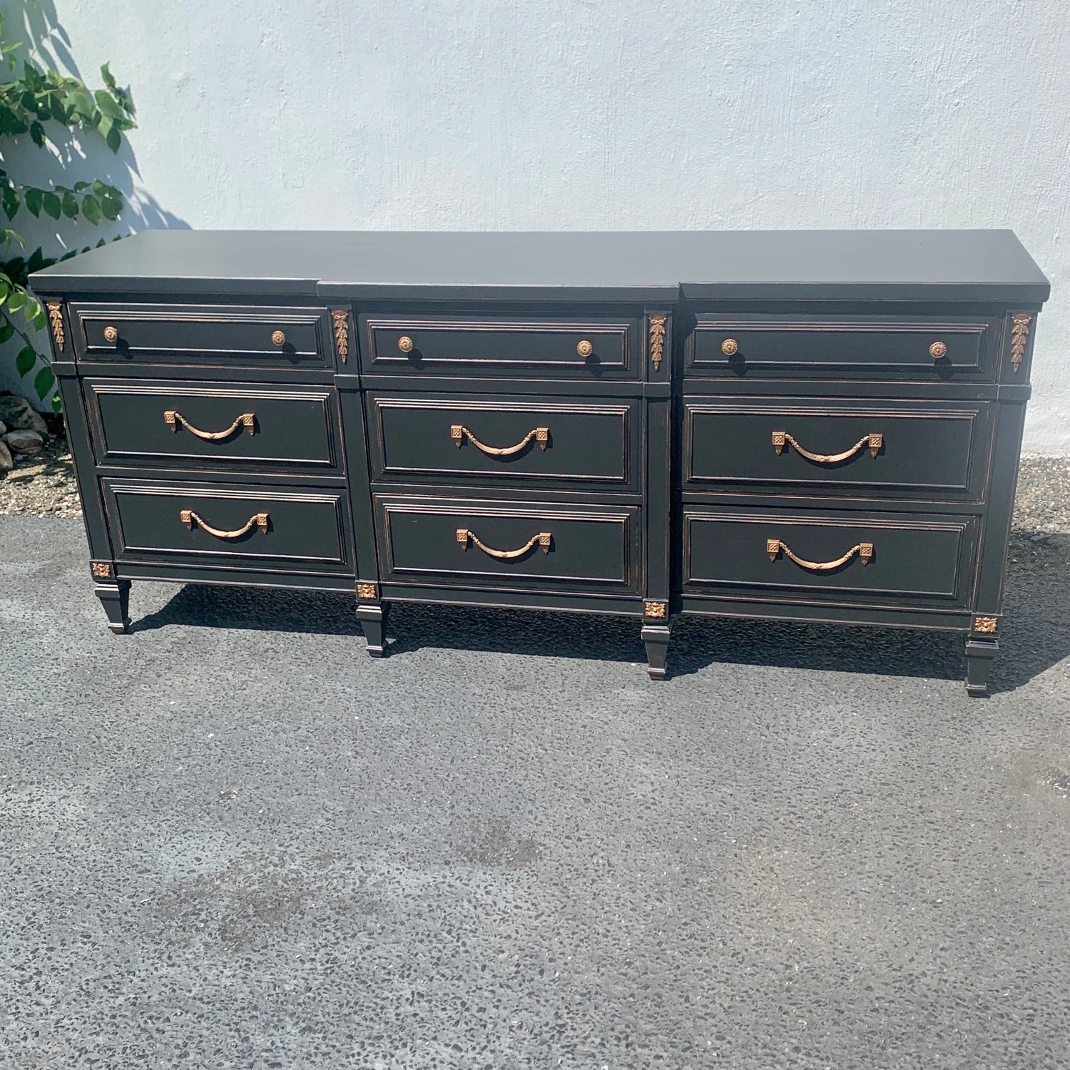 Seller’s Notes: Lowboy dresser from the 1970’s, refinished in black with blueish undertones. Finish has been very slightly distressed along the edges of the piece. this piece features the original pulls and hardware that has been updated with copper gilding wax. There are nine easy moving drawers. this a breakfront piece – the center portion is a couple of inches deeper than the rest of the piece.. This handsome piece, in neutral color, will enhance any room!