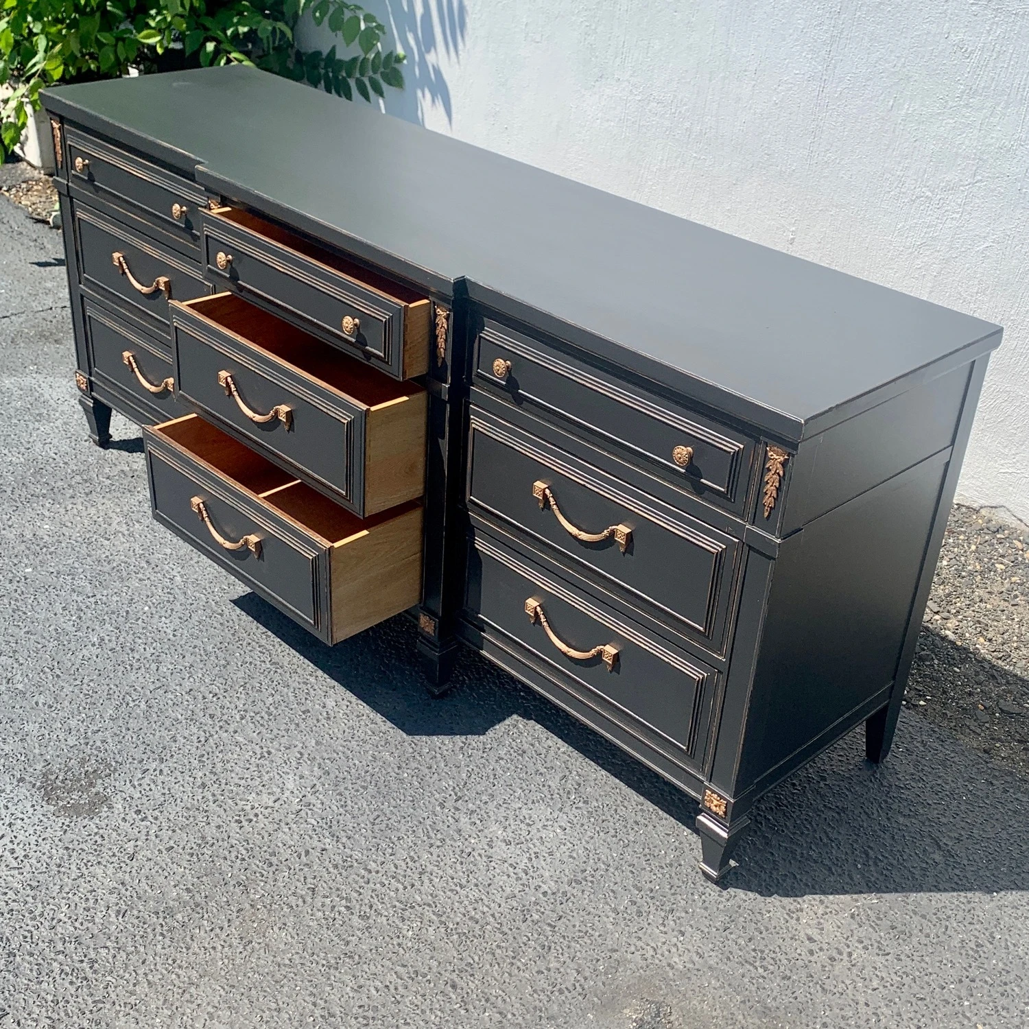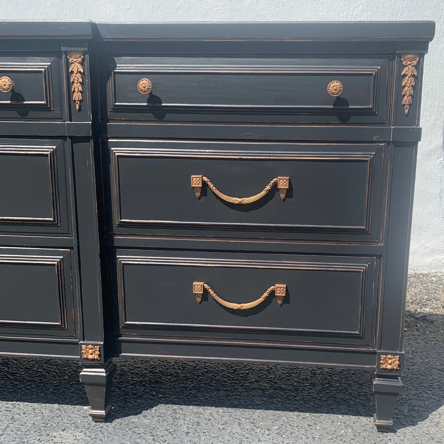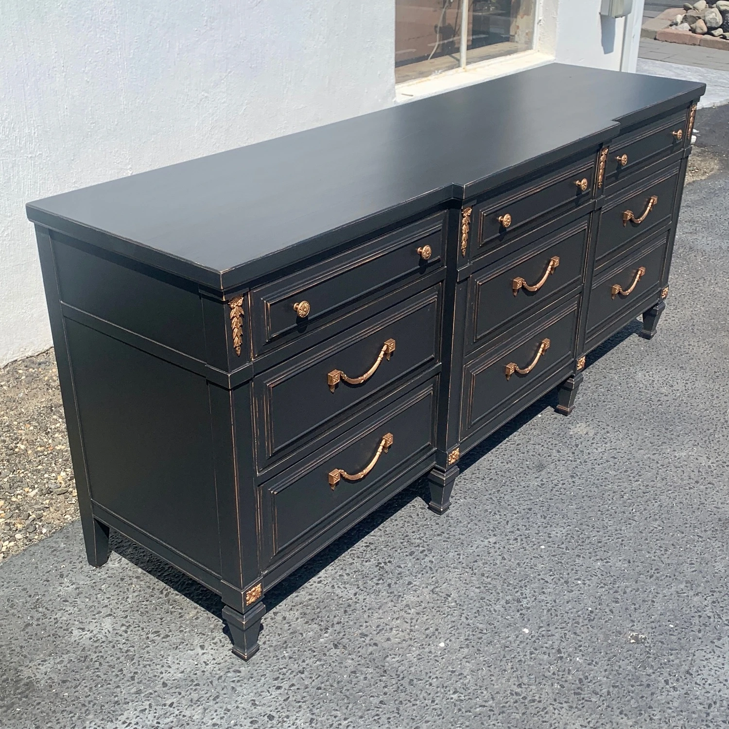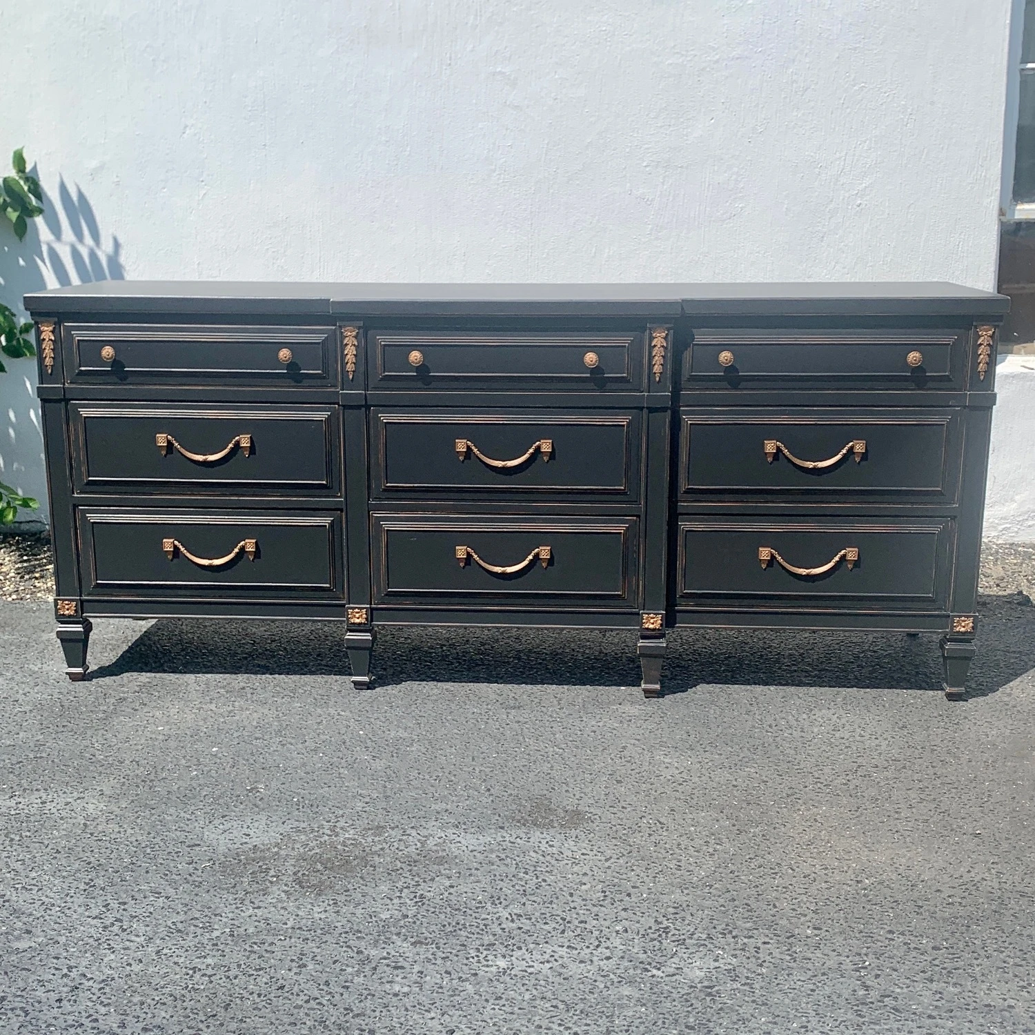 Seller’s Notes: Lowboy dresser from the 1970’s, refinished in black with blueish undertones. Finish has been very slightly distressed along the edges of the piece. this piece features the original pulls and hardware that has been updated with copper gilding wax. There are nine easy moving drawers. this a breakfront piece – the center portion is a couple of inches deeper than the rest of the piece.. This handsome piece, in neutral color, will enhance any room!