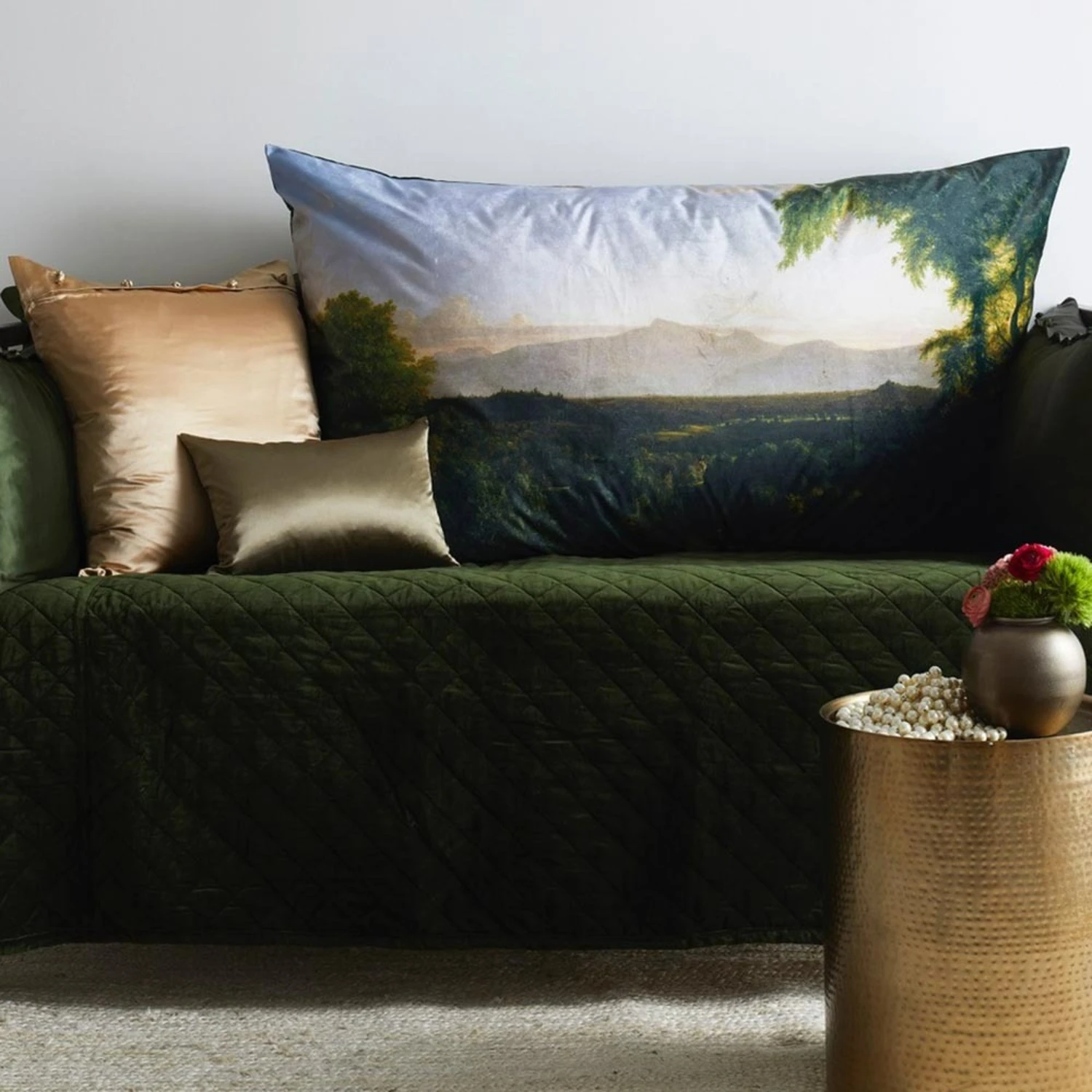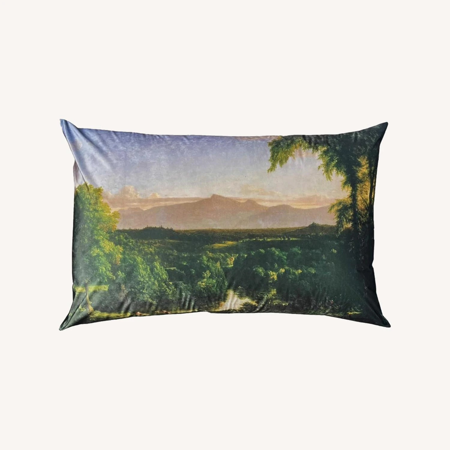 Inspired by the Majesty of the Hudson River School paintings, this beautiful piece of art allows the Paintings richness to shine through . The back of the oversized pillow is velvet hunter green.