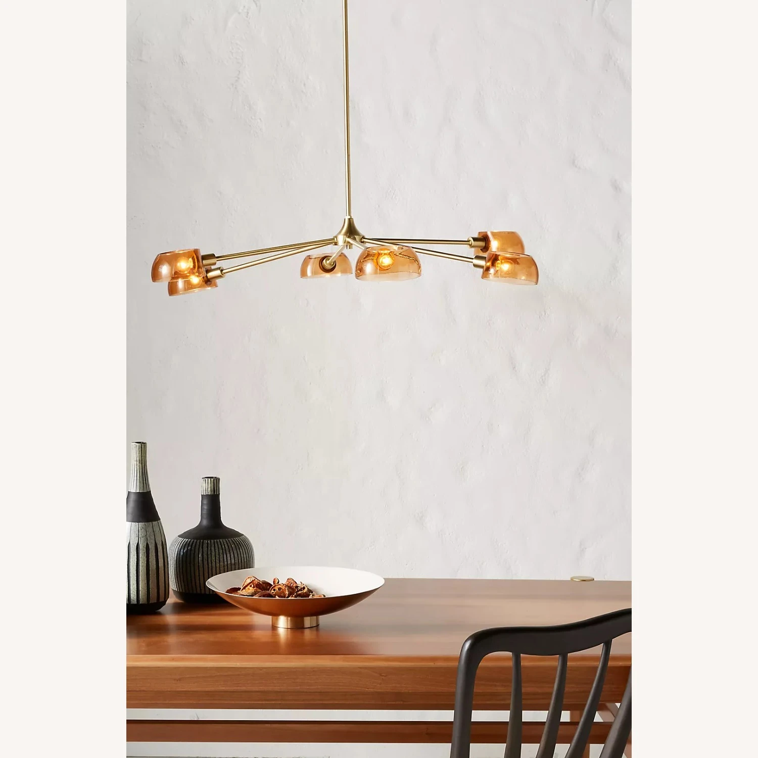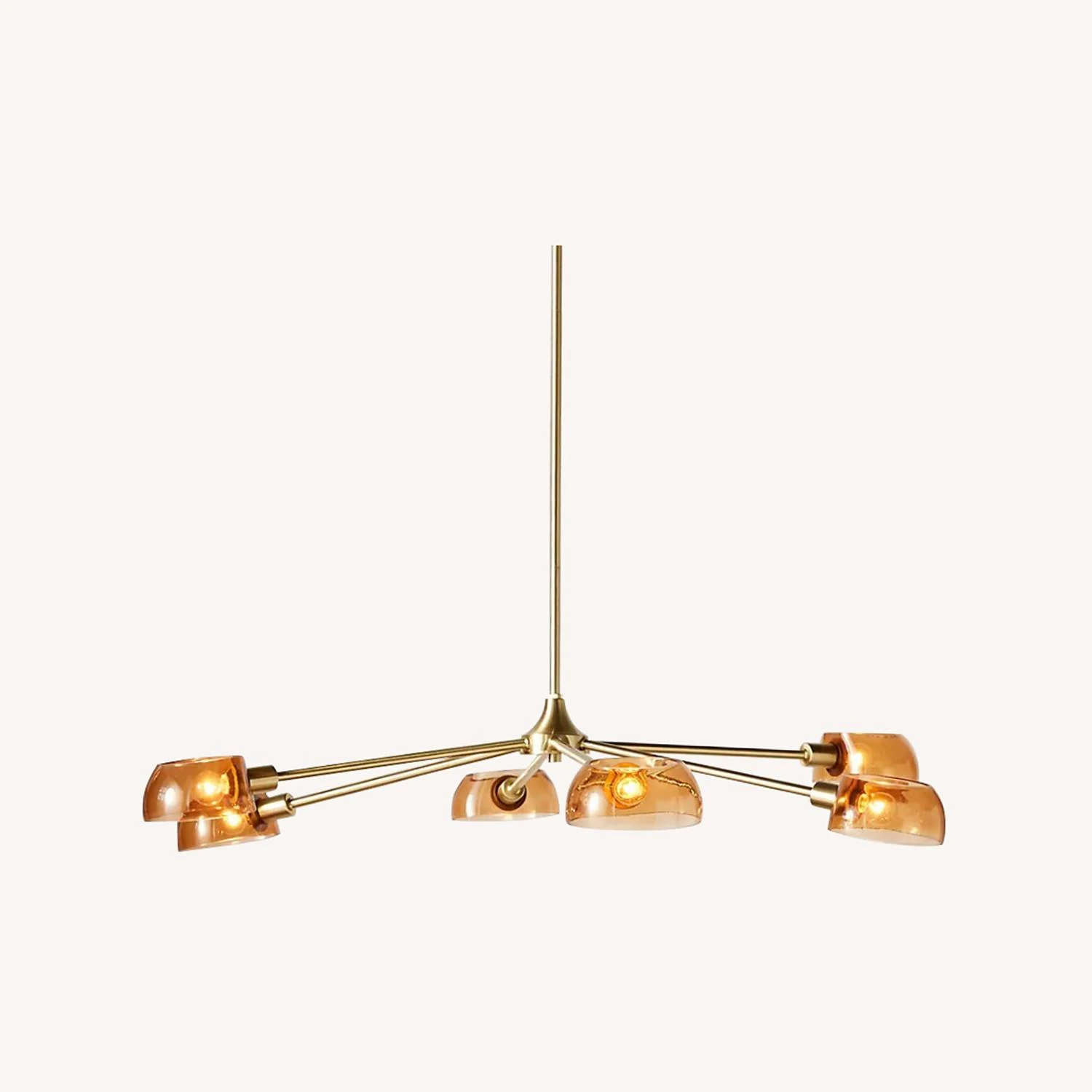 Seller’s Notes: Midcentury style chandelier with amber colored glass and a brushed brass finish. This is in excellent condition: no chips or cracks on the glass and no scuffs on the brass. Hanging height is 22.5″ from top of canopy, but there are two additional 12″ brass poles that screw in to allow for longer hanging height – 34.5″ or 46.5″ respectively. Diameter approximately 42″ at widest point. Canopy is 6″ across