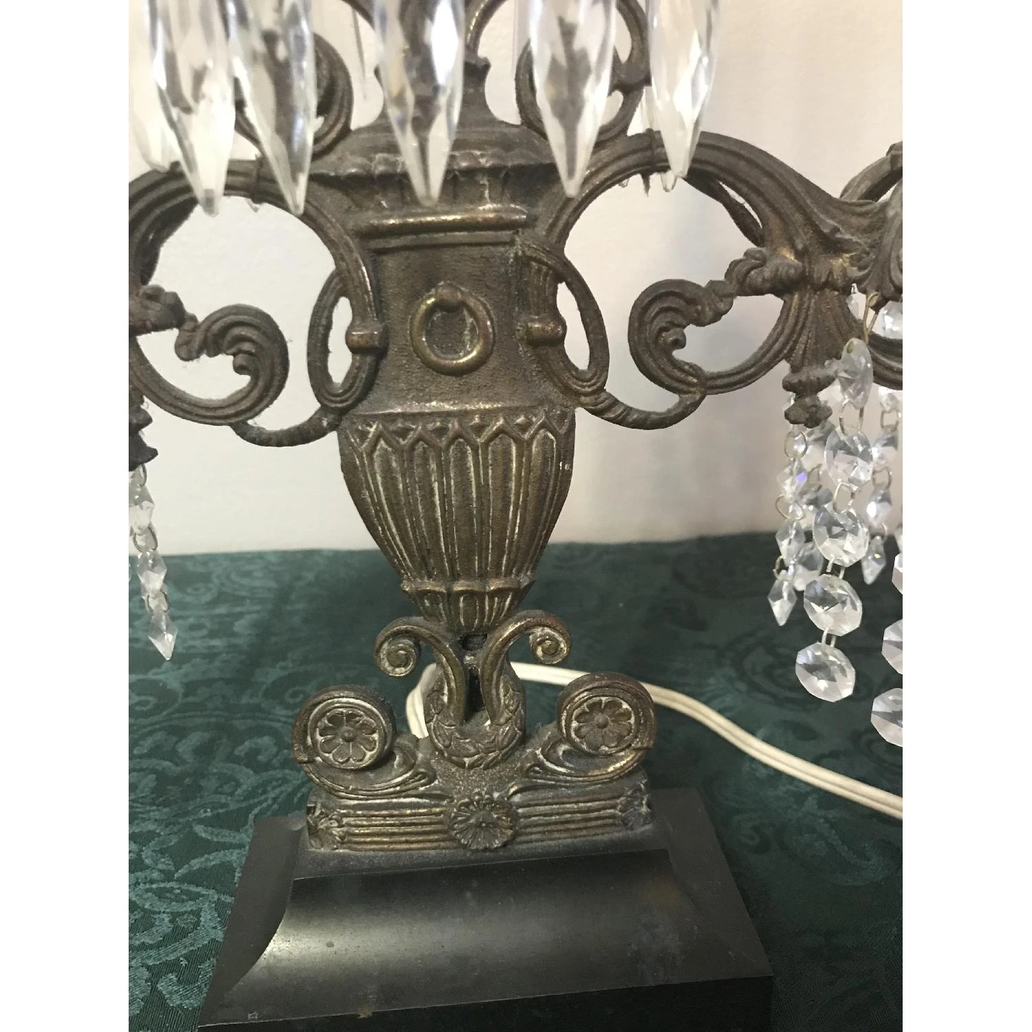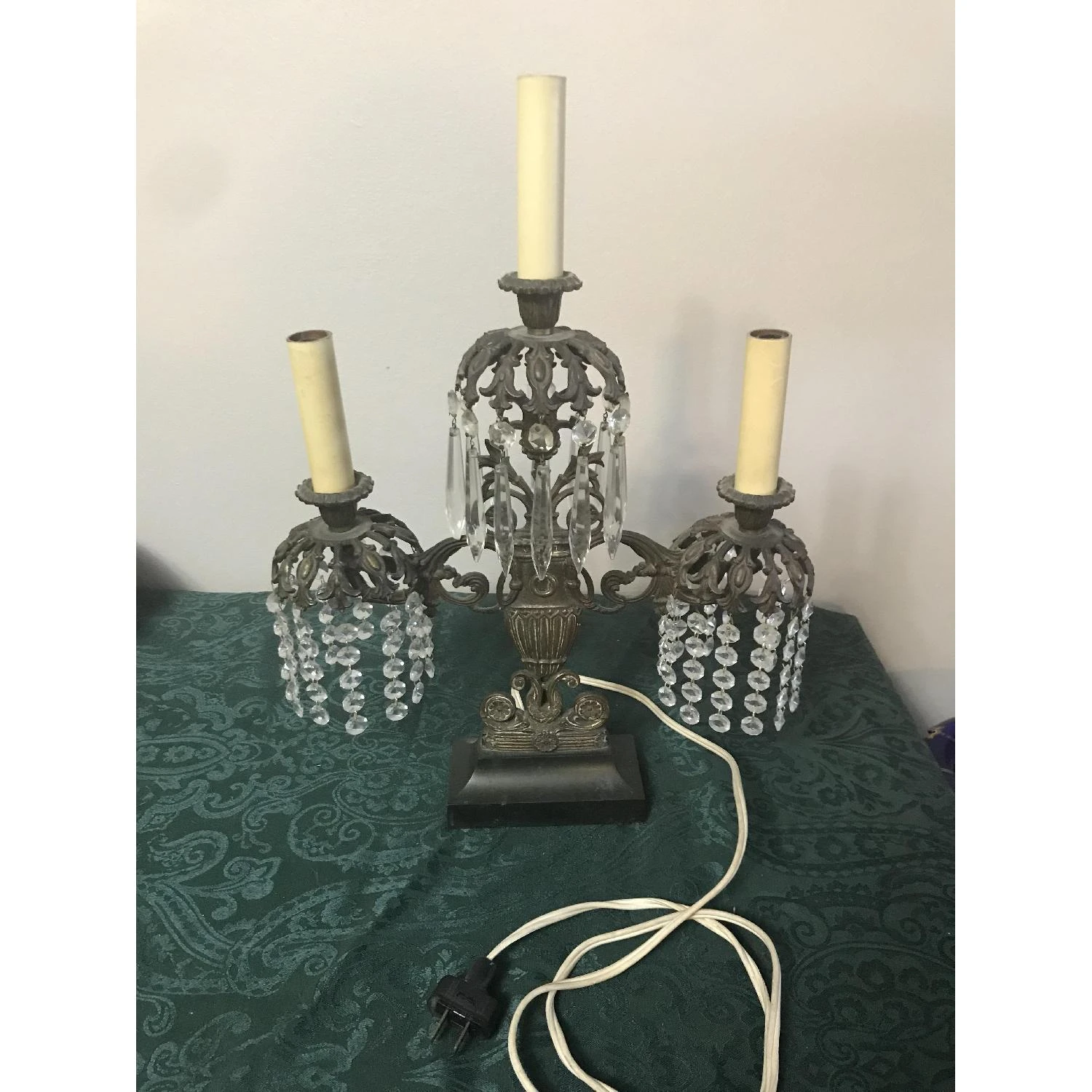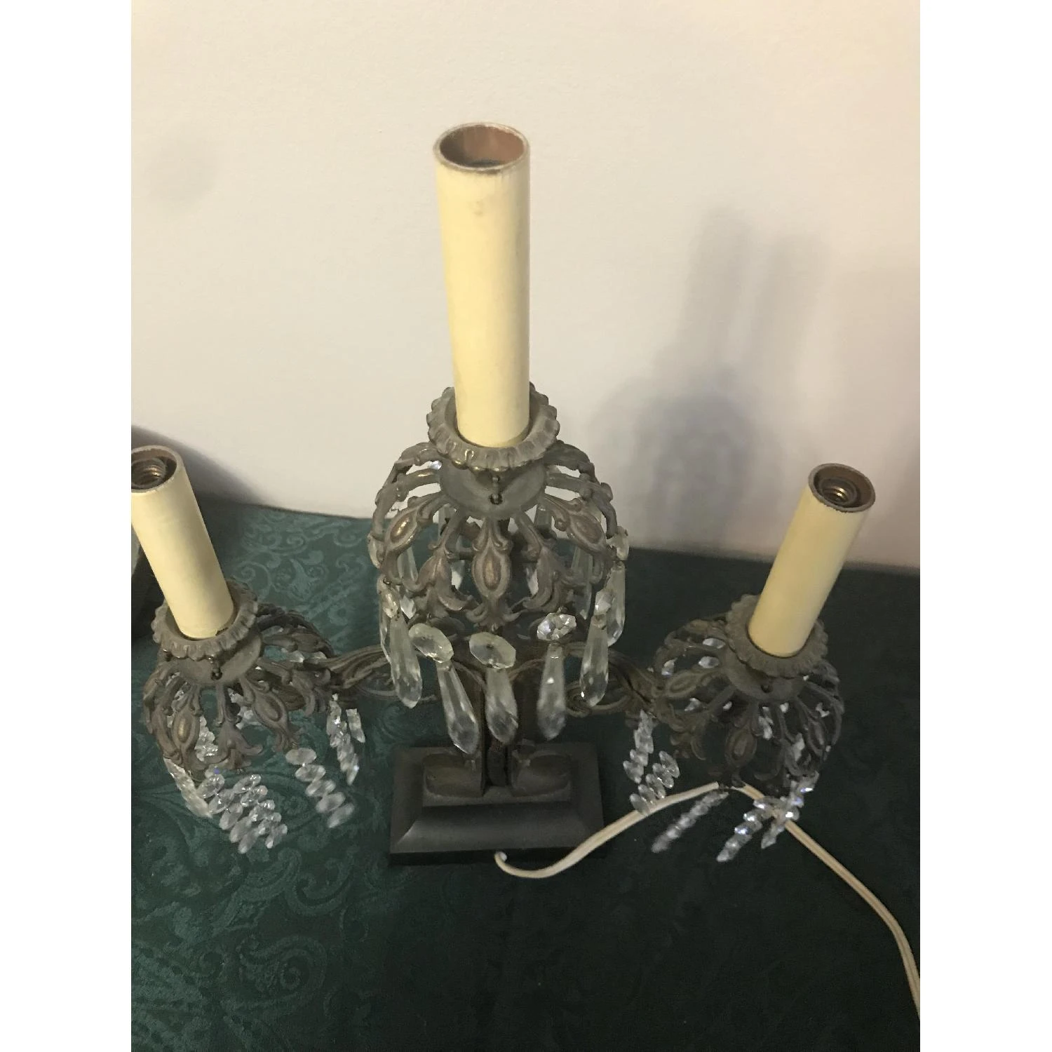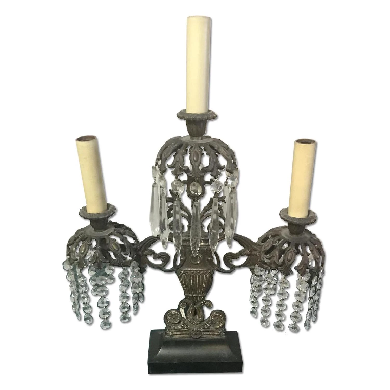 Seller’s Notes: This three-arm Victorian candelabra is a beautiful addition to your mantle or side table. All of the crystal prisms are present and in great condition. There are few to no visible scratches or blemishes. The piece measures 18″ to the top of the highest socket and 13″ to the other two. It is 13″ wide and the heavy, rectangular iron base is 2.75″ x 5.5″.