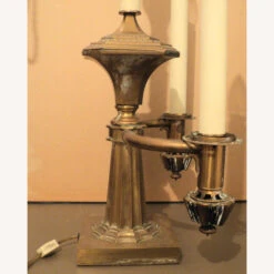 Seller’s Notes: Antique French Bouillotte Brass Table Lamp. Overall good condition commensurate with age and use. Can use a polishing. Looks like it’s missing some sort of element that screws on the two candle arms. Also missing the little knob to turn on the light at the top. See pics. At the bottom of the two candle arms are knobs that turn on the smaller flame lights. They work fine but the light bulbs themselves are out. It’s solid brass, weighing around 13 pounds.