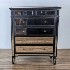 Seller’s Notes: Description: eminiscent of old Hollywood, the Isla Collection’s glamorous design is made using a combination of solid tulipwood and engineered hardwood. Drawer pulls and hardware are antiqued to accent the collection’s mirrored surfaces, which are antiqued with a silver leaf finish. . Brand: Arhaus. Retail price: $1899. Gently used – any blemishes or damage will be included in the photos. #SKU: 1053681. Tags: liquidation,wood,transitional,glass