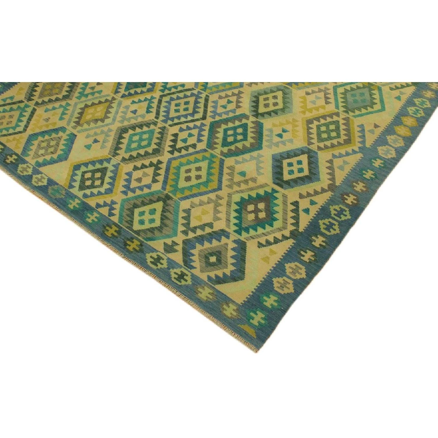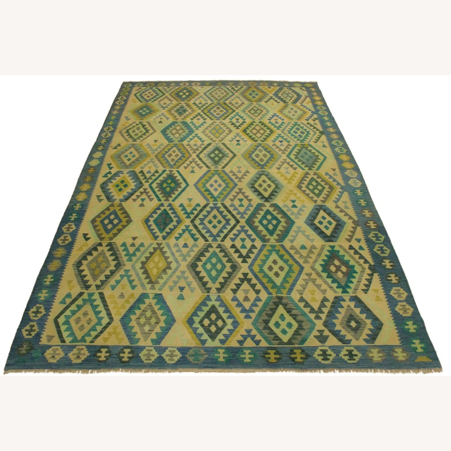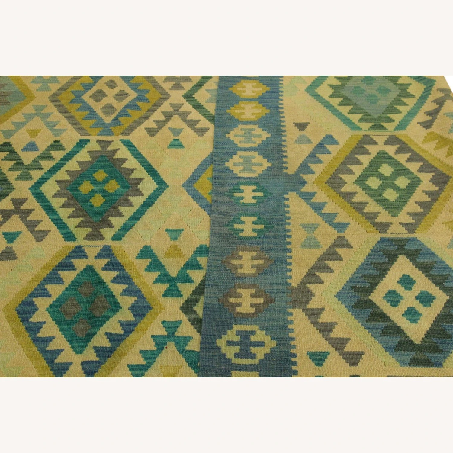 Seller’s Notes: “Add a touch of elegance to your home with this casual chic hand woven Tribal Kilim wool rug. Constructed on a loom by Nomad Turkman people with hand spun wool and 100% Natural Vegetable dyes these beautiful rugs are known for their beautiful repetitive geometric pattern with naturalistic floral and traditional patterns. The contemporary fashion palette produces bold, sharp patterns that are ingeniously versatile as the pattern is same in the front and back. These double sided rugs are designed to be used both ways being one side has light shade of color, rather the other side has brighter colors and can be used to preference. These beautiful rugs are made by individual short strands of different color being knotted onto the warps and held together by pressing the wefts tightly. The designs are made by interweaving the variously colored wefts and warps.