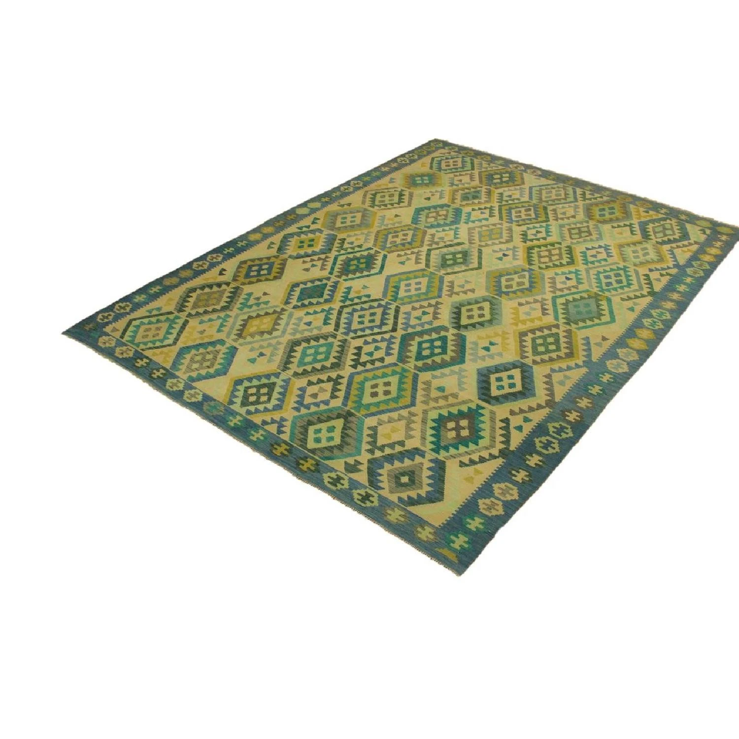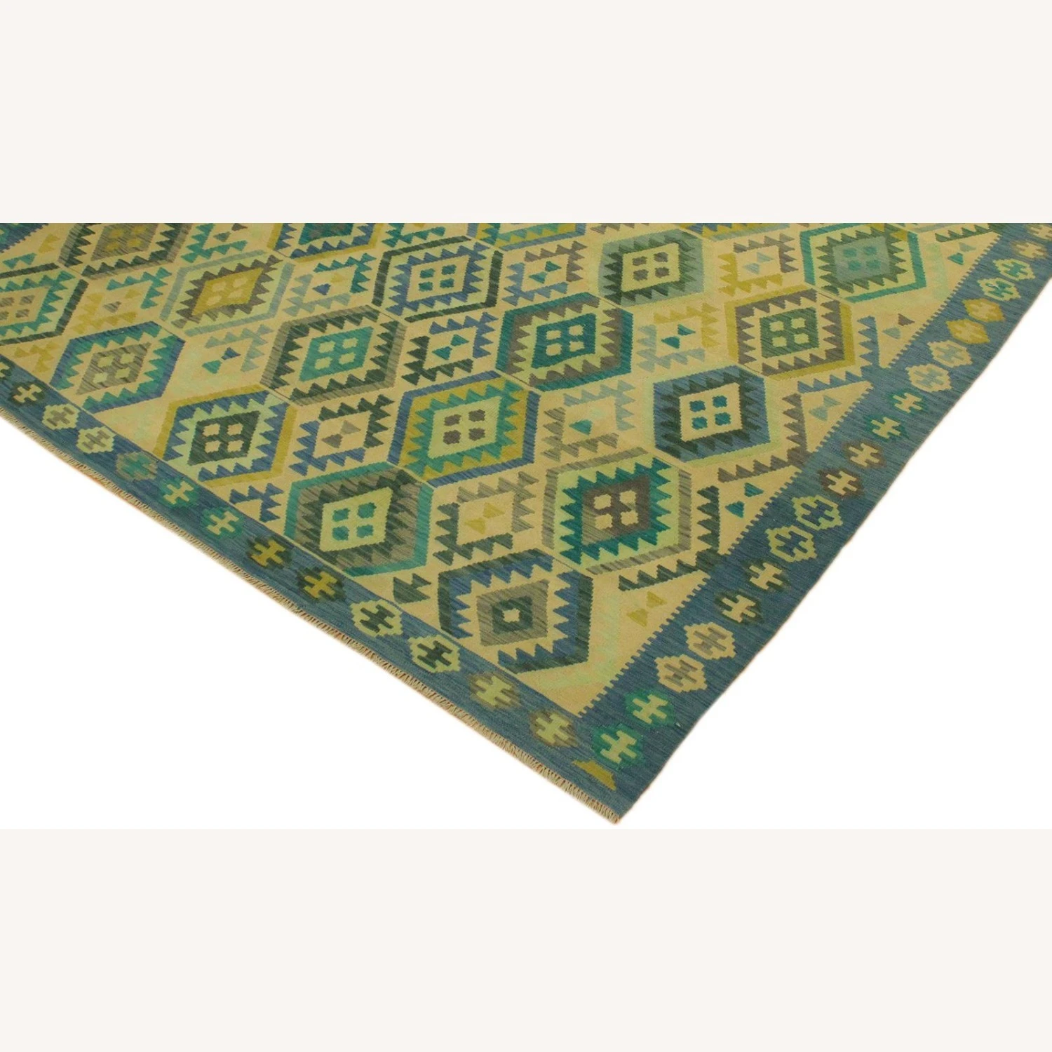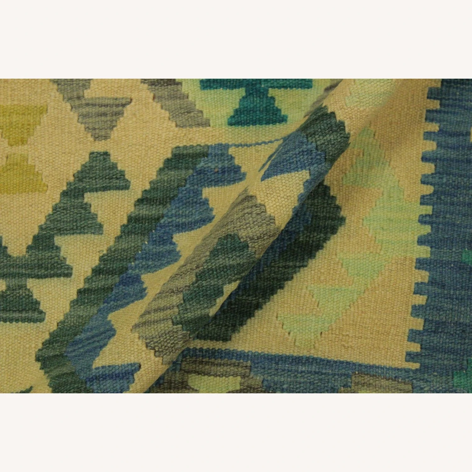 Seller’s Notes: “Add a touch of elegance to your home with this casual chic hand woven Tribal Kilim wool rug. Constructed on a loom by Nomad Turkman people with hand spun wool and 100% Natural Vegetable dyes these beautiful rugs are known for their beautiful repetitive geometric pattern with naturalistic floral and traditional patterns. The contemporary fashion palette produces bold, sharp patterns that are ingeniously versatile as the pattern is same in the front and back. These double sided rugs are designed to be used both ways being one side has light shade of color, rather the other side has brighter colors and can be used to preference. These beautiful rugs are made by individual short strands of different color being knotted onto the warps and held together by pressing the wefts tightly. The designs are made by interweaving the variously colored wefts and warps.