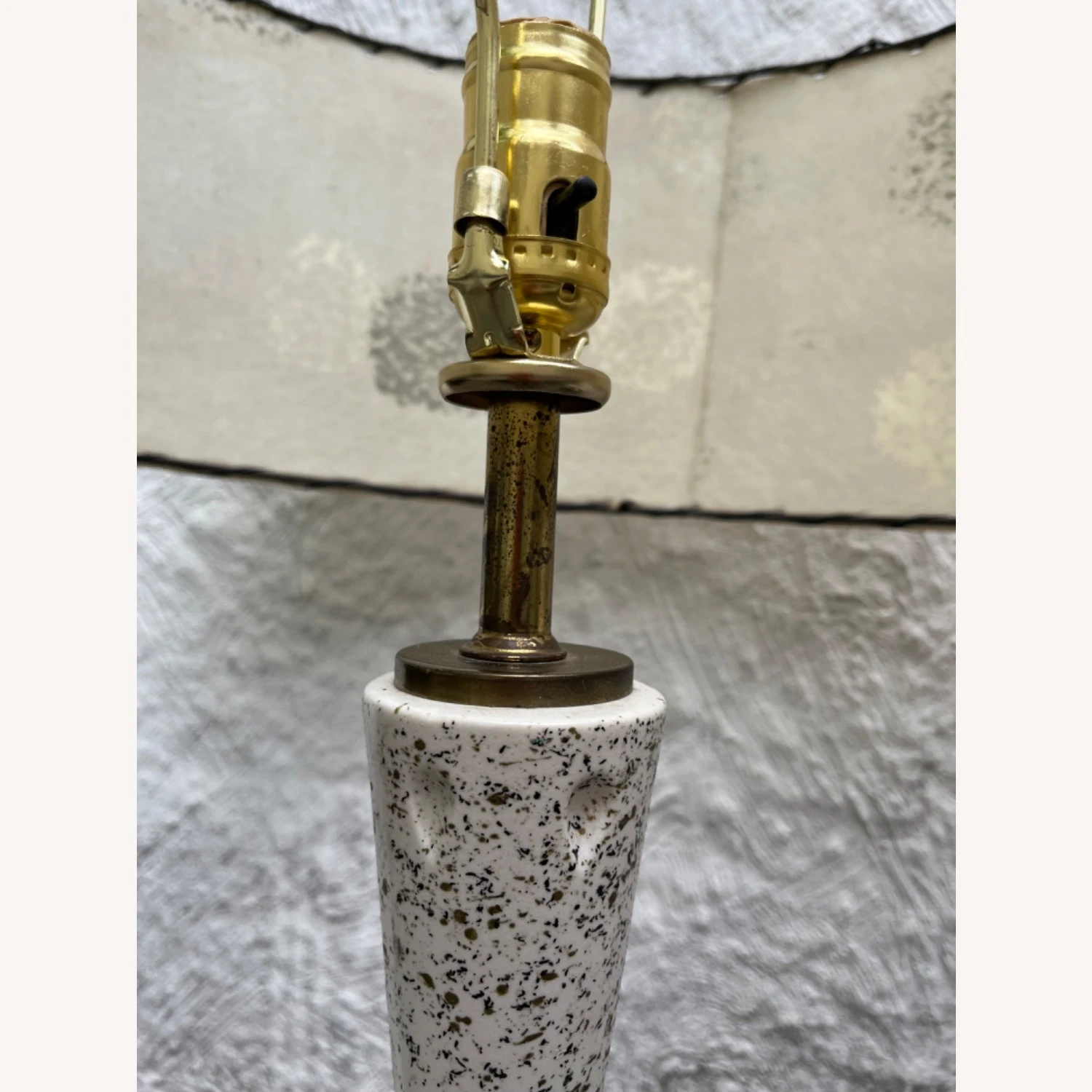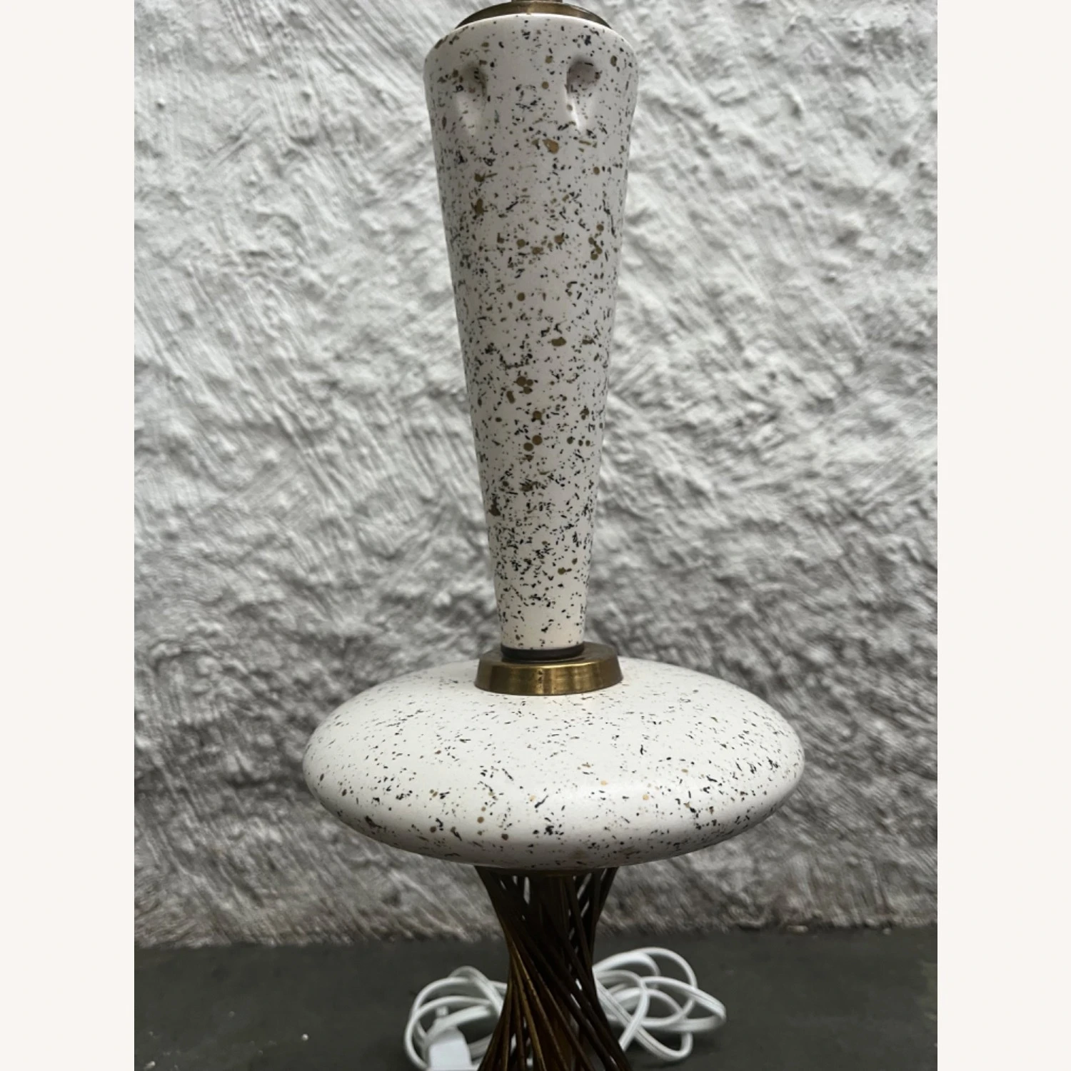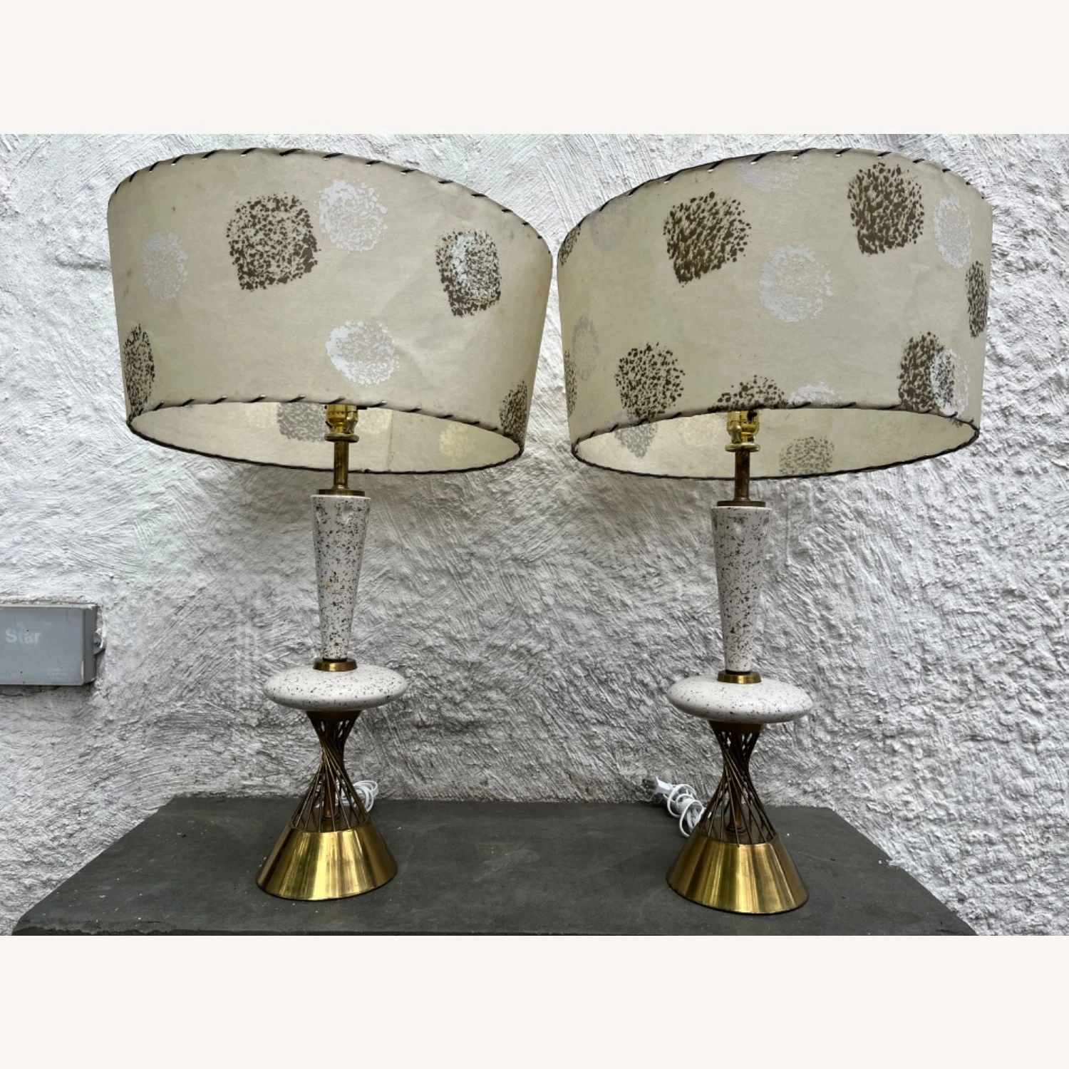 Seller’s Notes: Pair of vintage mid century modern atomic style lamps with original parchment shades. The lamps are brass and ceramic with gold and black specks on the surface of the ceramic portion of the lamps.