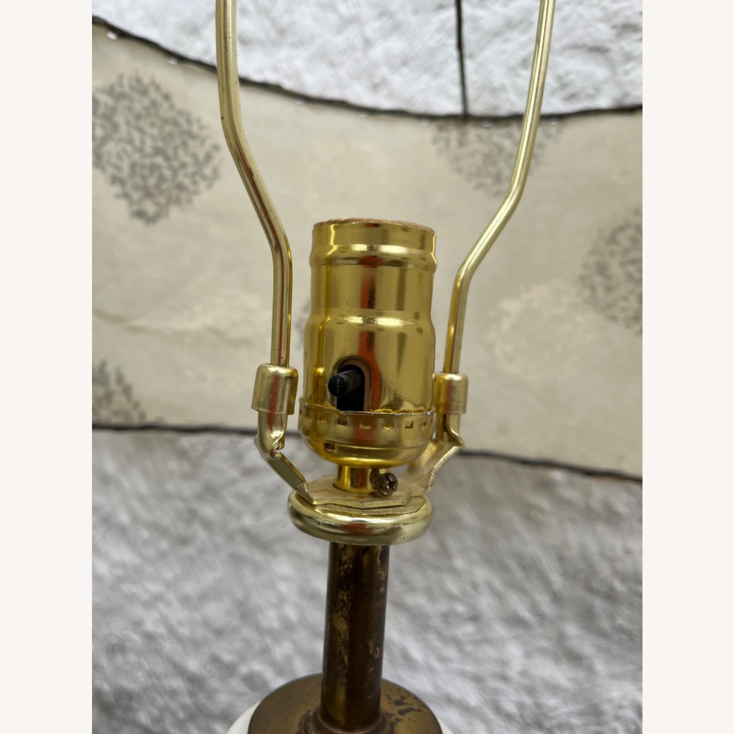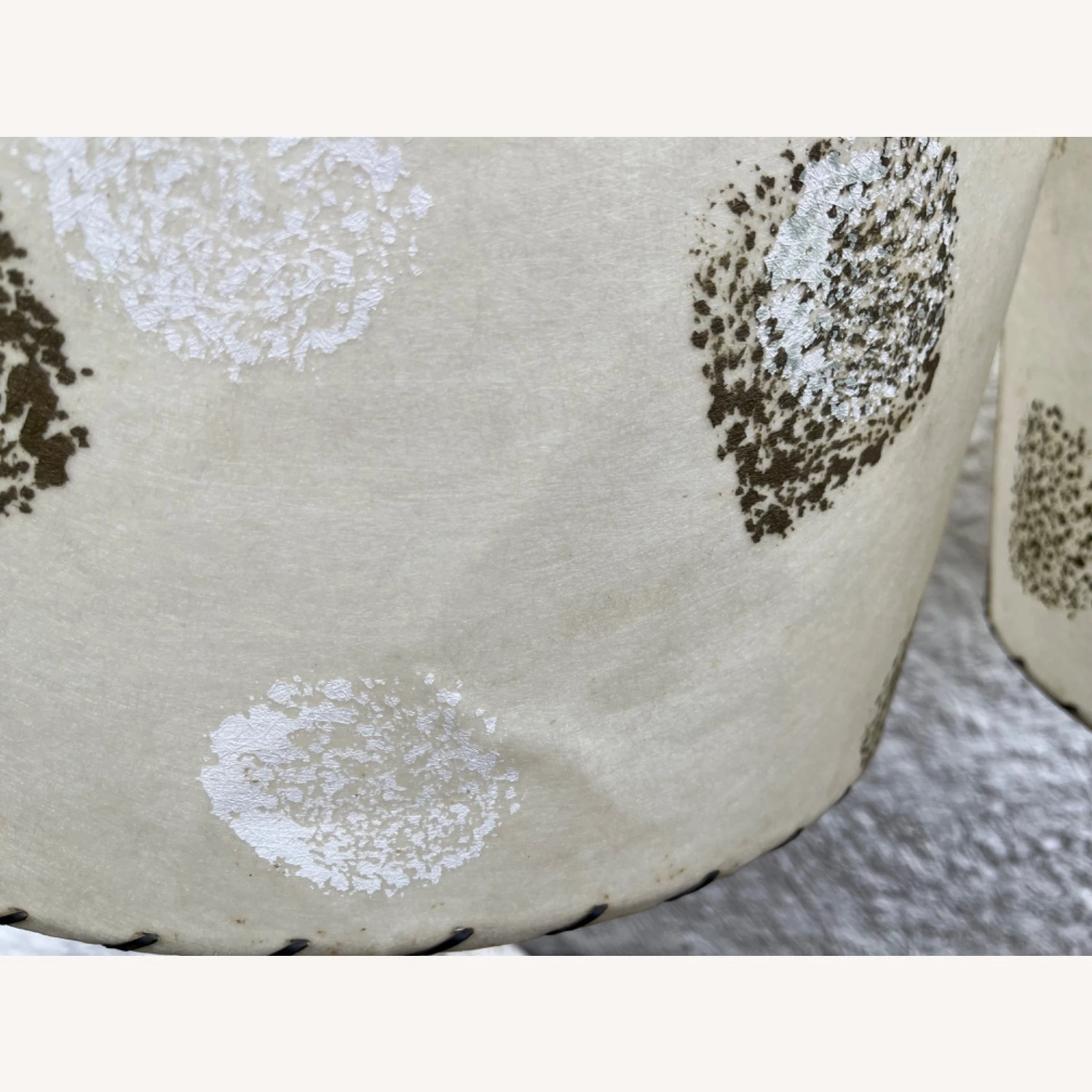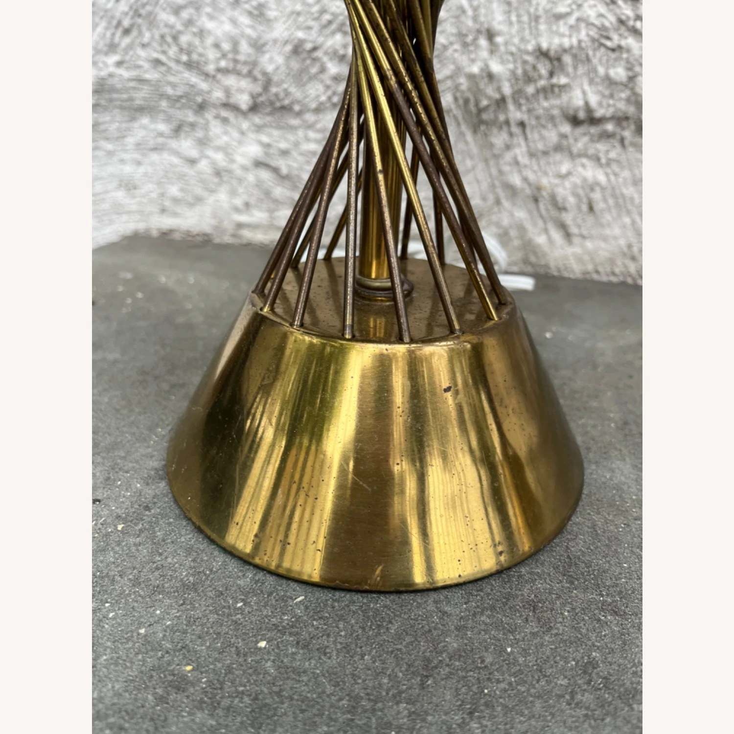 Seller’s Notes: Pair of vintage mid century modern atomic style lamps with original parchment shades. The lamps are brass and ceramic with gold and black specks on the surface of the ceramic portion of the lamps.