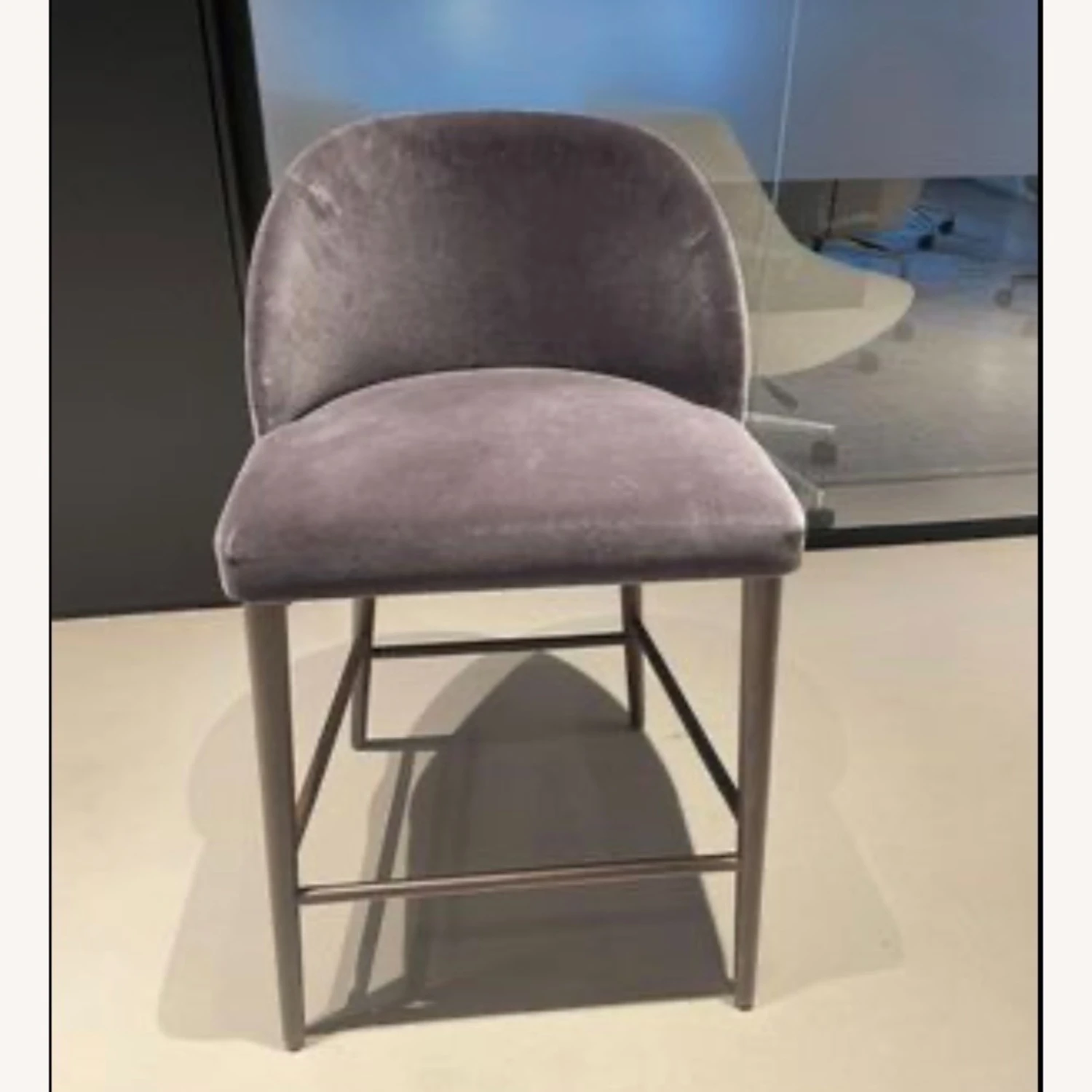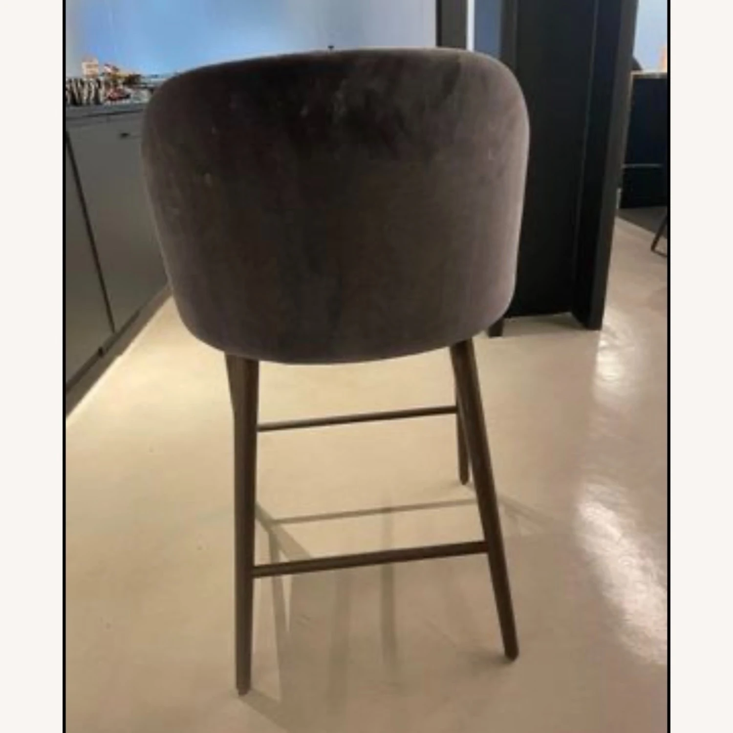 Clad in soft, livable velvet, our Italian-made Camille counter stool embraces with petal-shaped curves and a comfortable, linger-worthy seat. Turned, solid beech legs are stained dark charcoal to complement the dark grey upholstery. This Crate and Barrel exclusive brings modern charm to counter or high table dining.