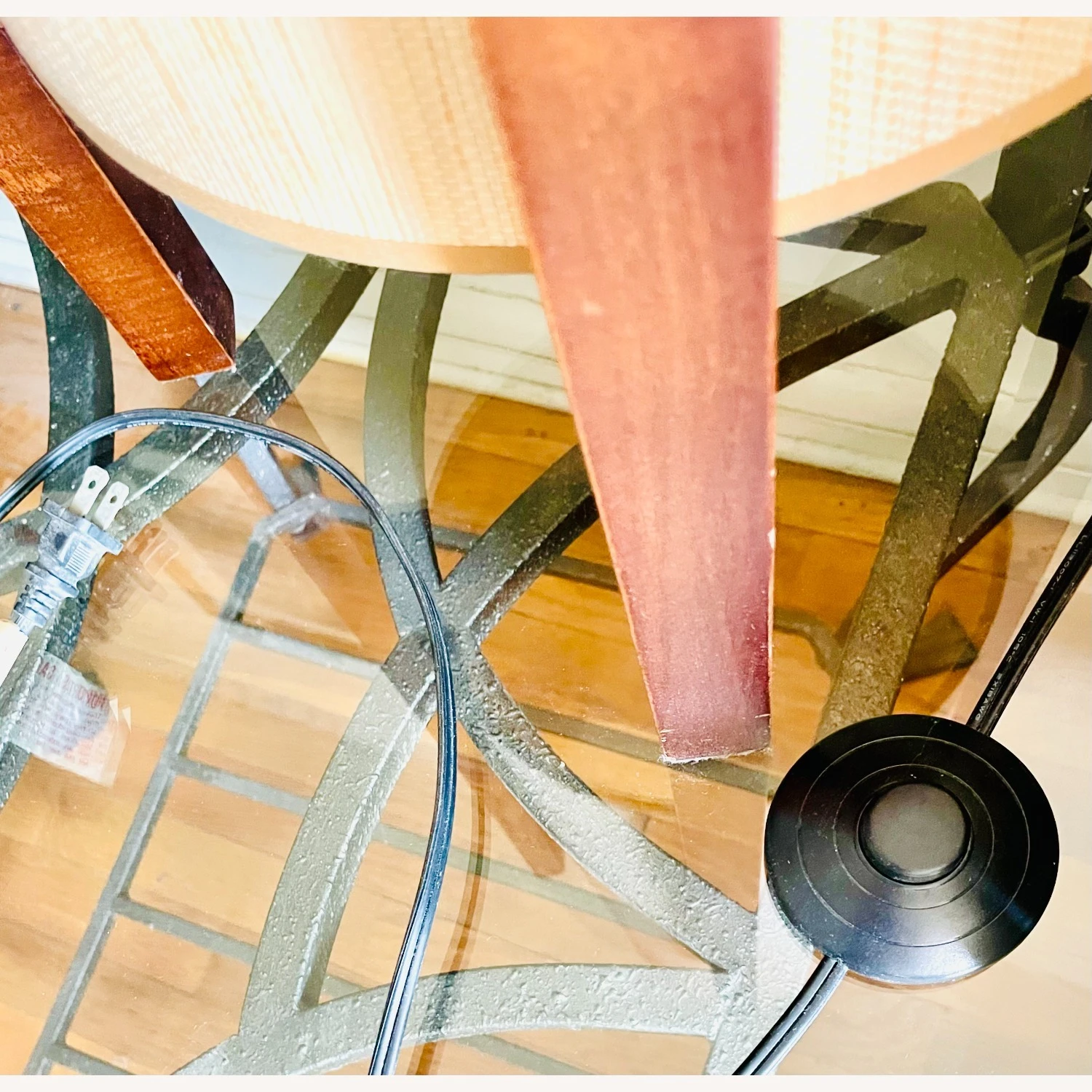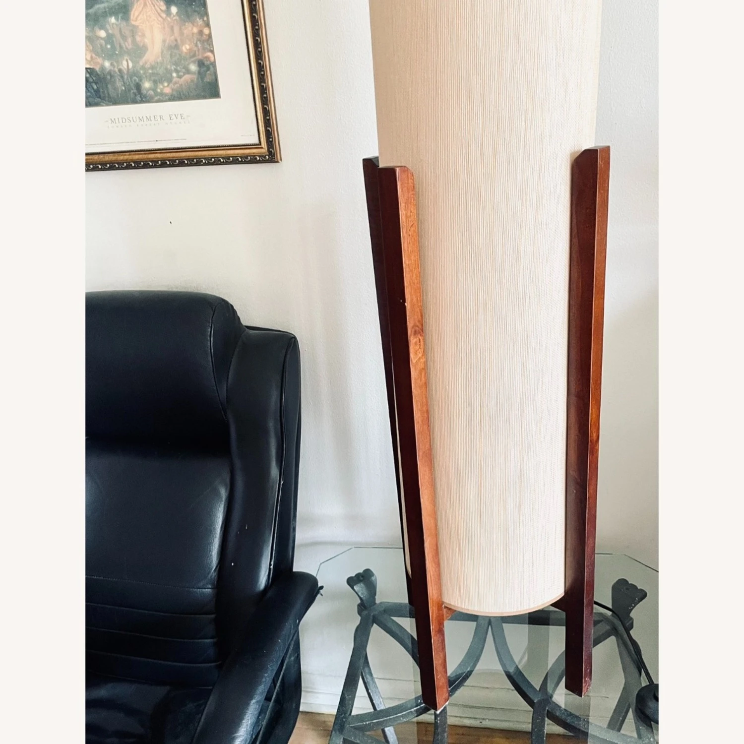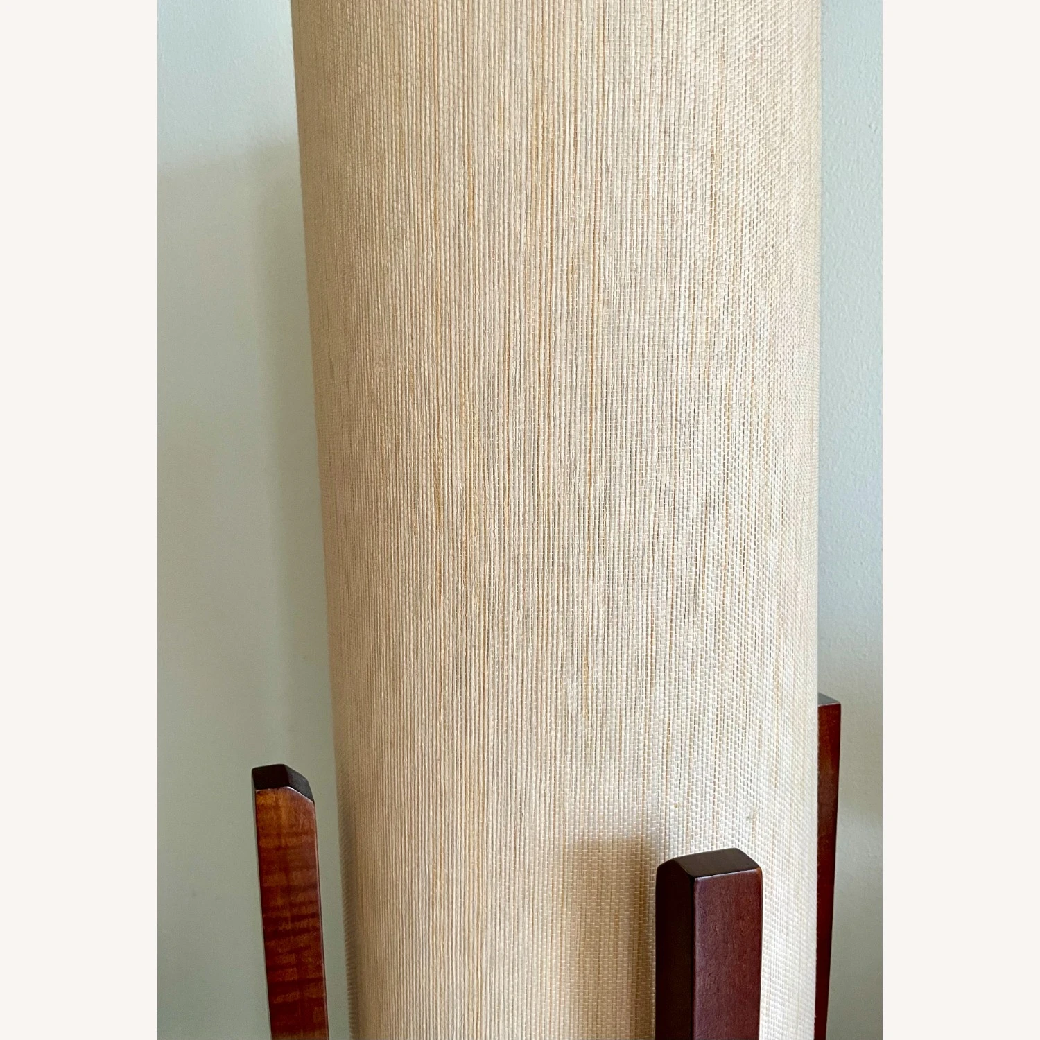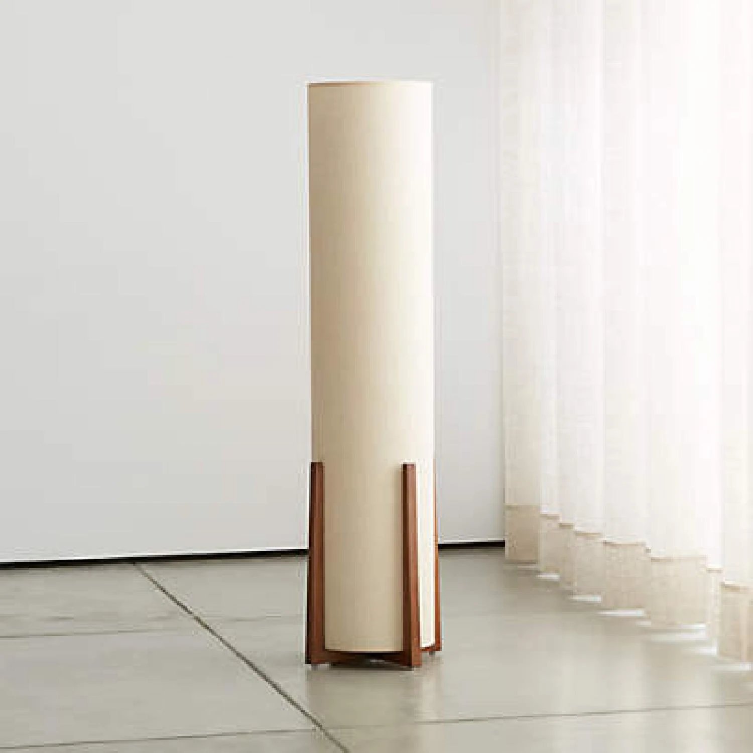 Contemporary with a nod to mid-century design, the lamp elevates the shade on a four-arm wood stand finished in a complementary shade of dark, cherry brown. You’ll love the way the weave lamp warms up a neglected corner, with its soft glow and striking sculptural form. WOW! A black cord and on-off line switch stay out of view, so as not to detract from the lamp’s eye-catching silhouette. THIS model, though they sell a slightly different one now, was discontinued at Crate & Barrel. It was a vintage replicate that they sold during the early 2000s.