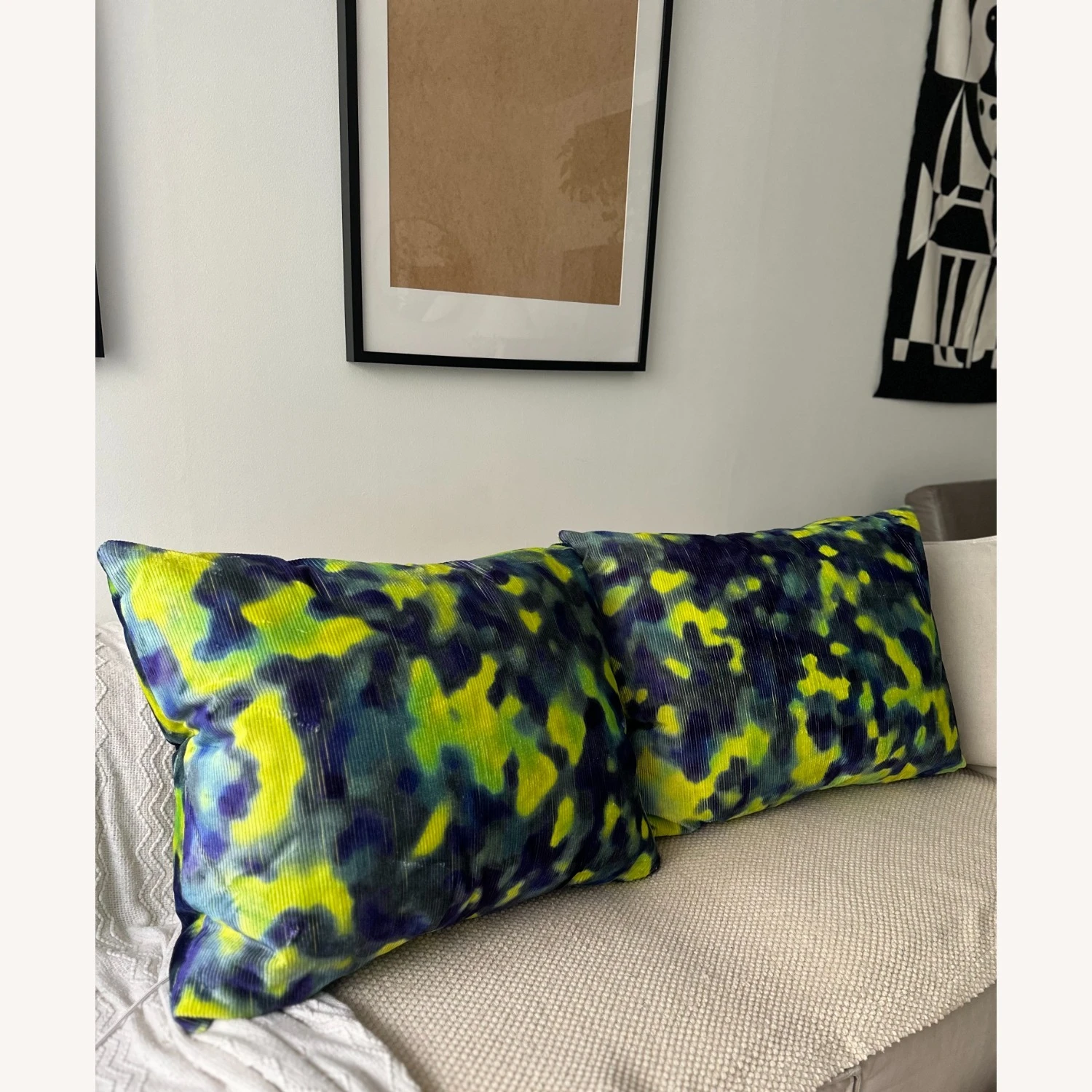Seller’s Notes: Two unique custom-made throw pillows in Knoll Textile Floressence velvet fabric, color Monarch. Made in the USA, knife-edge construction, and invisible zipper closure. Non-engineered, random pattern placement across the front and back. Removable indoor/outdoor pillow insert included. Made of 100% plush poly with poly/cotton woven cover.