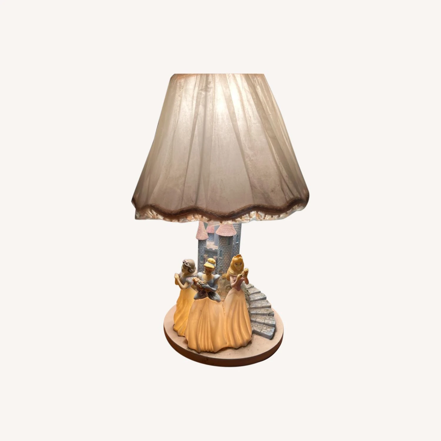 Seller’s Notes: Like new. Shade cover still intact over original pink shade. Really sweet and vintage looking. Snow White, Cinderella, and another fairy (? Name). Nice addition to girl’s bedroom.