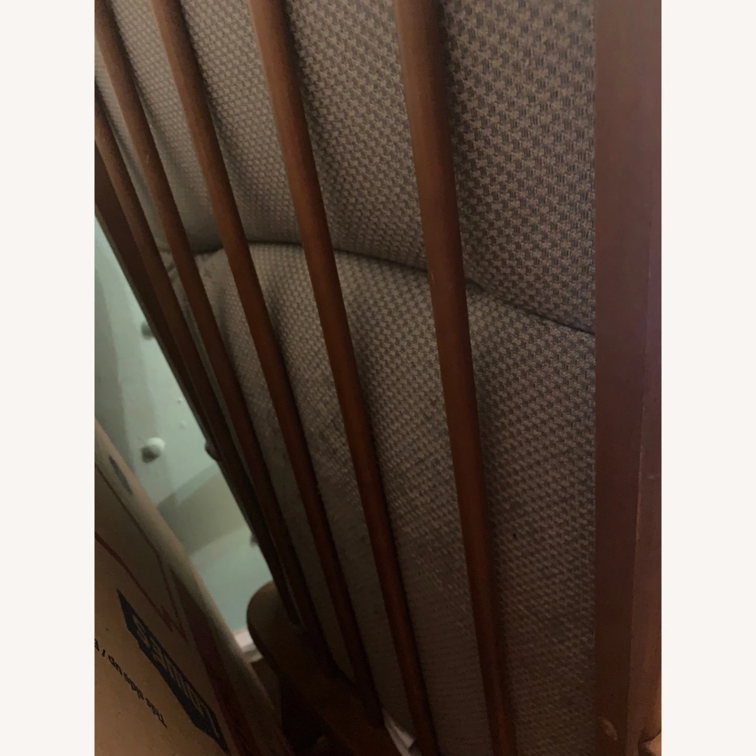 Seller’s Notes: Oak gliding chair and ottoman with green and grey check upholstery. It’s the original brand and style of these nursery gliders.