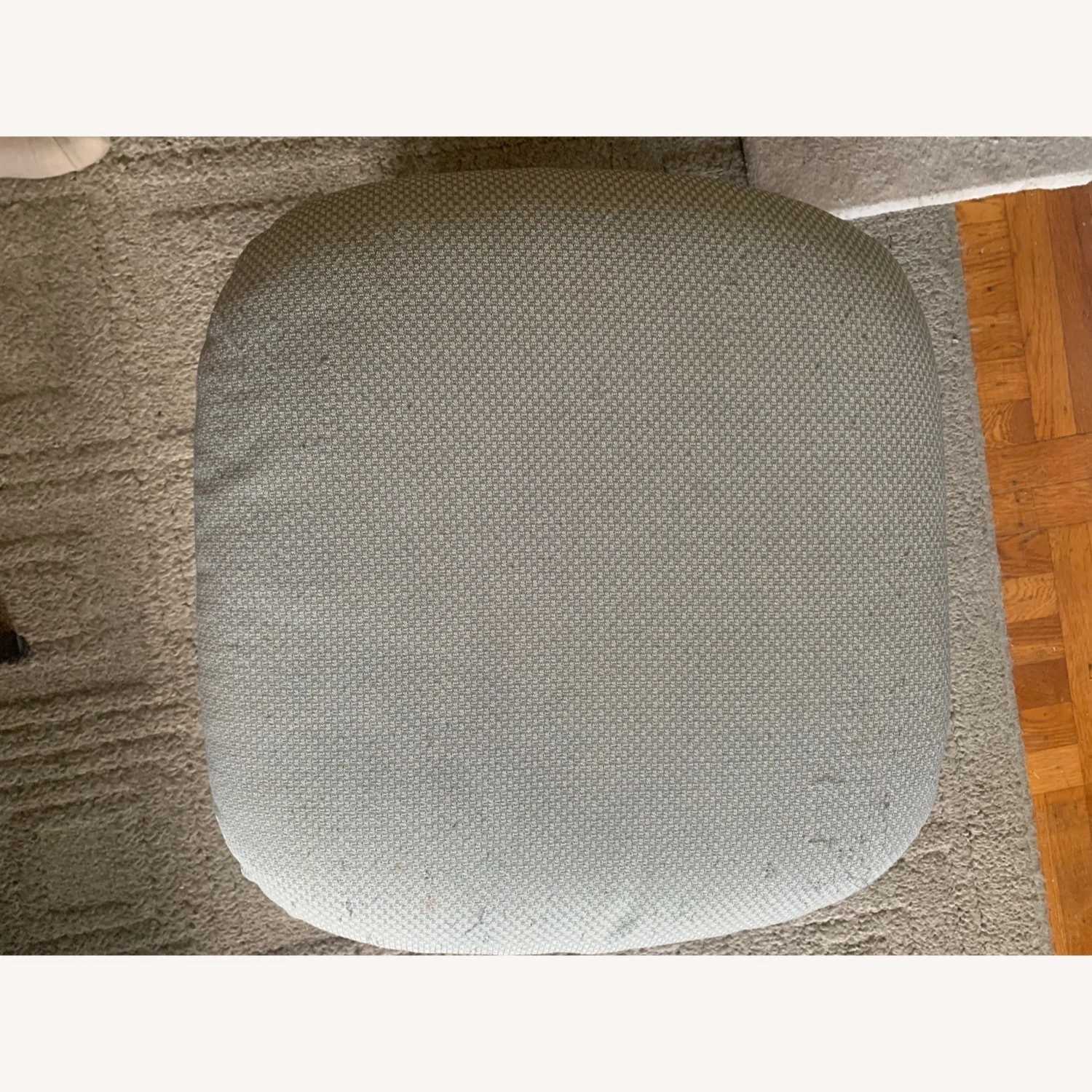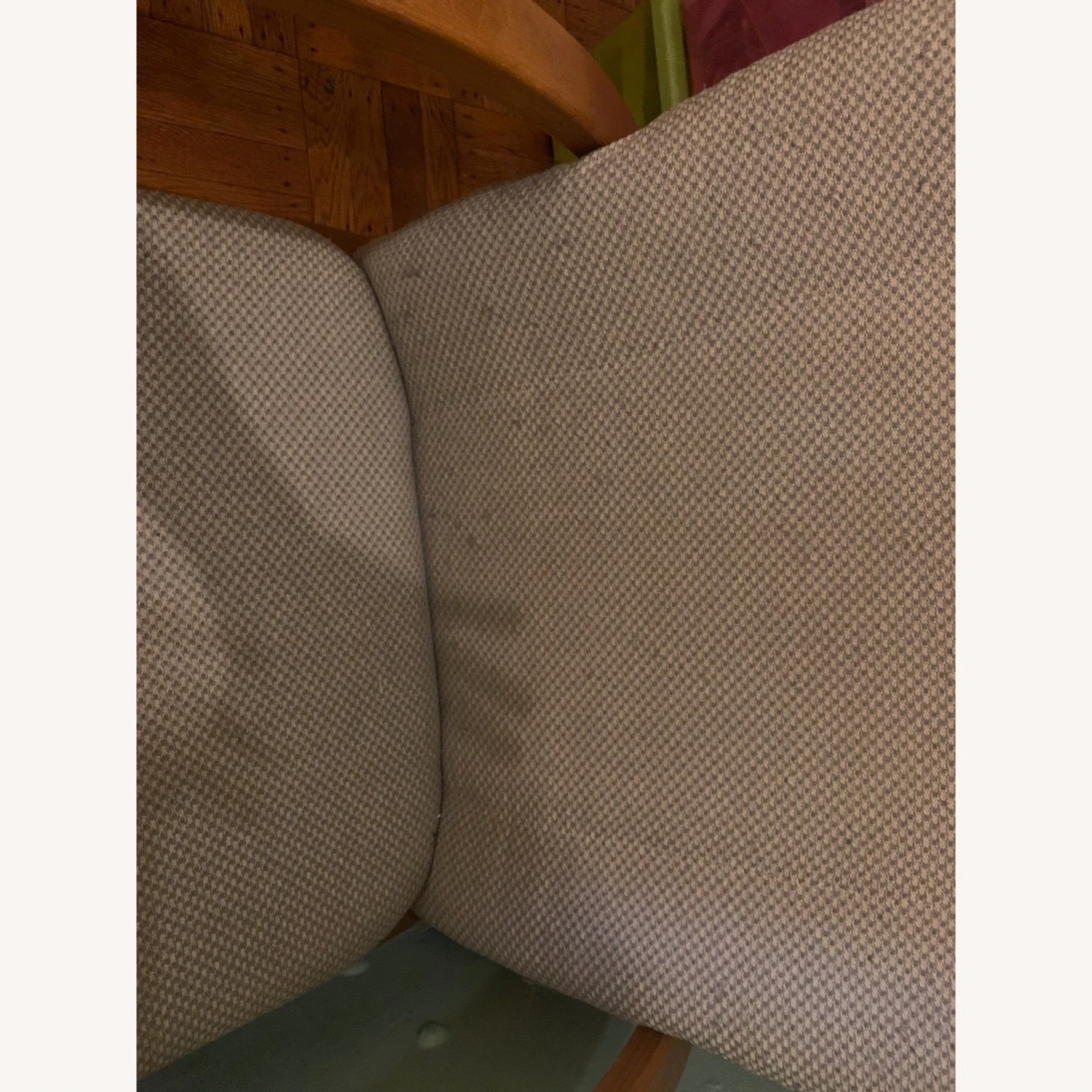 The chair itself is in very good condition. I’m selling it for less because our cat plucked the fabric on the back and a small amount elsewhere. It looks decent just the way it is since you don’t really see the back (you can re-upholster or replace the cushions inexpensively). We do have the arm cushions, just not attached. It’s very comfy, quiet glider.