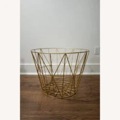 Seller’s Notes: Large, brass-colored basket. Can also be used as the base for a side or end table.