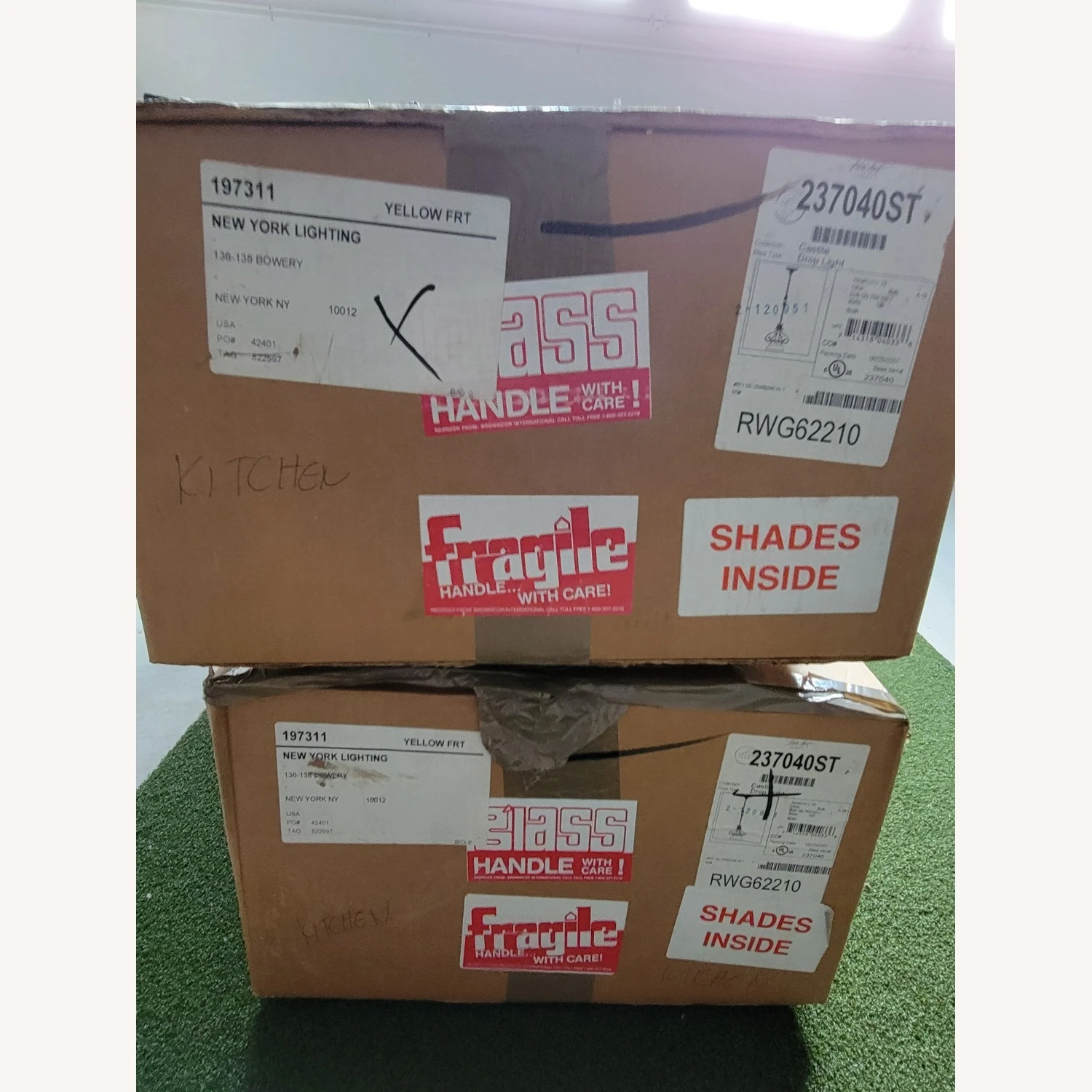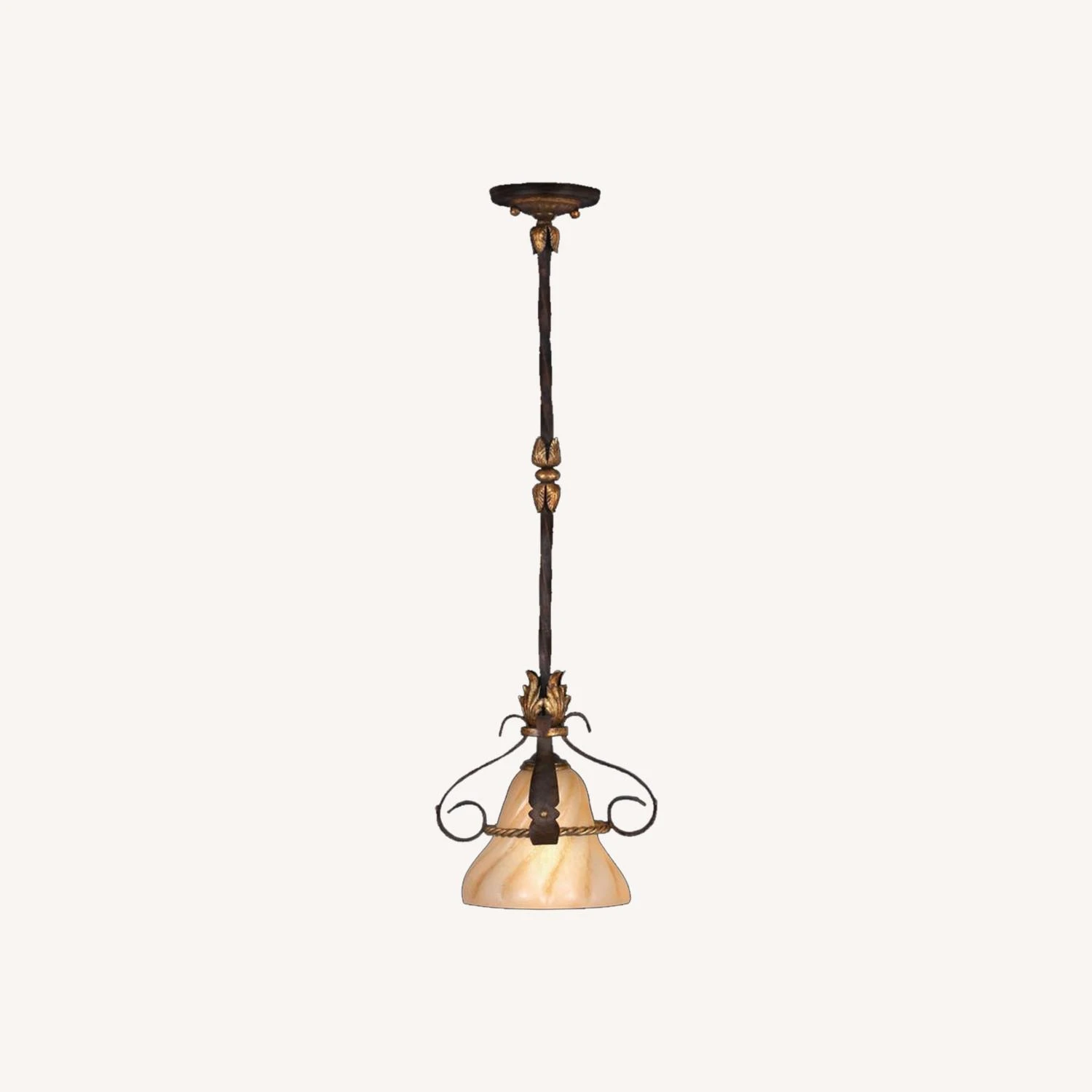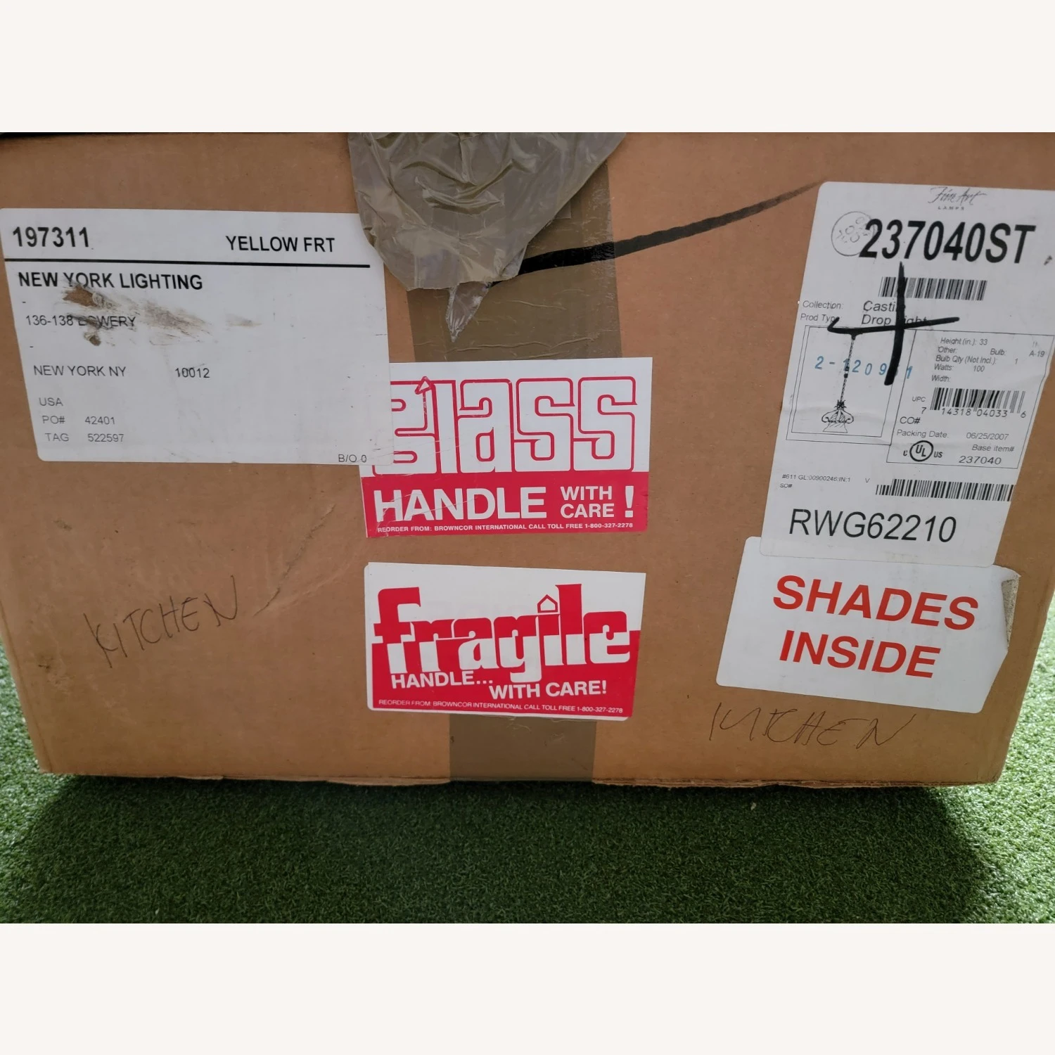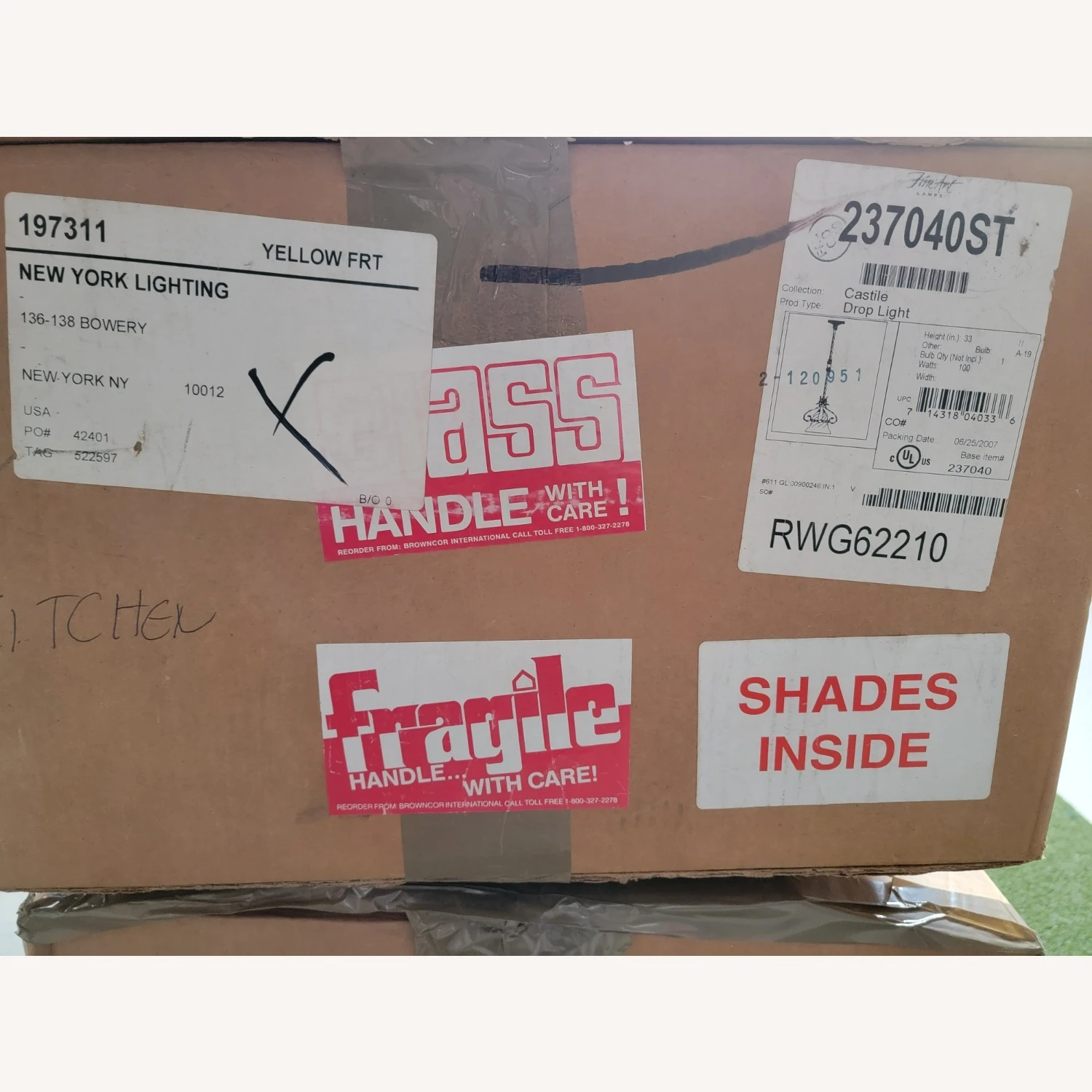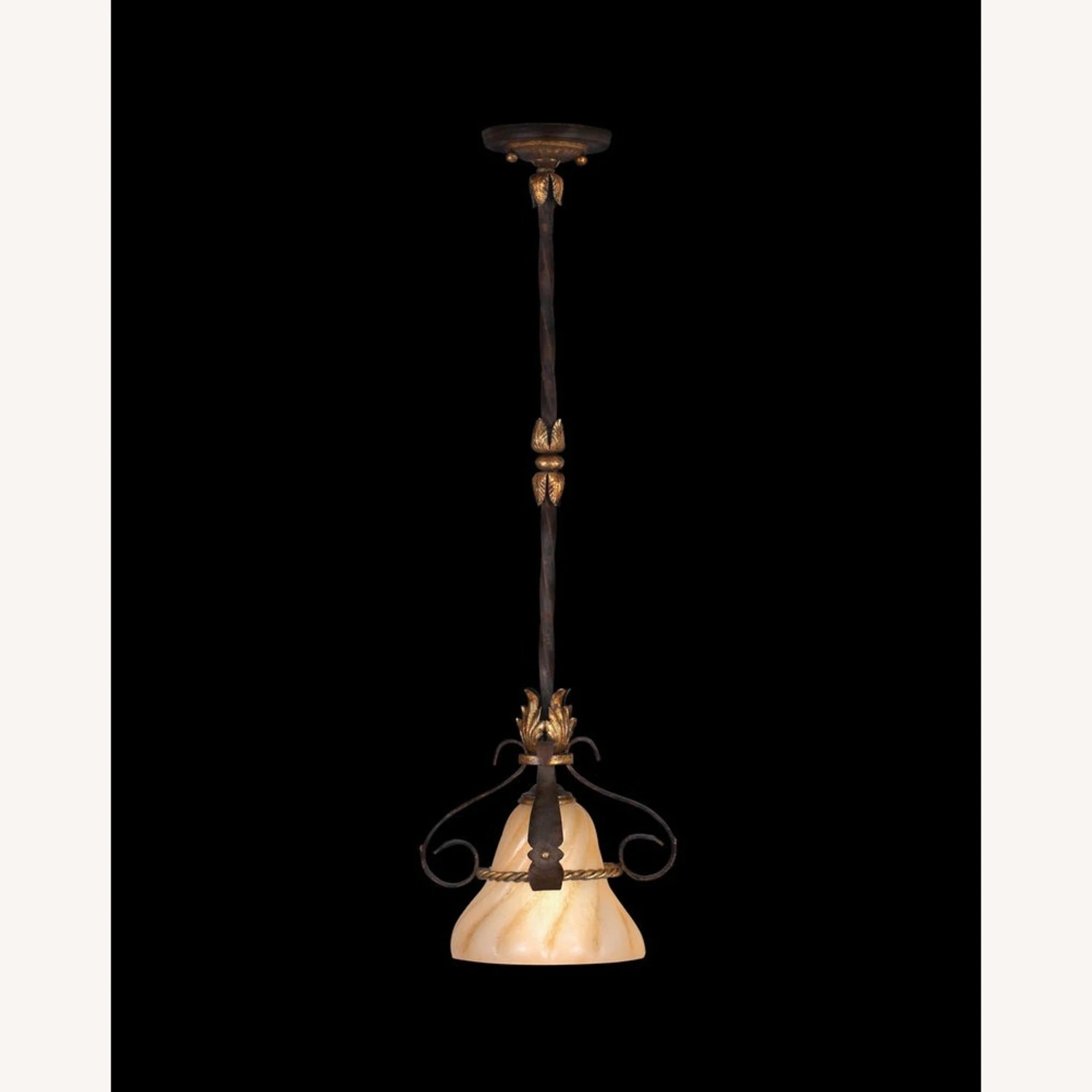 Seller’s Notes: Fine Art Lamps 237040ST drop light is from the Castile collection and measures 33H x 11W inches. We have 2 of the same. It uses (1) 100 watt medium base bulbs. The socket type is porcelain. This drop light weighs 5 pounds. For international 220 Volt application, the 237040ST drop light measures 83.82H x 27.94W cm. It uses (1) 100 watt medium base bulbs. The socket type is porcelain. This drop light weighs 2.27 kilograms. Drop light in antiqued iron and warm gold leaf finish. Features gold dusted hand blown glass. May hang from a ceiling at a 45o angle.