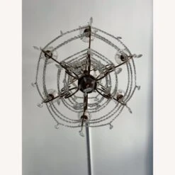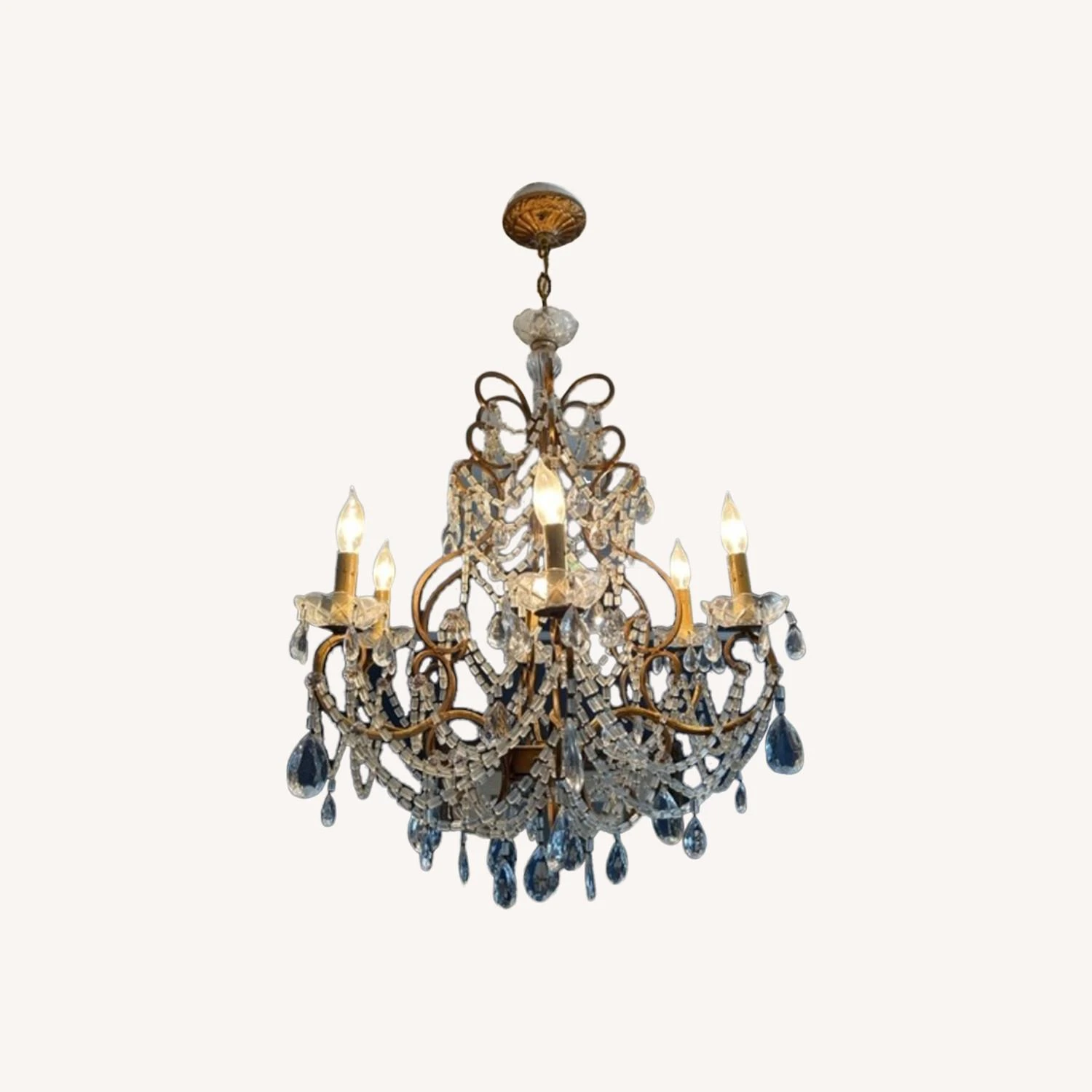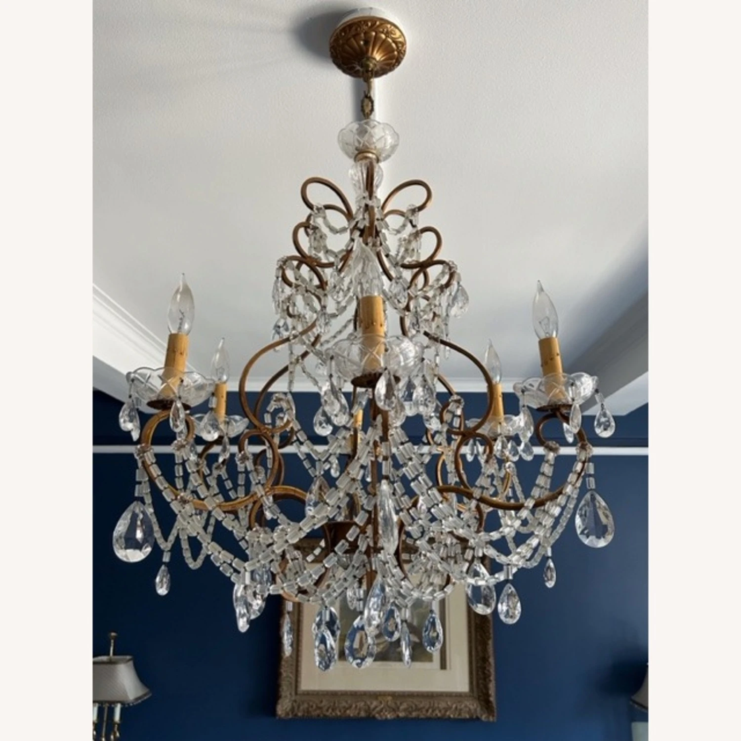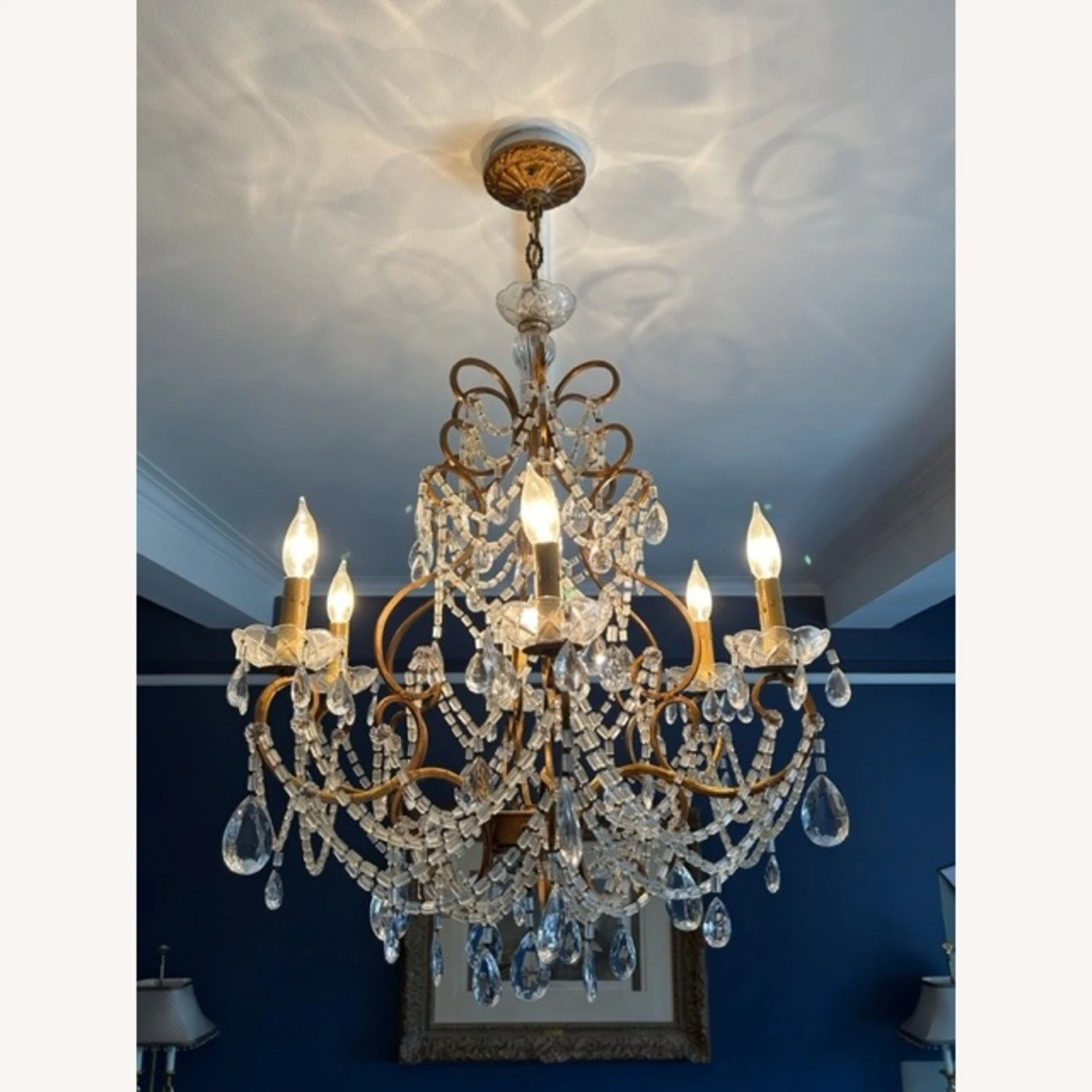 Seller’s Notes: Lovely Italianate/French-style chandelier, completely intact (including ceiling rose) and in perfect working order. Appears to be gilded iron and crystal and/or faceted glass. Age, manufacturer unknown.