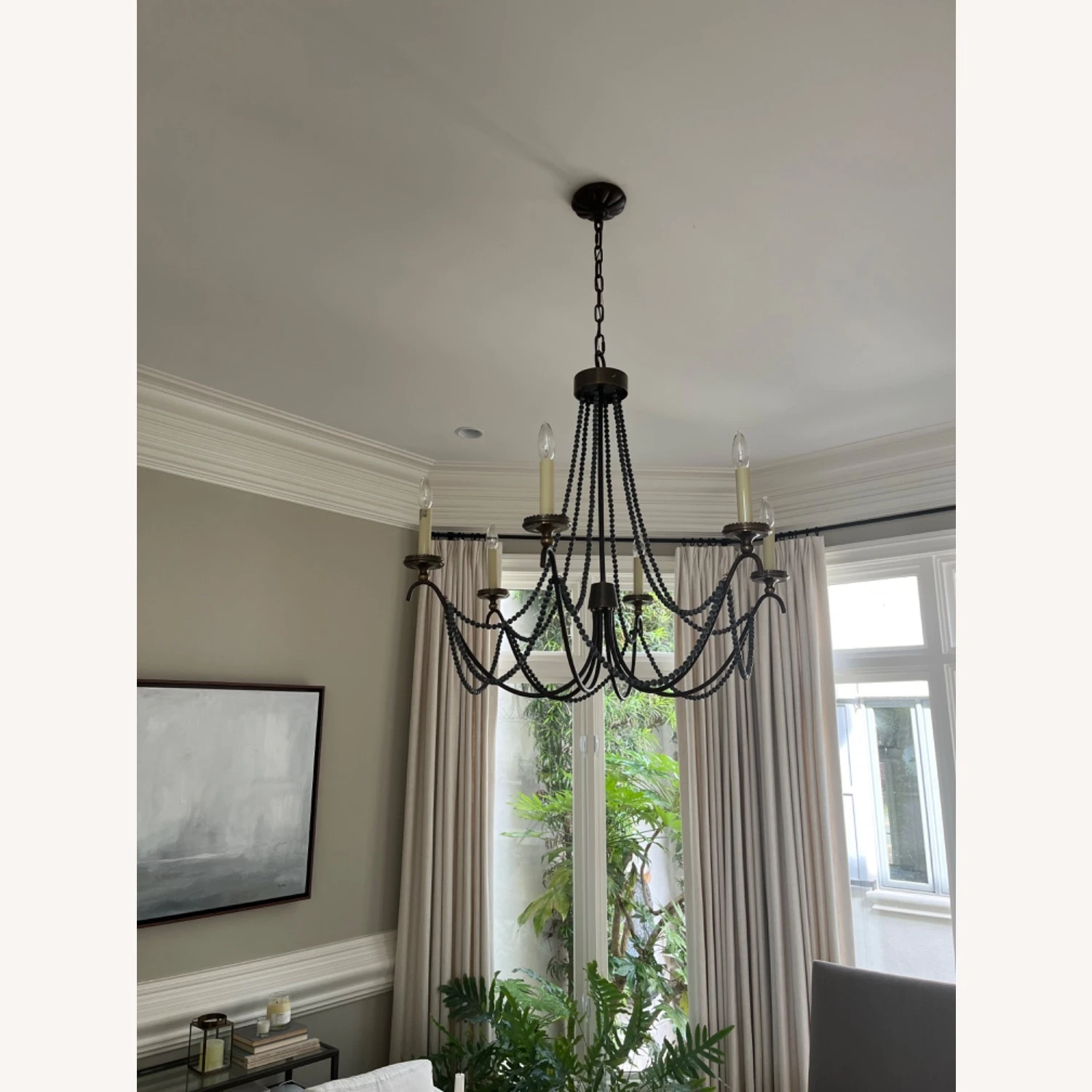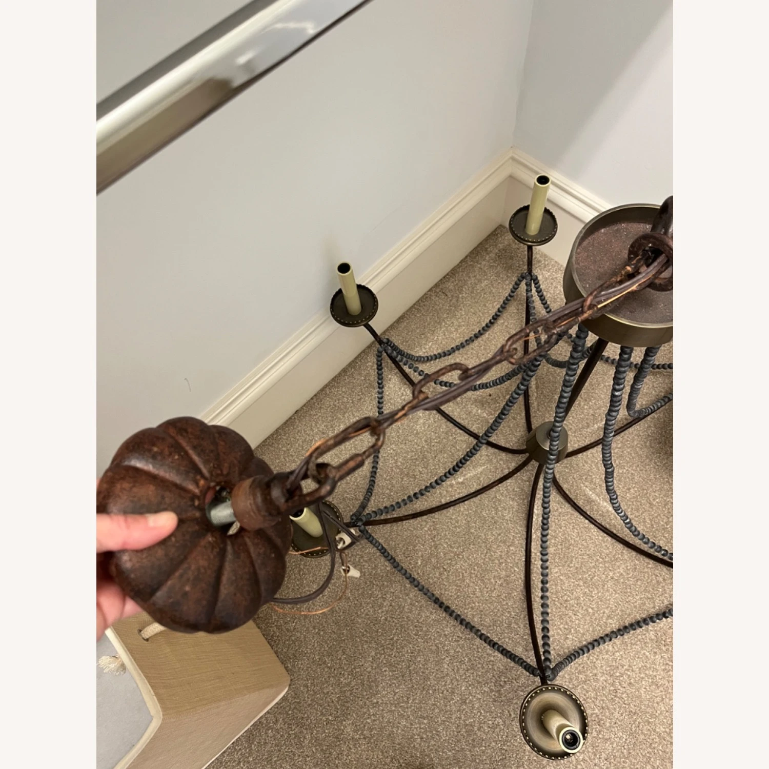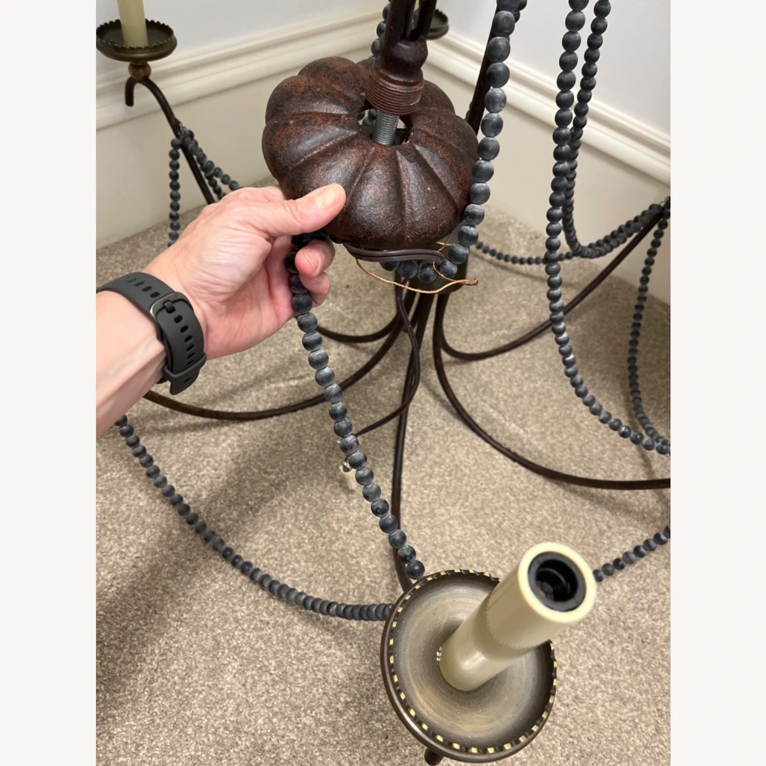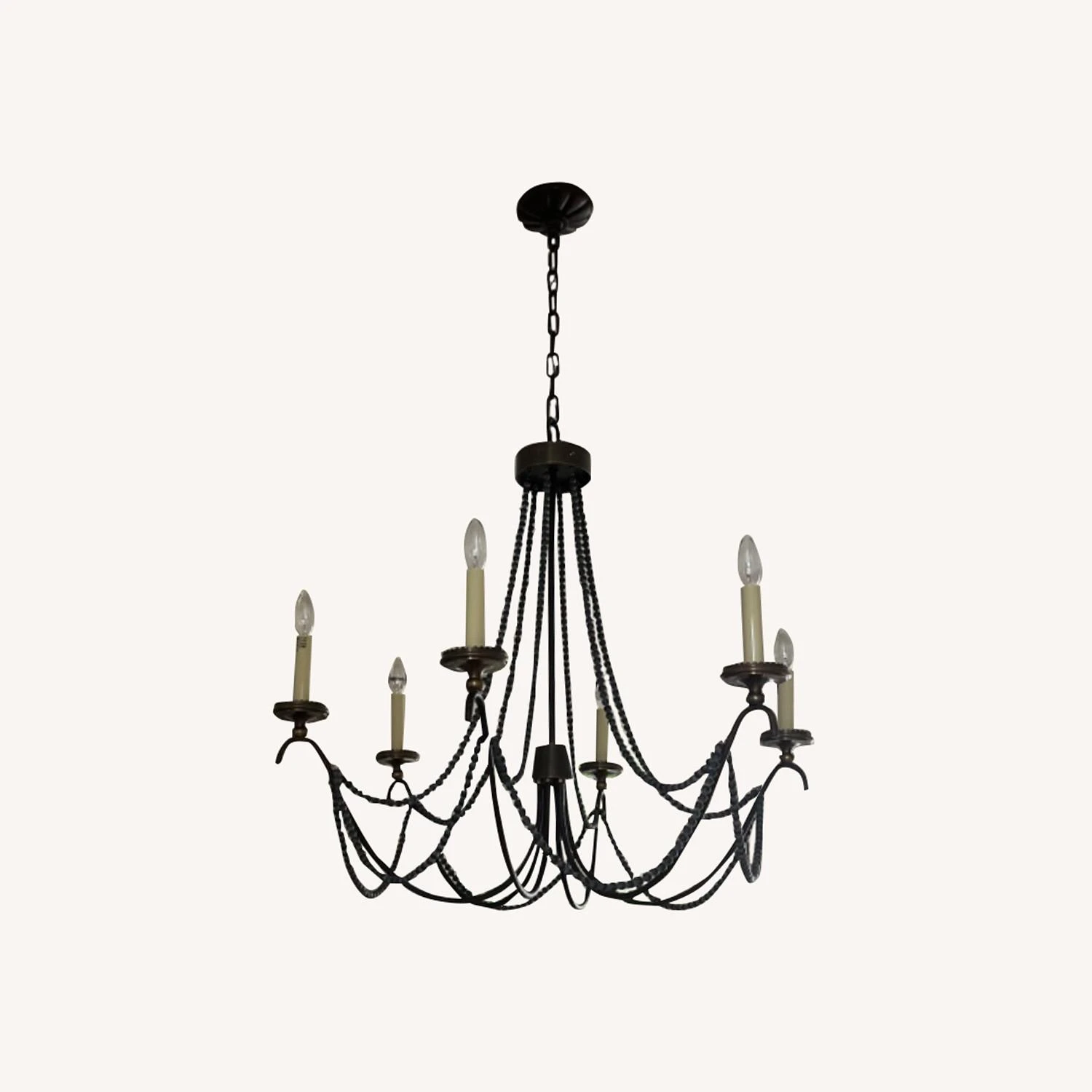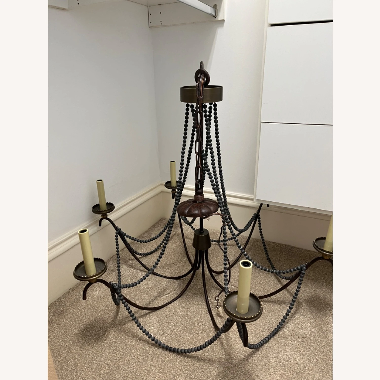 Seller’s Notes: This Gabby chandelier has been in a lake house that was a second home for the last 5 years. The wooden beads are a grey/light black color, the hanging fixture is more of a rust color up close and then the part that holds the candelabra bulbs is a matte goldish/bronze color. Elegant and fits many type of decor. Takes 6 candelabra based bulbs of 40 watts each or lower.