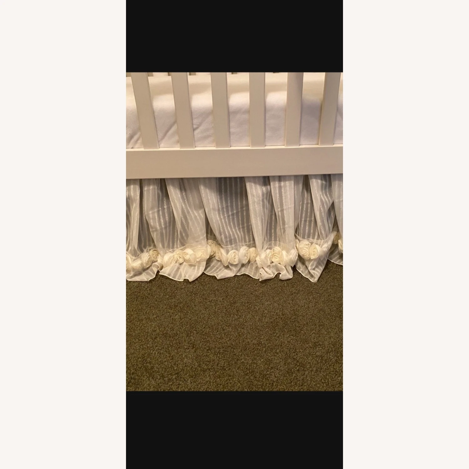 Seller’s Notes: Glenna Jean ivory sheer crib skirt with cream roses and cotton centerpiece. It has 4 slit corners to easily slide on crib. Sheer fabric has thin lines going down. Custom made to be fuller and drapes on the floor. (Approx 50x28x22) The amount of draping can be adjusted to anything desirable by just tucking it under the mattress. It has a soft flowy girlie charm.