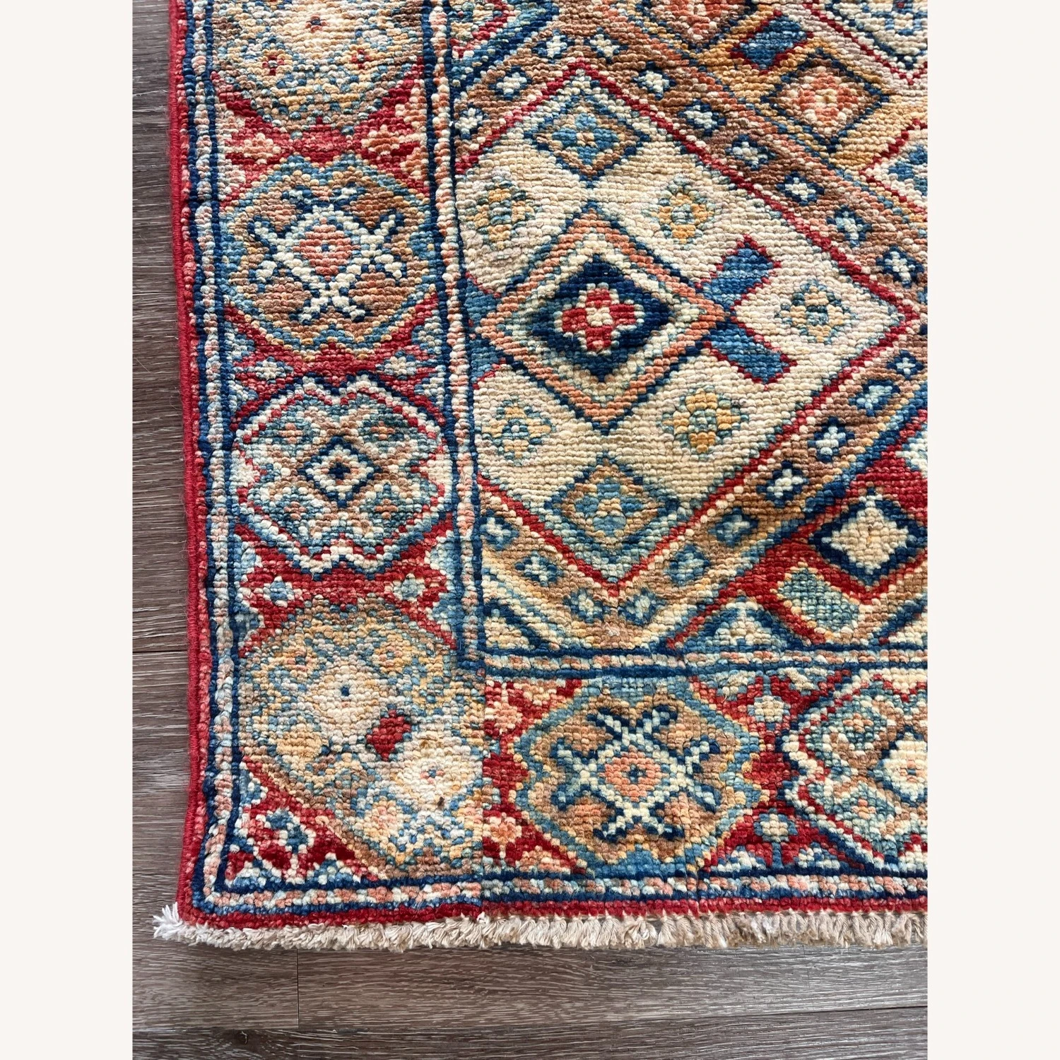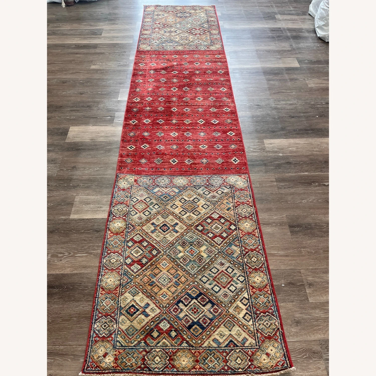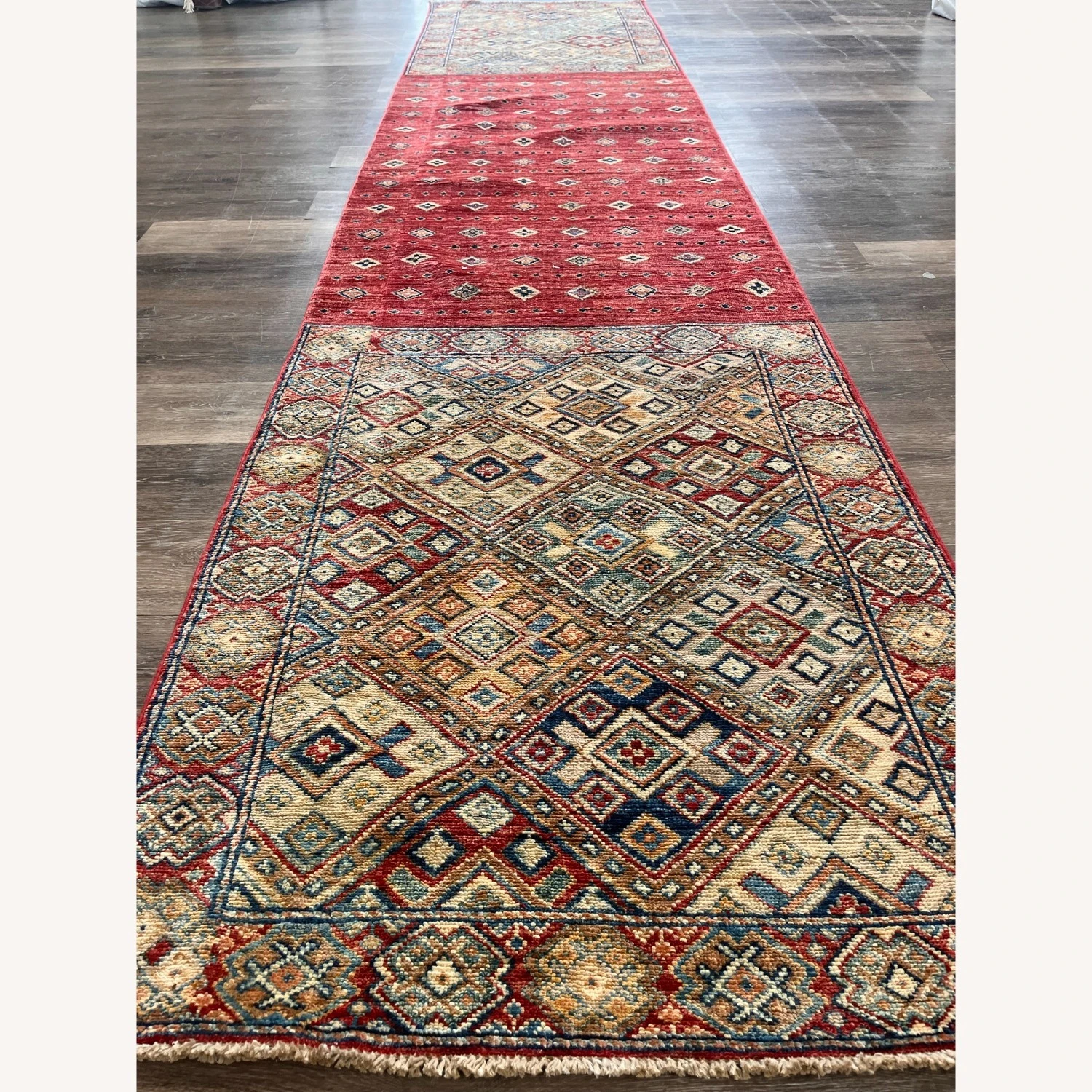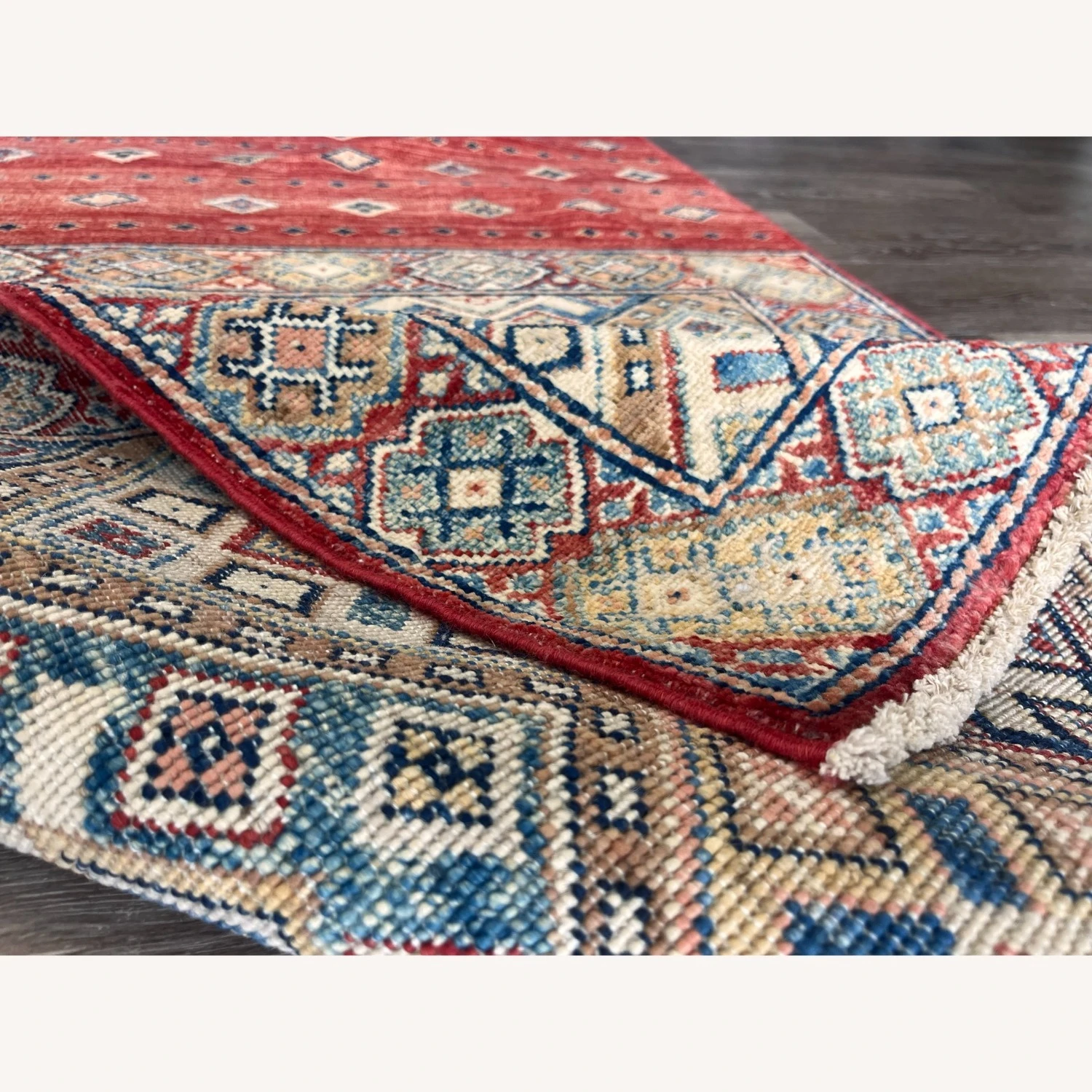 Seller’s Notes: This caucasian runner was handwoven in India and you can have the only one. Its primitive pattern will make any space a statement. 100% wool on a cotton foundation.