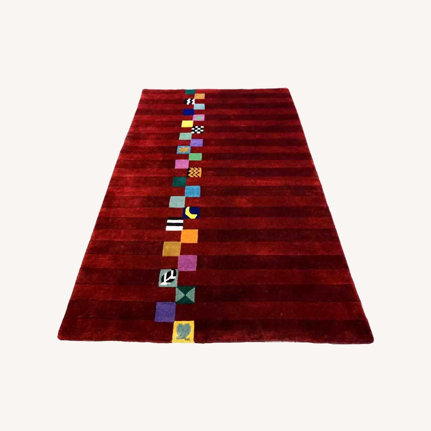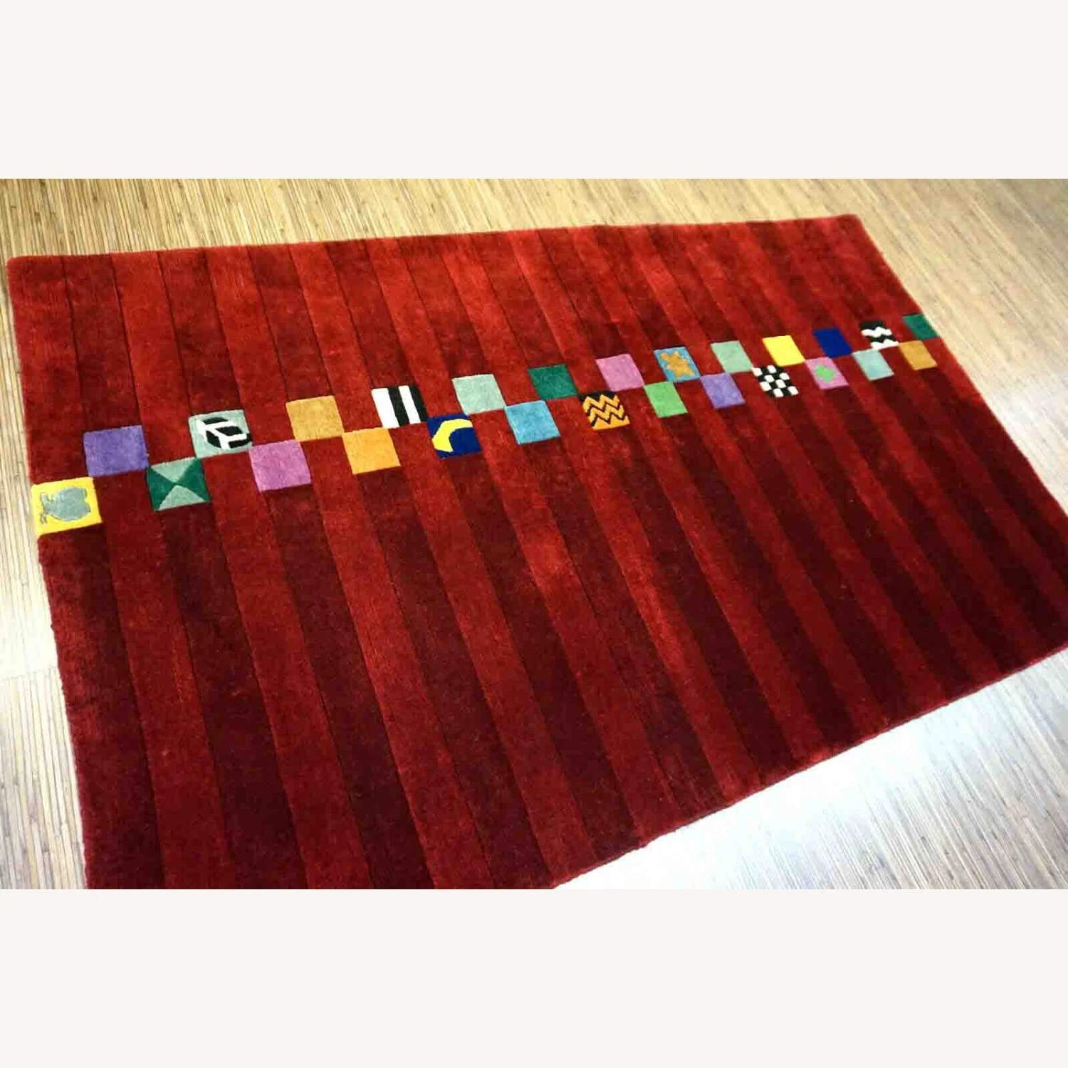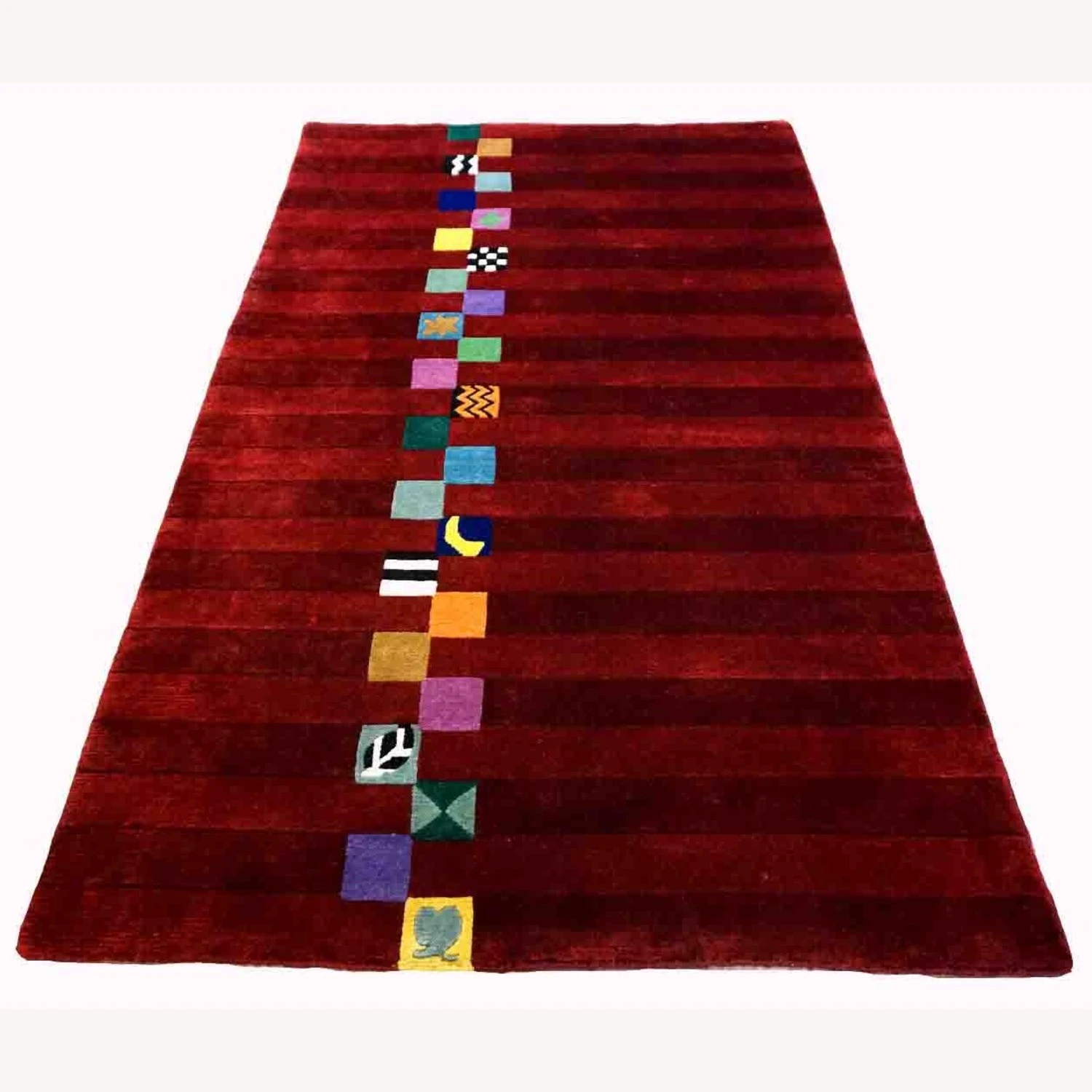Seller’s Notes: Handmade vintage Persian Gabbeh rug in bright red color and colorful geometric design. The rug is from the end of 20th century in original good condition.