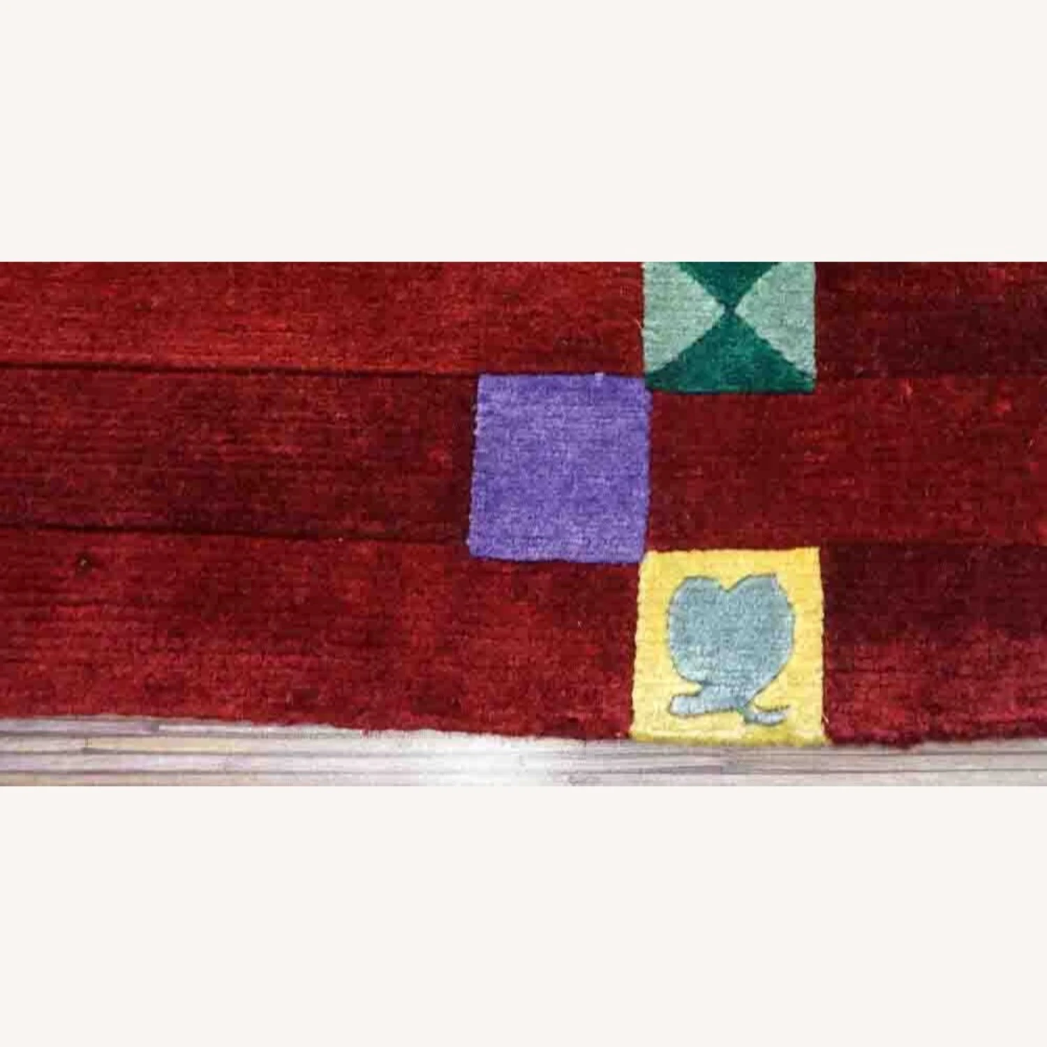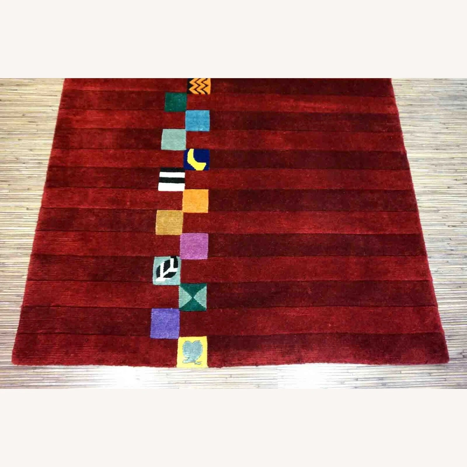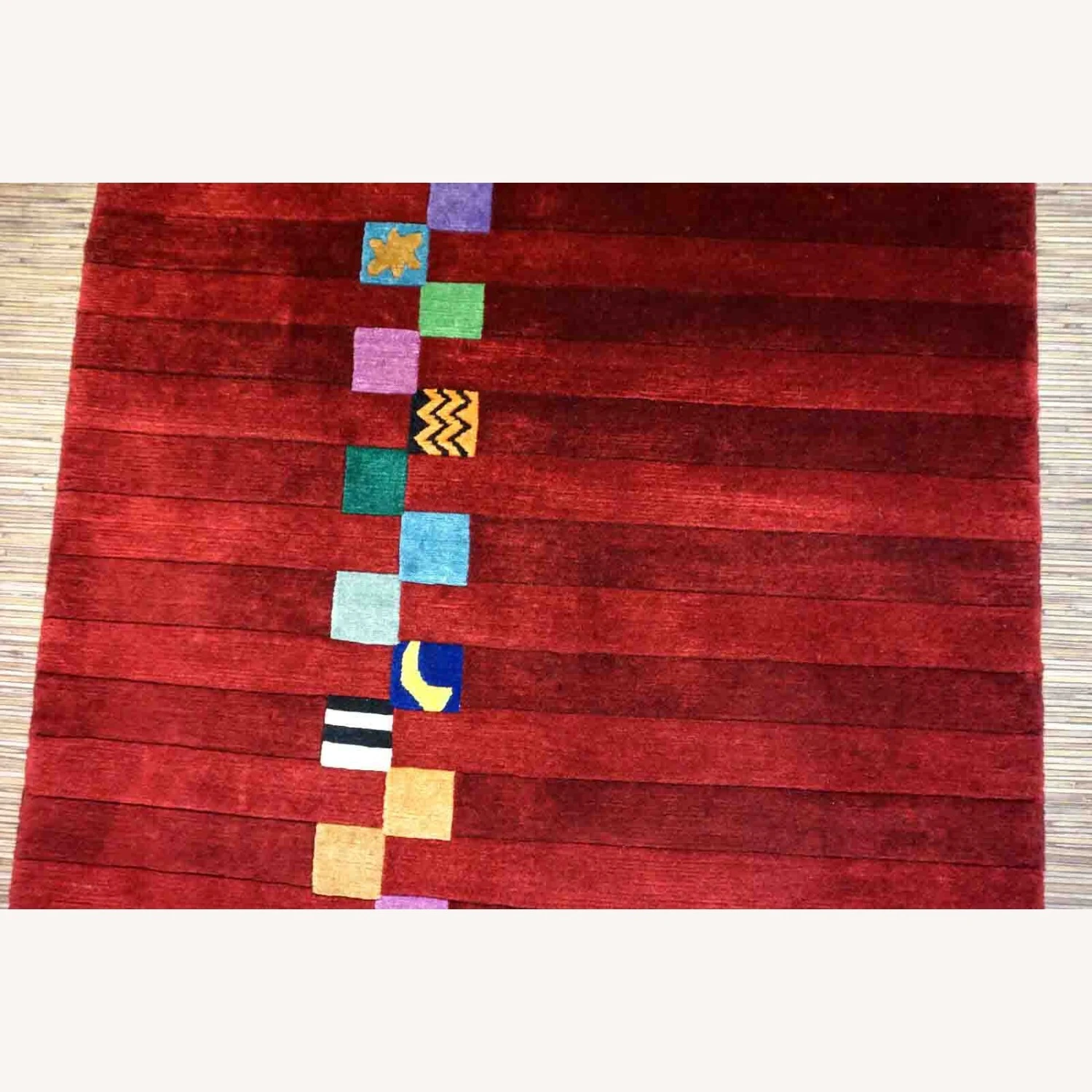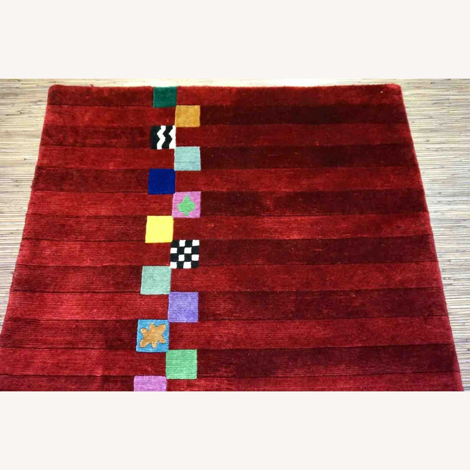 Seller’s Notes: Handmade vintage Persian Gabbeh rug in bright red color and colorful geometric design. The rug is from the end of 20th century in original good condition.