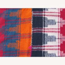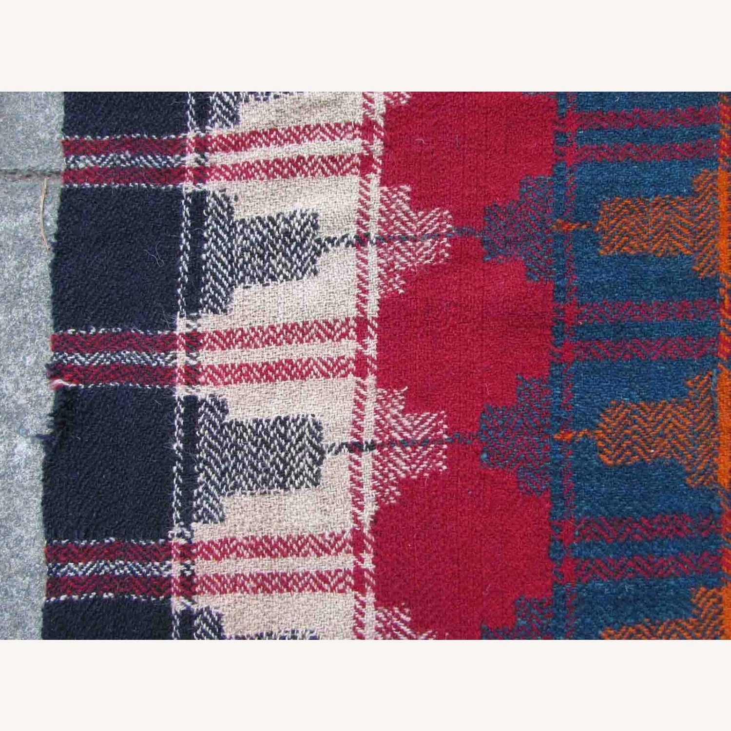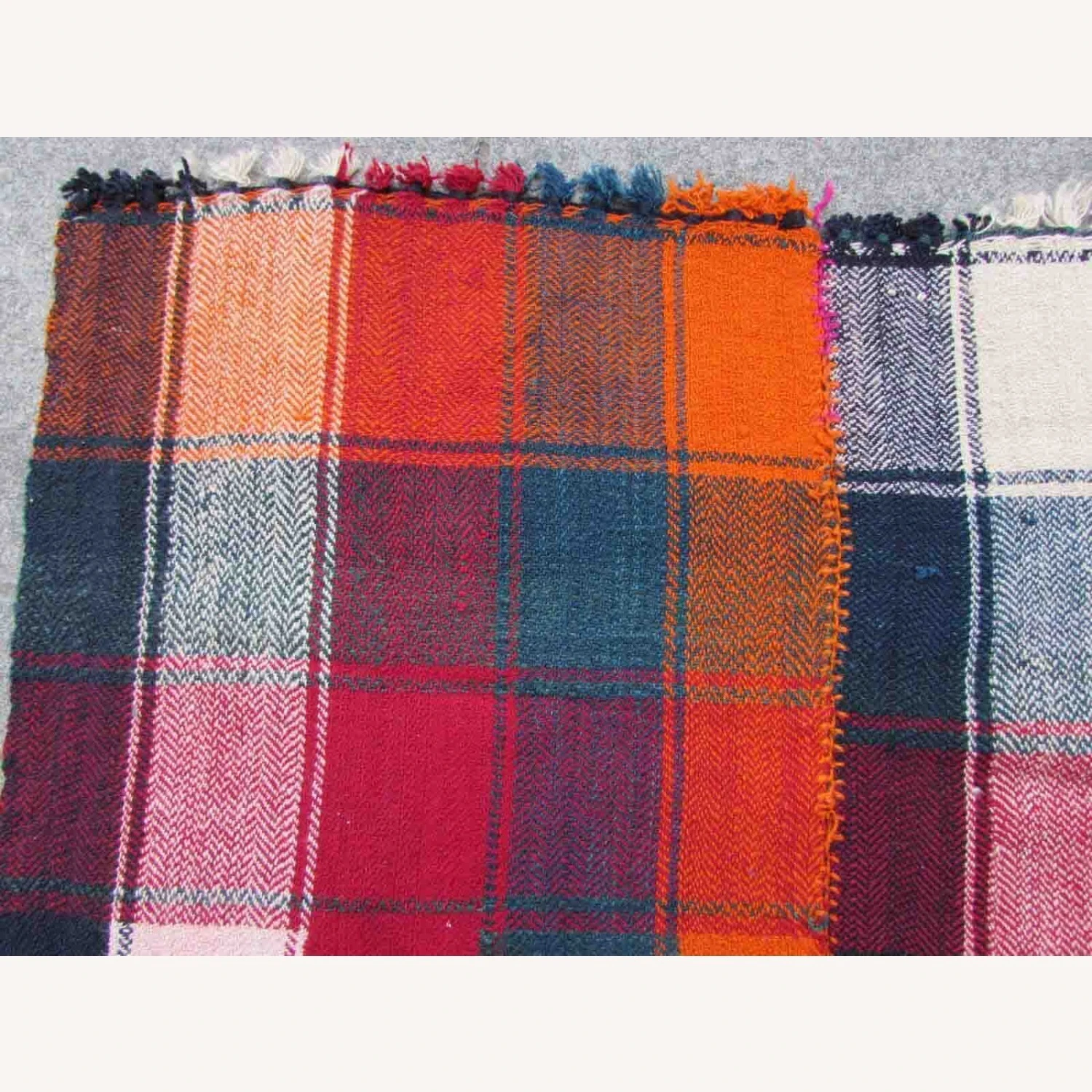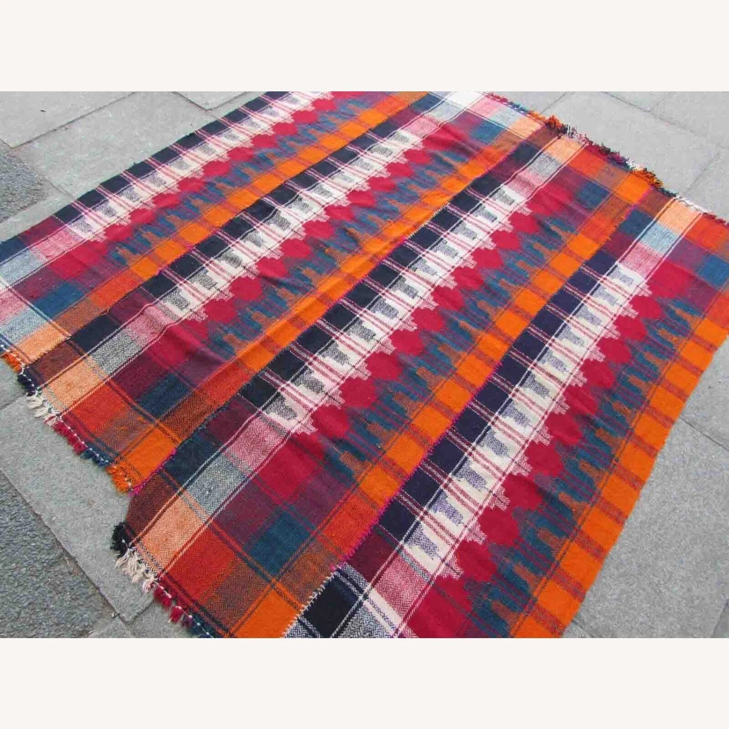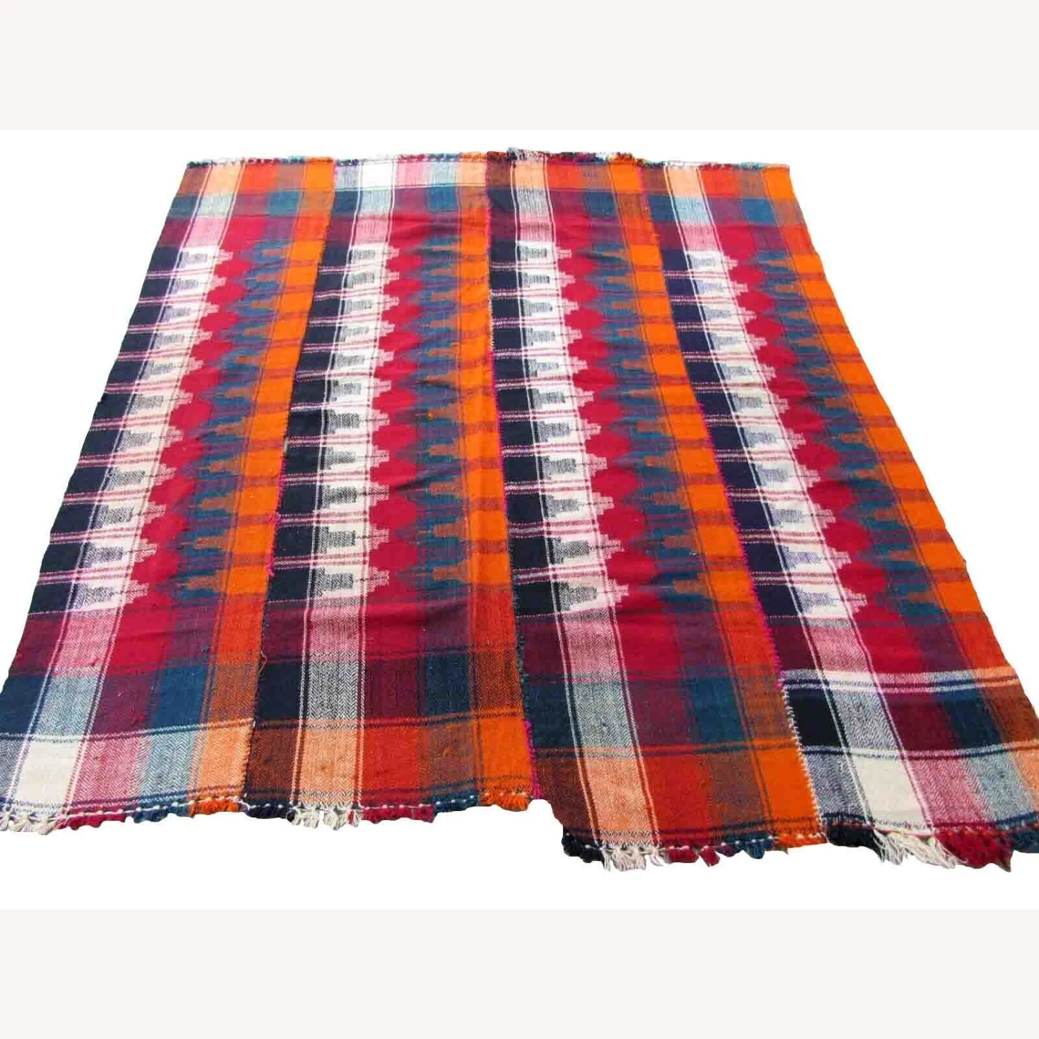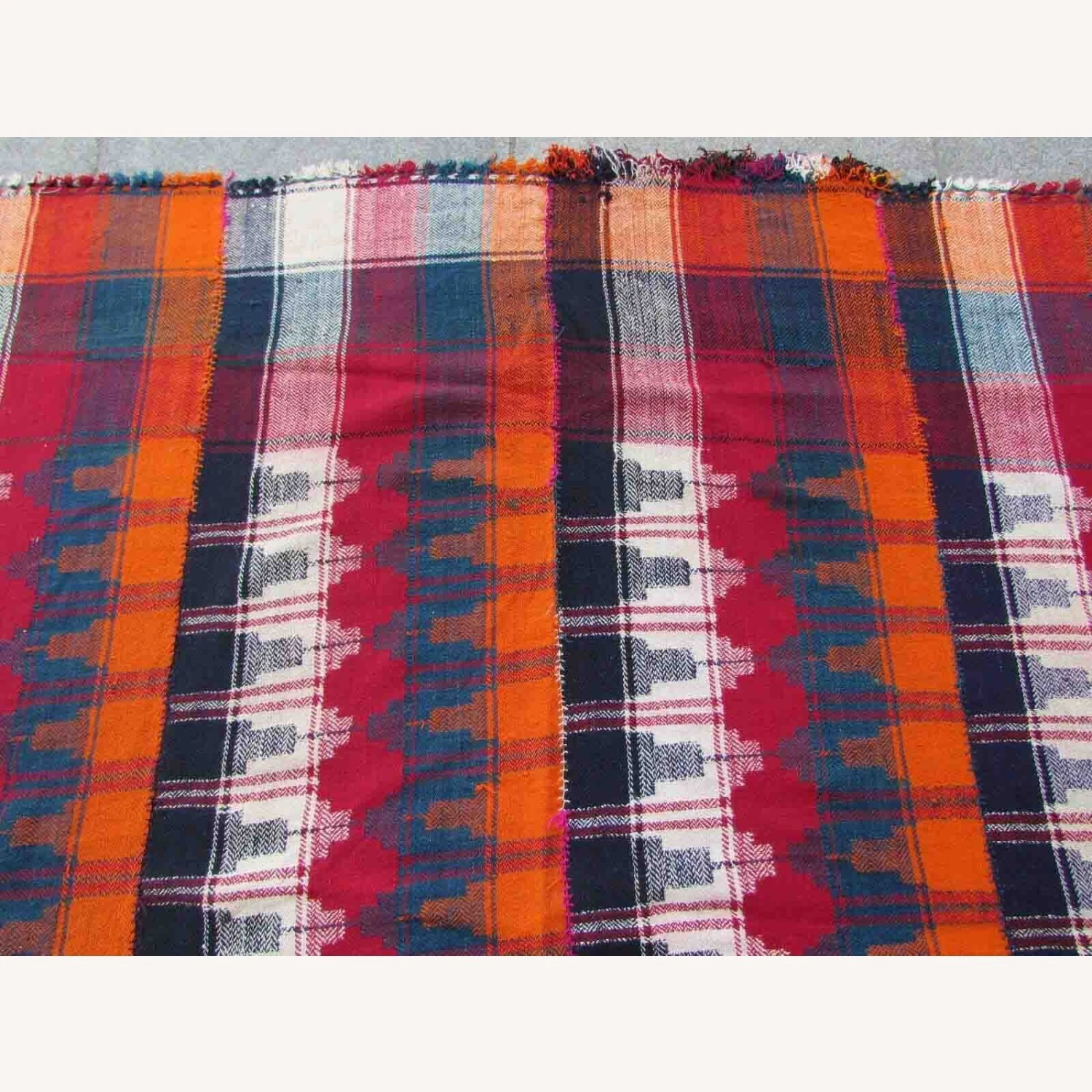 Seller’s Notes: Handmade vintage Persian Moj kilim in colorful shades made in stripes. The Moj is made as a throw, usually made from two or few narrower piece, nearly identical (you able to undo the joint in middle and use it as a curtain) one of the panel is shorter than others. The Moj is crooked and is not perfectly rectangular or evenly straight due to being handmade.