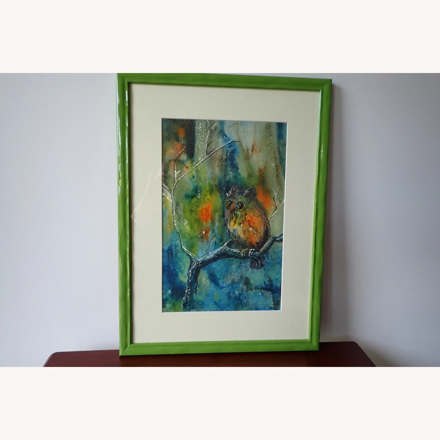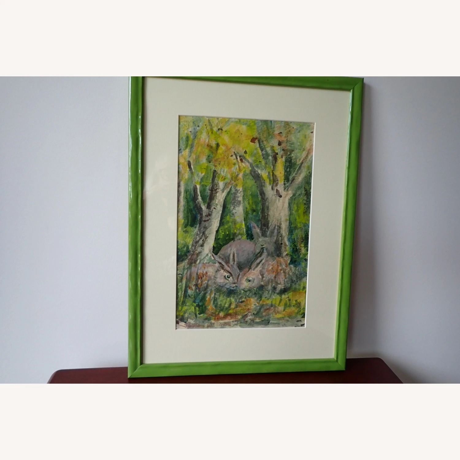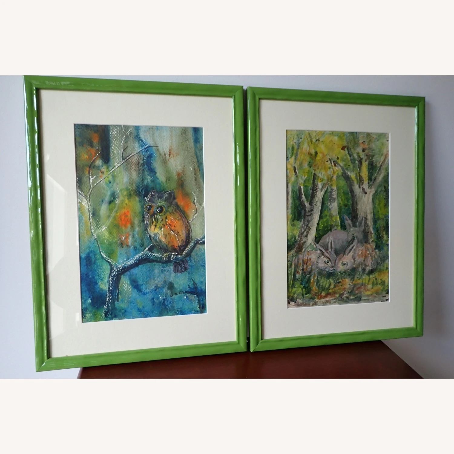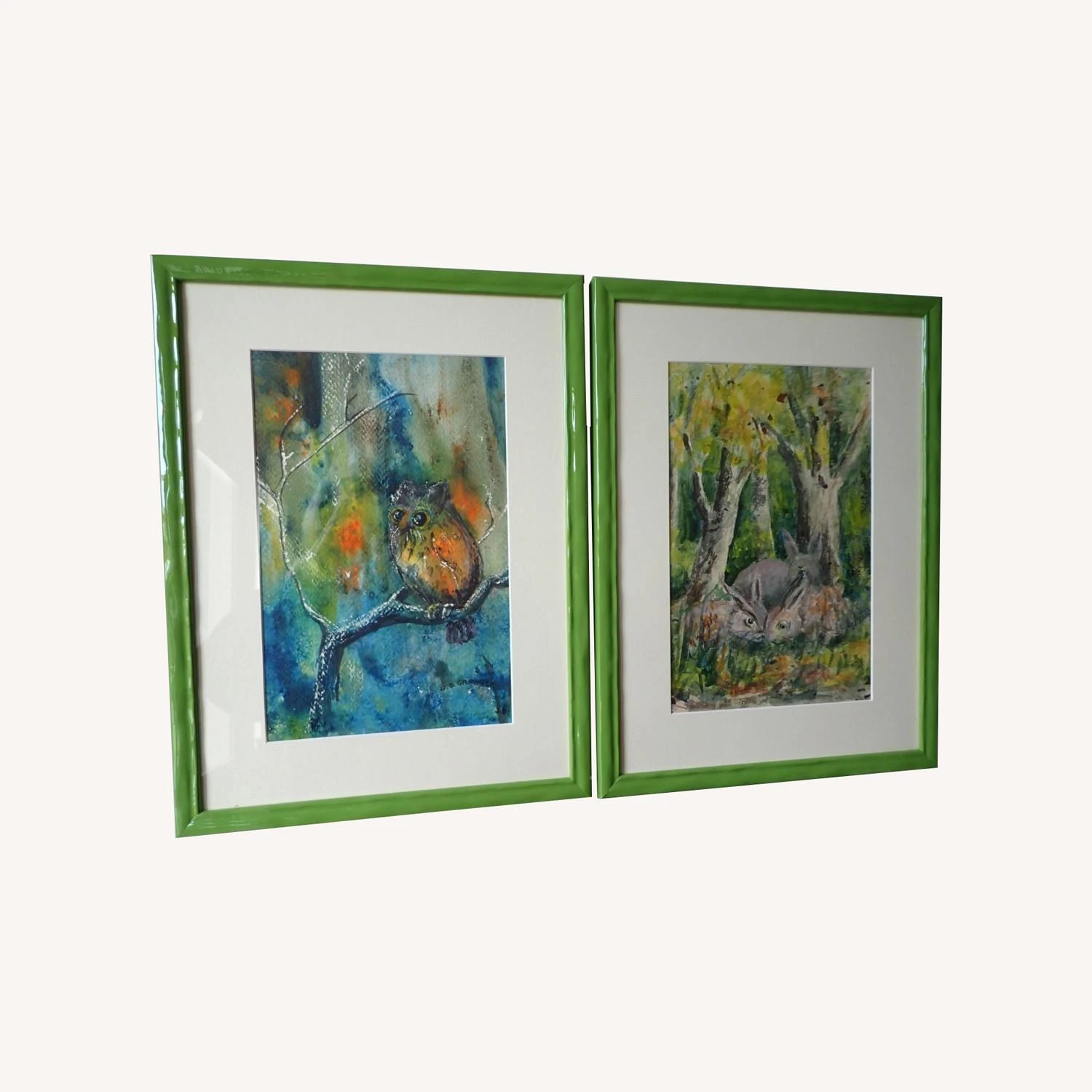 Seller’s Notes: This pair of watercolor paintings was done by Mrs. Olive Granger of Black Mountain, N. C. She was renowned in that area for her paintings and taught many others the fine art of watercolor painting. Olive lived into her nineties and never stopped painting. One of the paintings is of an owl and the other is of a pair of rabbits, with what appears to be a mommy rabbit, with the forest as a background. The paintings have been professionally framed in a vibrant green to accent the background colors. The images are 7″ wide and 11″ high. The frames are 12″ wide and 16″ high. These are one of a kind.