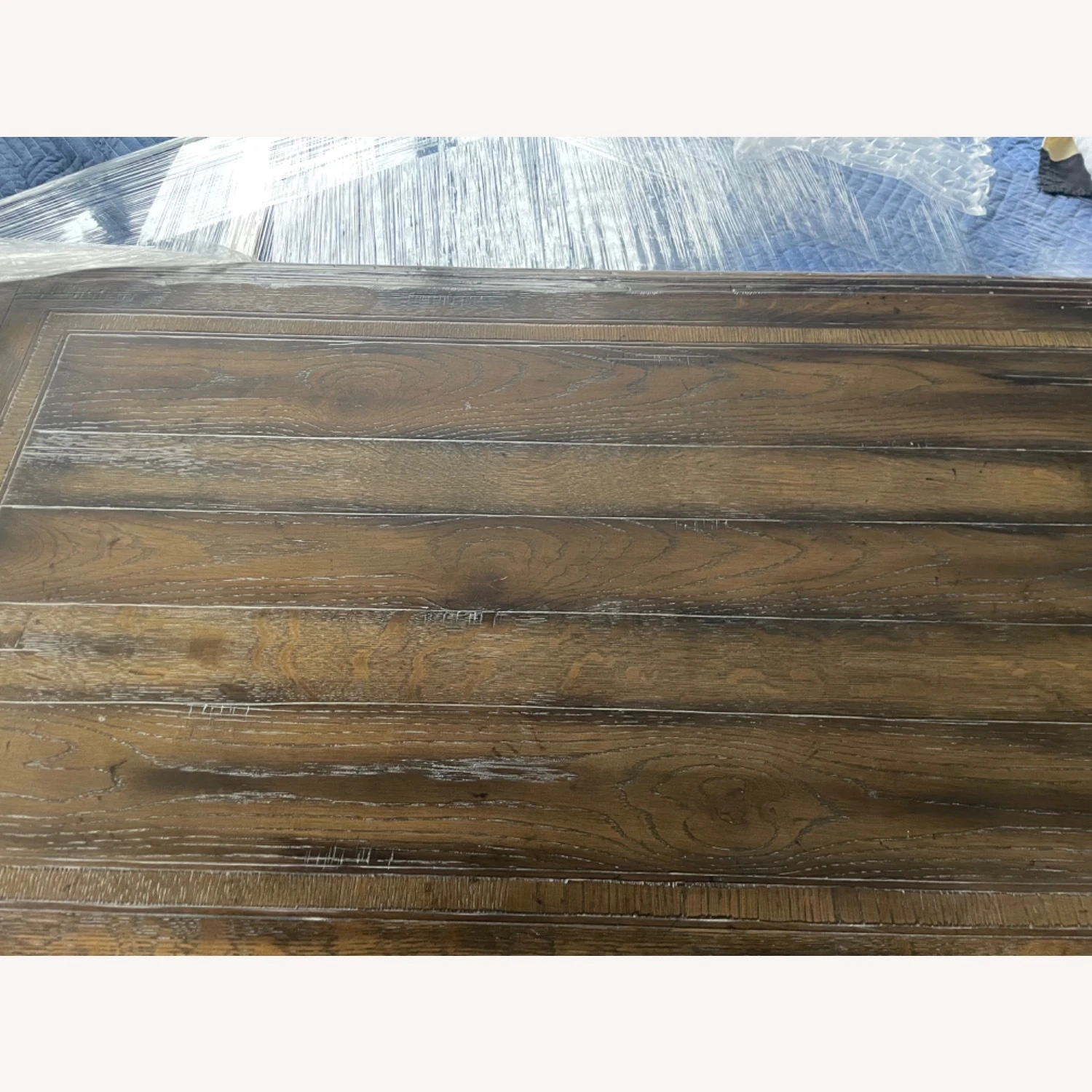 Seller’s Notes: Set is listed for sale @ Hooker Furniture, Hill Country! Please view their website. Acquired beginning of pandemic. Still in โmoving wrapโ. Too large for my dining room. My eyes deceived me. There is a โDingโ on foot of leg and I can only assume a doggie did it however I donโt know if owners had dog. Table weighs a ton and โsolid as a rock.โ Itโs hard to imagine how minor ding got there. โDingโ stained brown so not visible in photo.