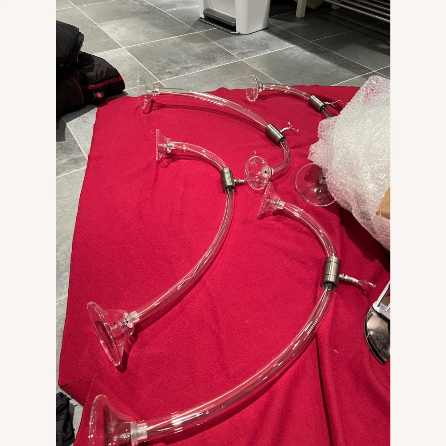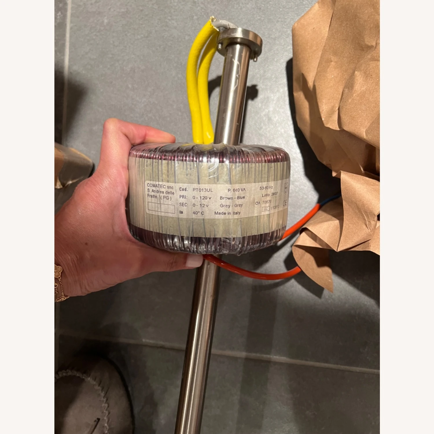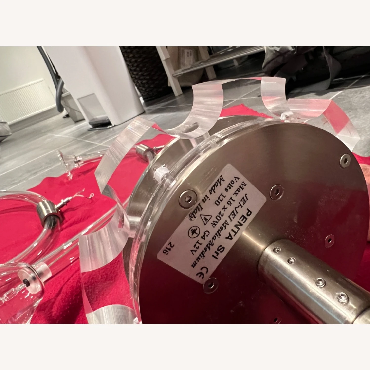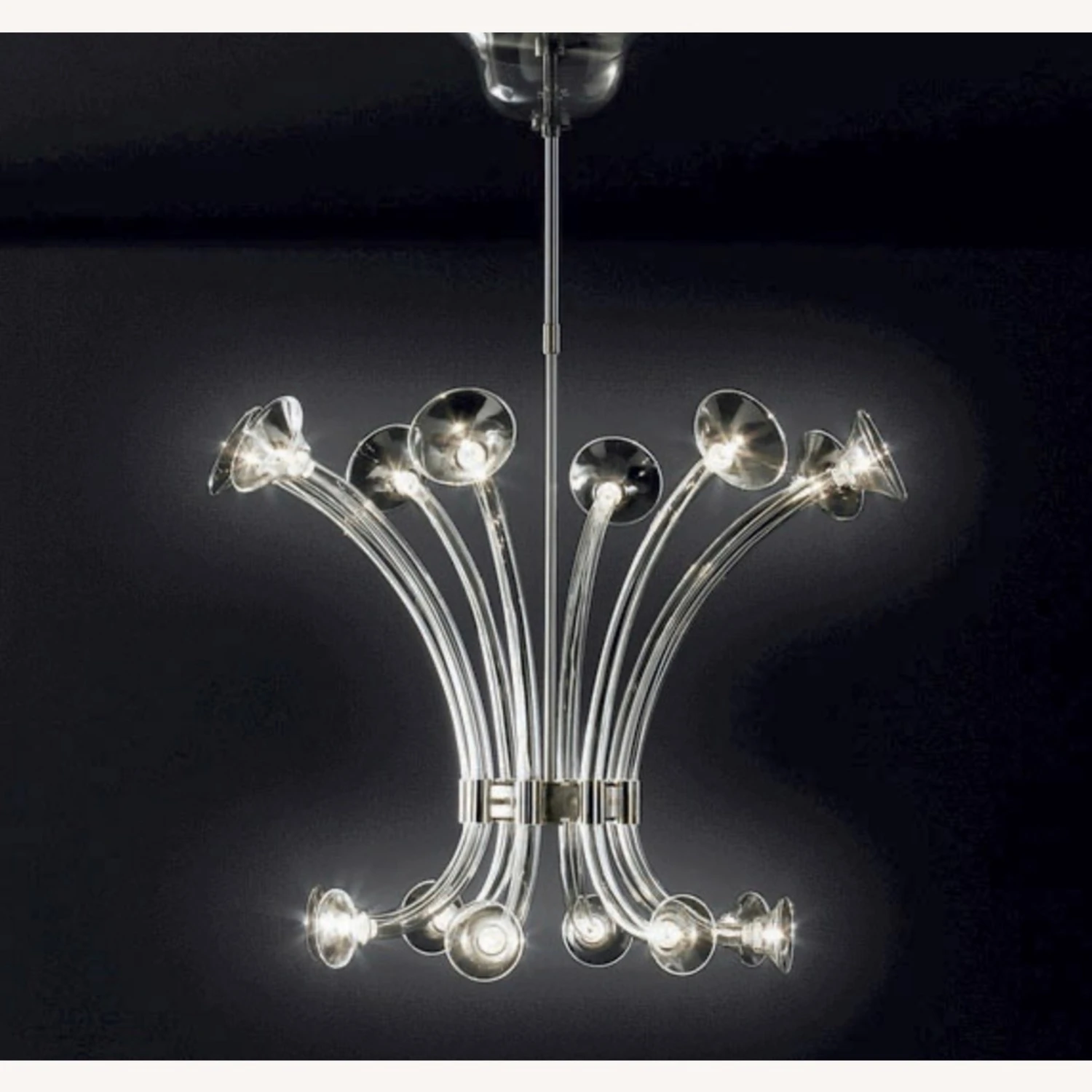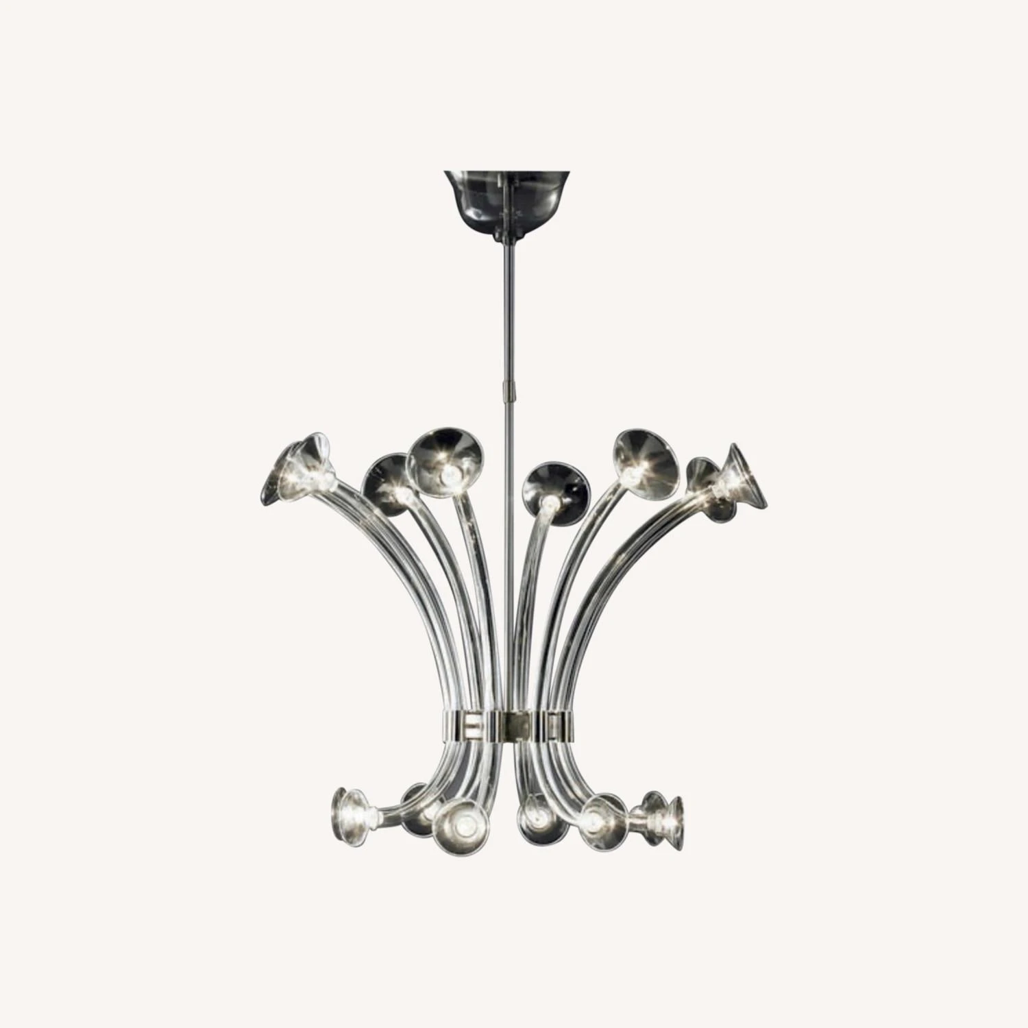 Seller’s Notes: JEI JEI Medium 16 Light Chandelier – Metallic structure with modular medium shades (8) in transparent borosilicate glass.Safety transformer in the upper steely canopy, with covering shade in borosilicate glass. Telescopic stem in satin steel. Unused in box. This was bought by our decorator and we didnโt like it so itโs been in the box for 5+ years. Finally moving so need to clean out storage unit.