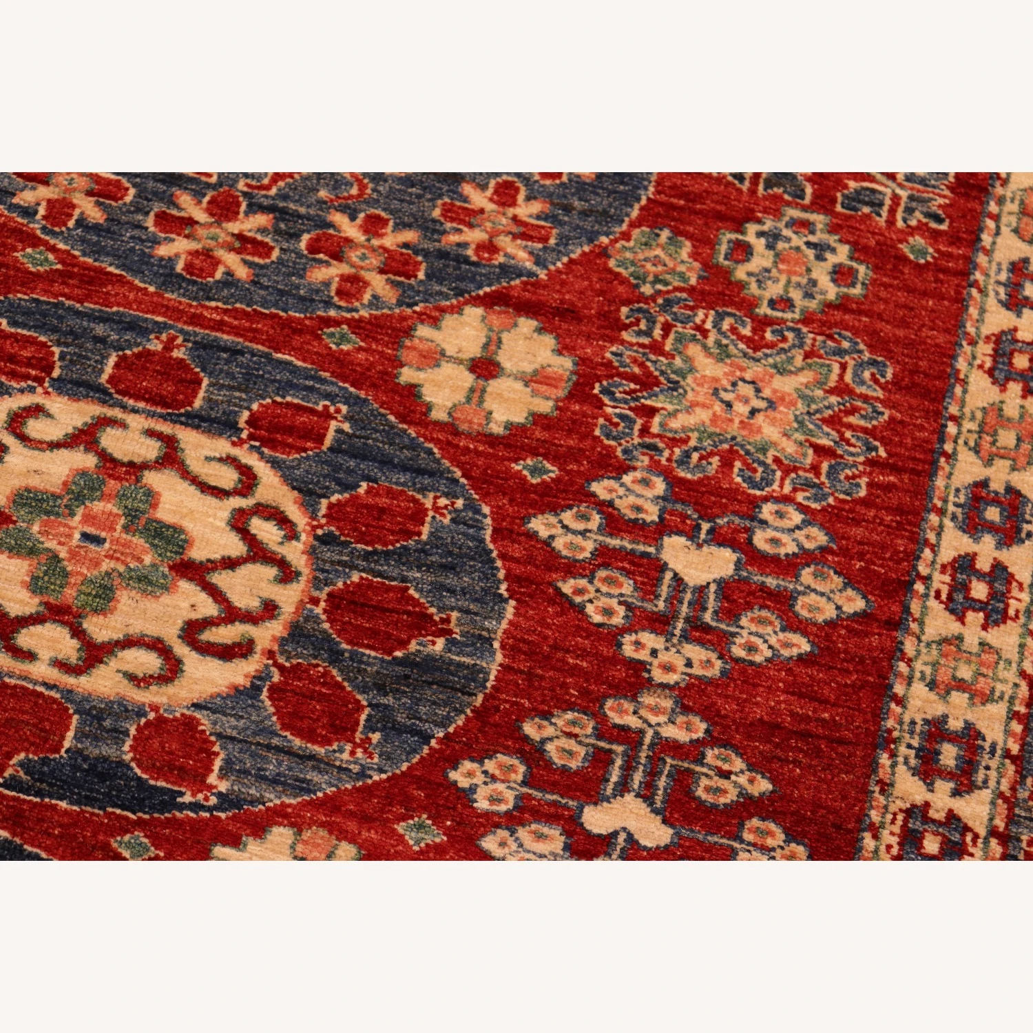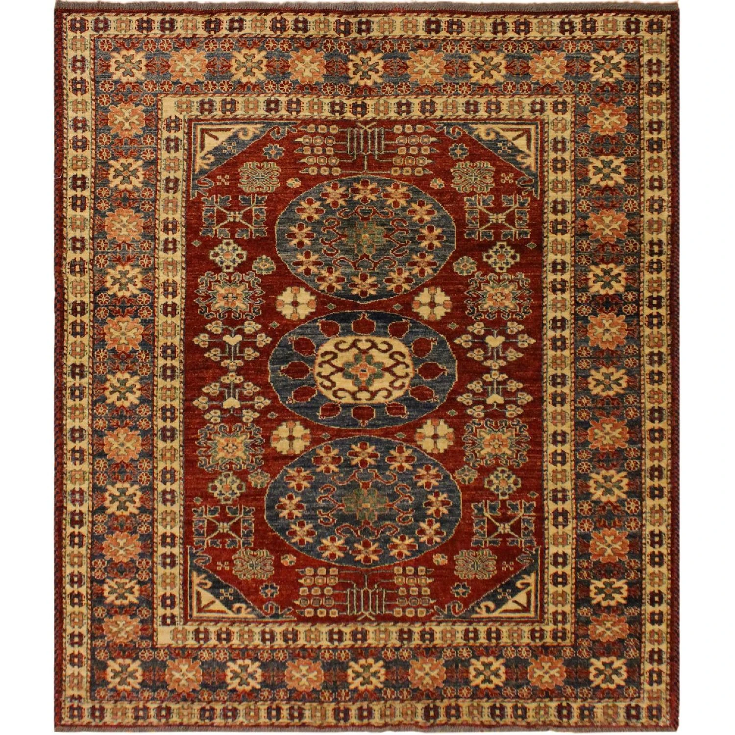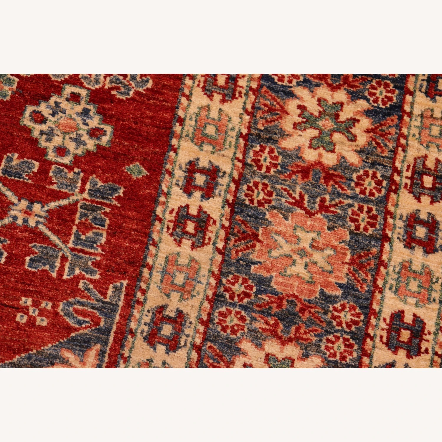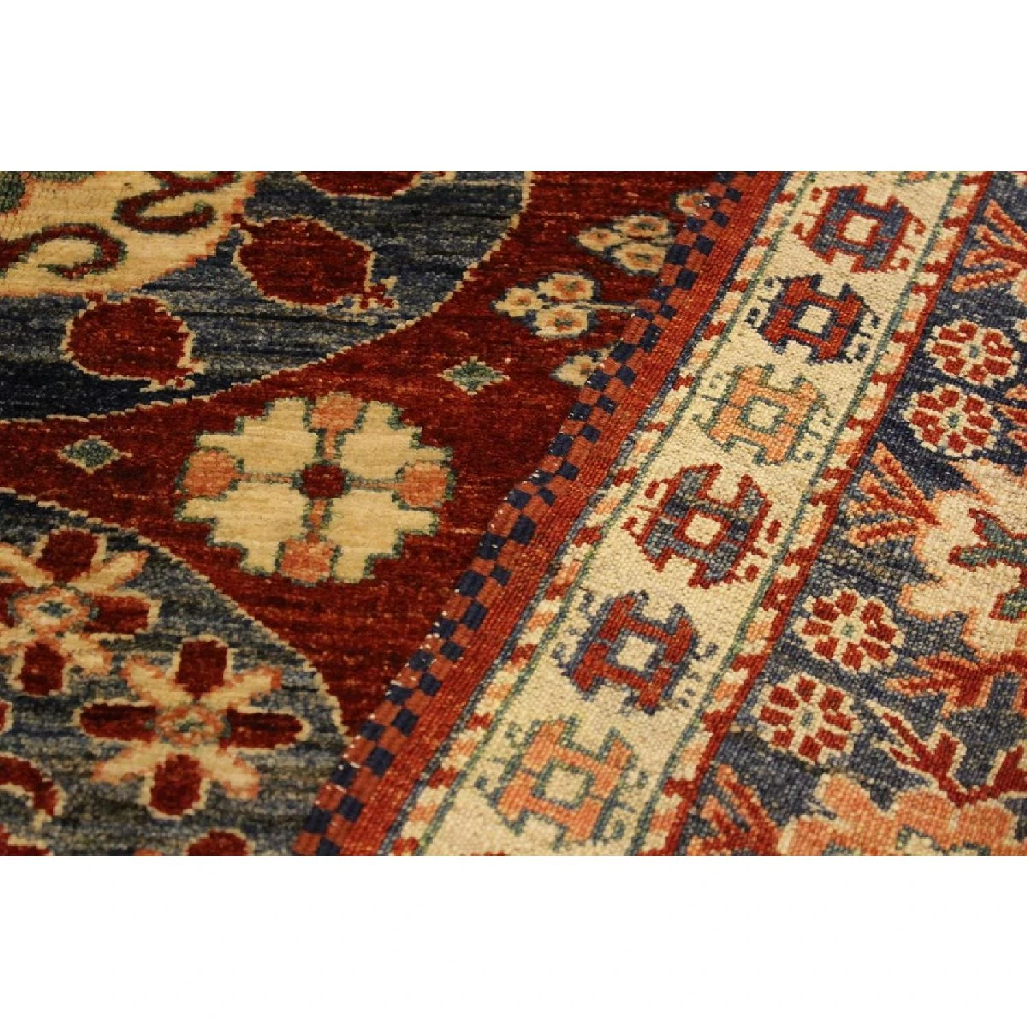 Seller’s Notes: Embellish your home with this exquisitely hand-knotted super Kazak Rug made with the finest hand spun wool and all vegetable dyes. Demonstrating incredible attention to detail, this hand-knotted masterpiece features an intricate Kazak pattern in a classic color palette. Made in the Caucasian designs from Russia and the northern Persian empire, each Kazak incorporates distinctive tribal flavor with elements such as; the stepped hooted polygons, geometrical medallions, animals and rosettes. The straight, clean lines and bold tones embody the weaving style of the Armenian and Afghani weavers known for these iconic designs. This magnificent rug featuring ยผ inch of pile and is made with handspun wool and natural dyes to produces soft luminous shades causing a beautiful sheen. With geometric designs and bold vibrant saturated colors predominately blues, reds, greens, and gold make a bold statement in any decor. The construction technique used ensures that the designs and colors are capable to withstand heavy traffic area.