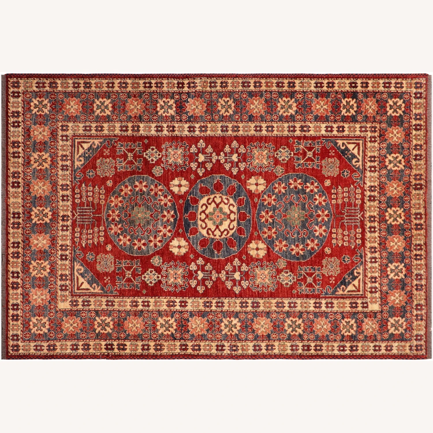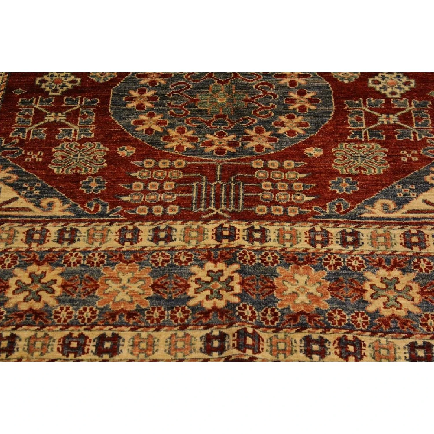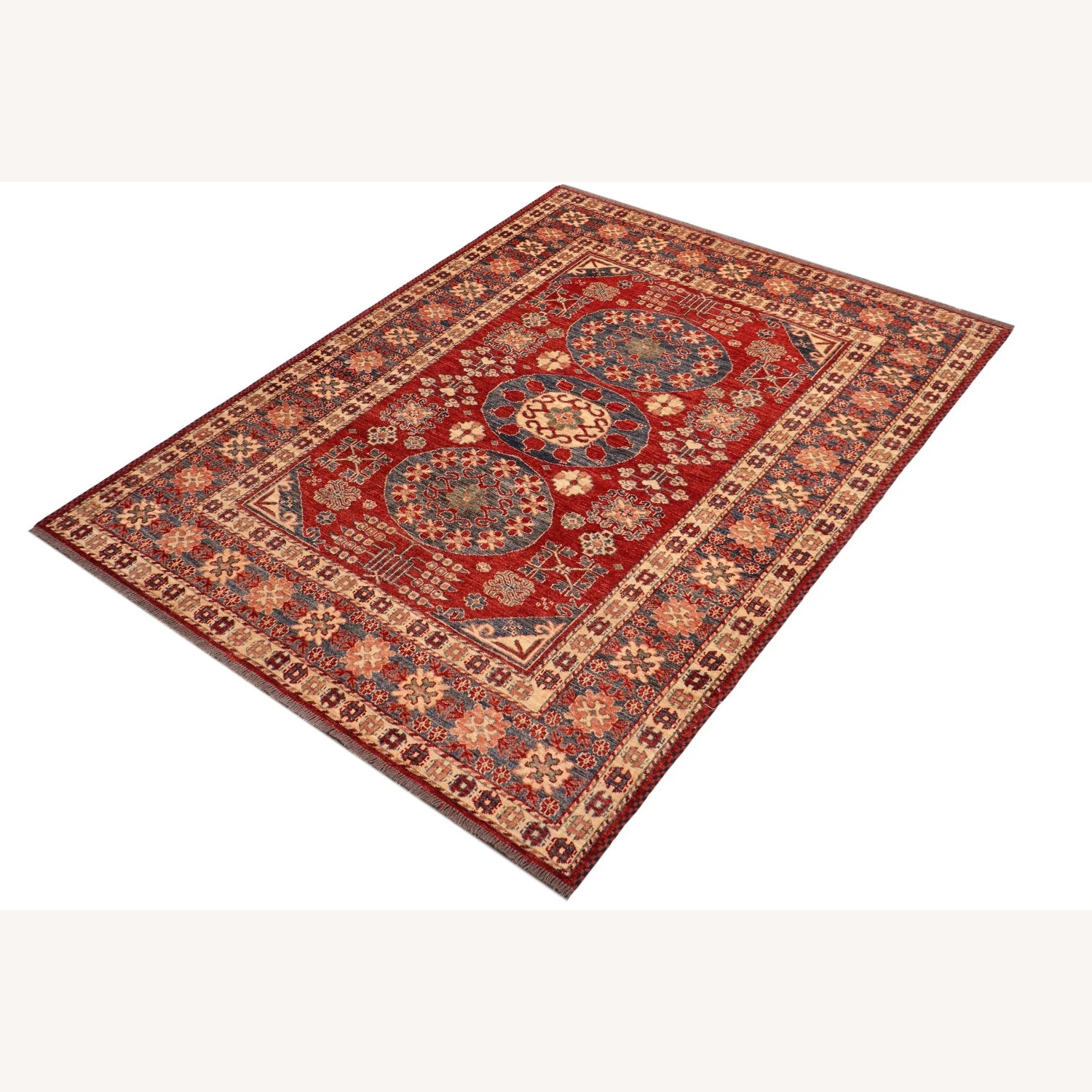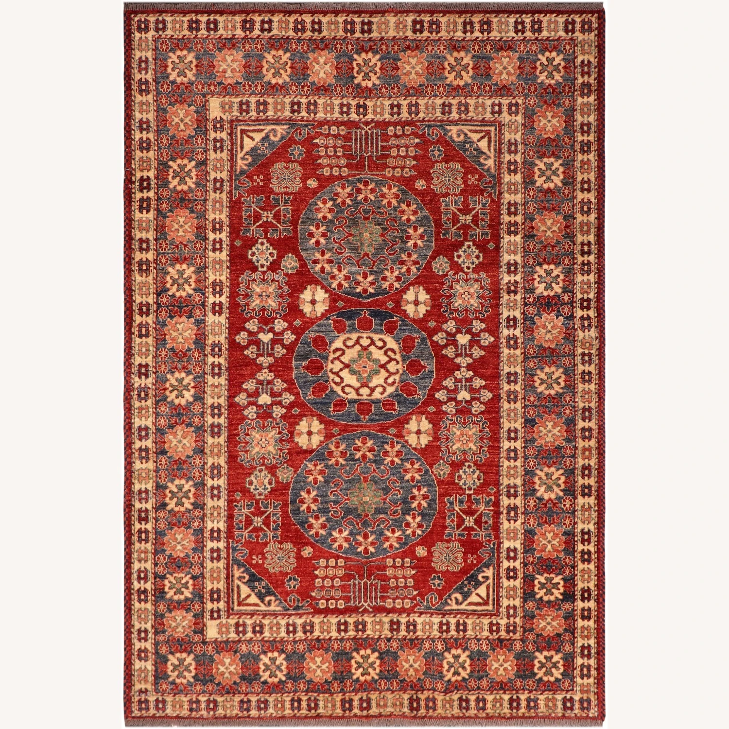 Seller’s Notes: Embellish your home with this exquisitely hand-knotted super Kazak Rug made with the finest hand spun wool and all vegetable dyes. Demonstrating incredible attention to detail, this hand-knotted masterpiece features an intricate Kazak pattern in a classic color palette. Made in the Caucasian designs from Russia and the northern Persian empire, each Kazak incorporates distinctive tribal flavor with elements such as; the stepped hooted polygons, geometrical medallions, animals and rosettes. The straight, clean lines and bold tones embody the weaving style of the Armenian and Afghani weavers known for these iconic designs. This magnificent rug featuring ยผ inch of pile and is made with handspun wool and natural dyes to produces soft luminous shades causing a beautiful sheen. With geometric designs and bold vibrant saturated colors predominately blues, reds, greens, and gold make a bold statement in any decor. The construction technique used ensures that the designs and colors are capable to withstand heavy traffic area.