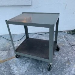 Try this vintage school AV cart! This industrial metal cart in gray (with green undertones) will make the perfect serving cart, bar cart or even a nightstand! smoothing rolling on coasters wand featuring a bottom shelf In very good condition, you’ll love this multifunctional piece!