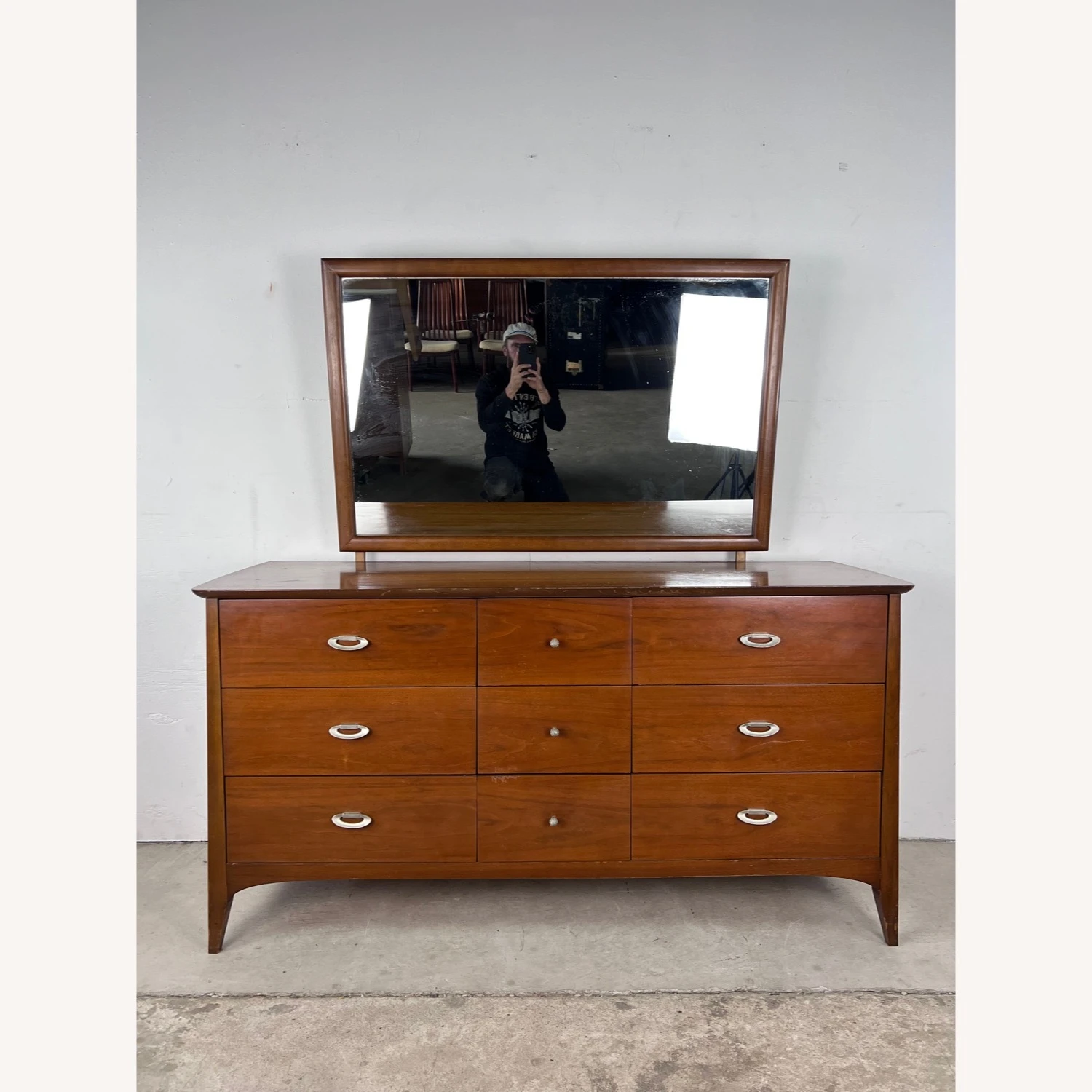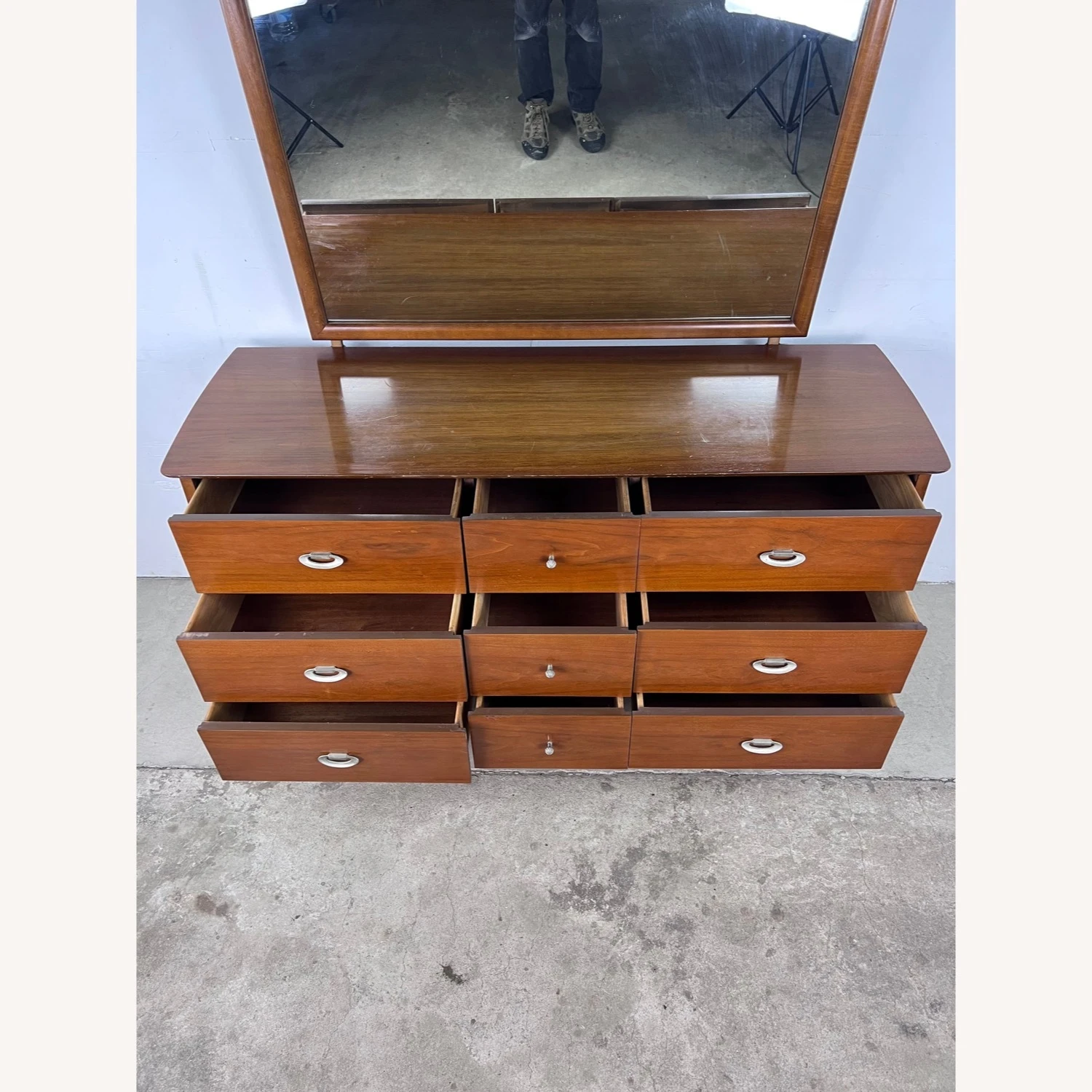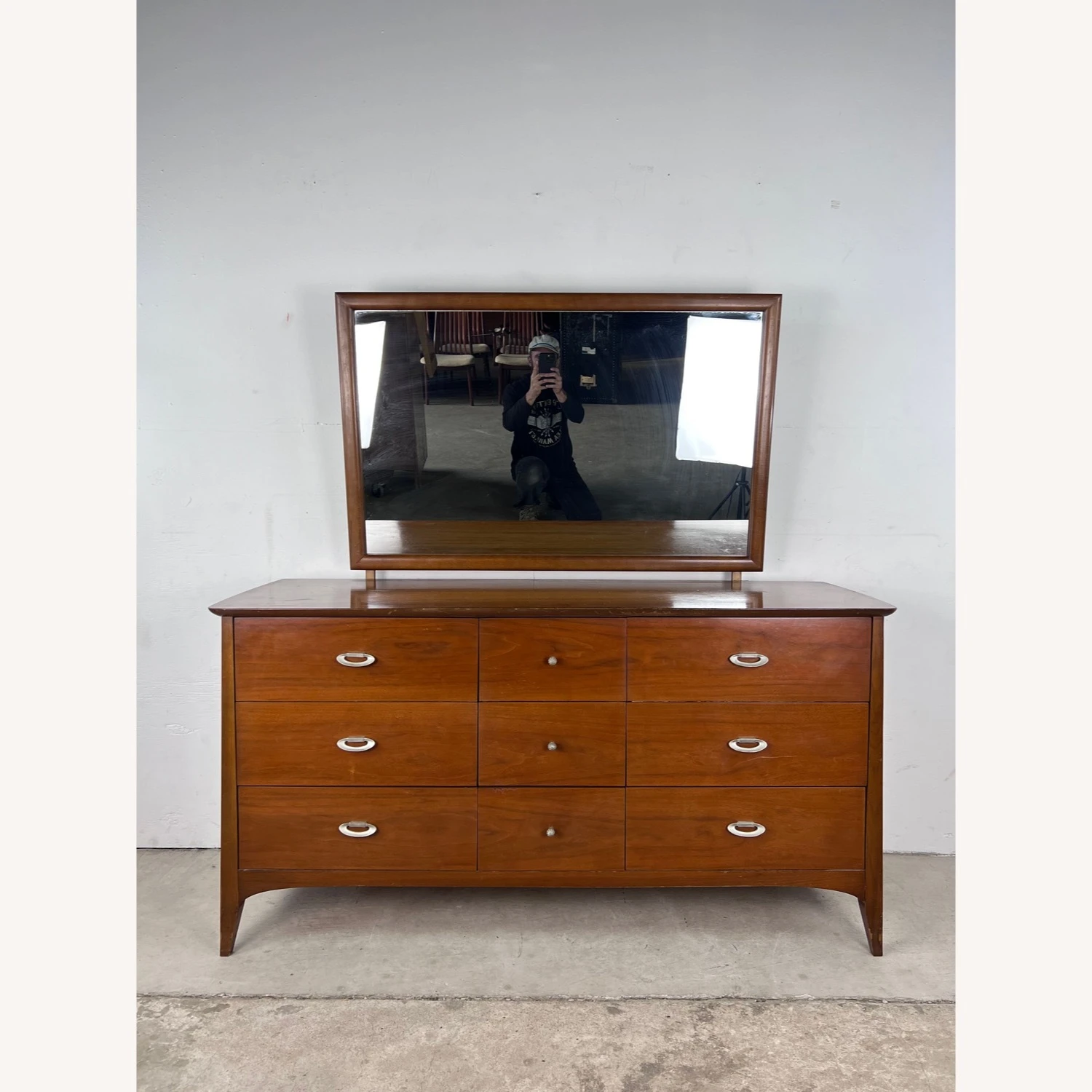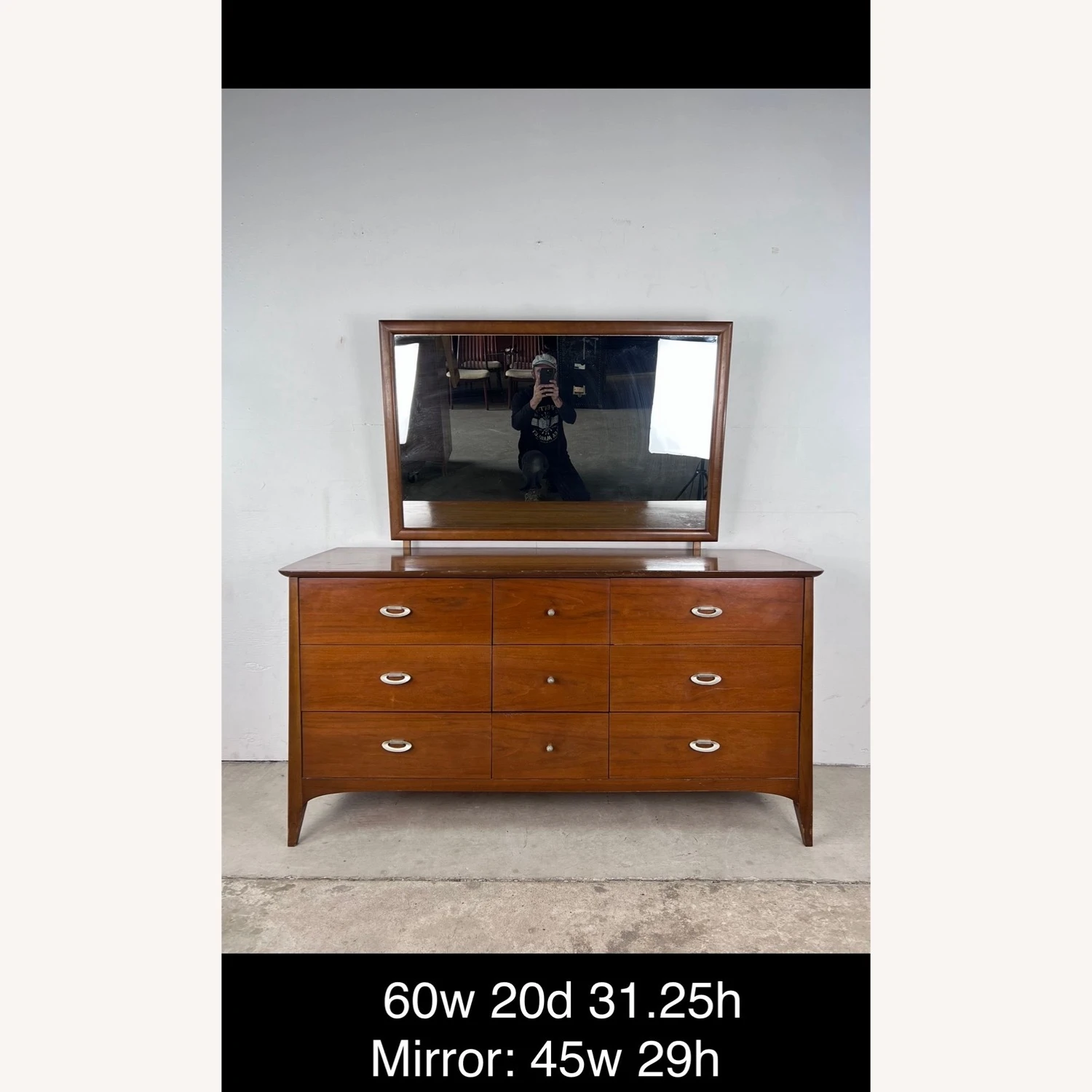 Seller’s Notes: This mid century modern lowboy dresser with mounted mirror features hardwood construction, walnut veneer with original finish, nine dovetailed drawers with chrome accented hardware, and tall tapered legs.