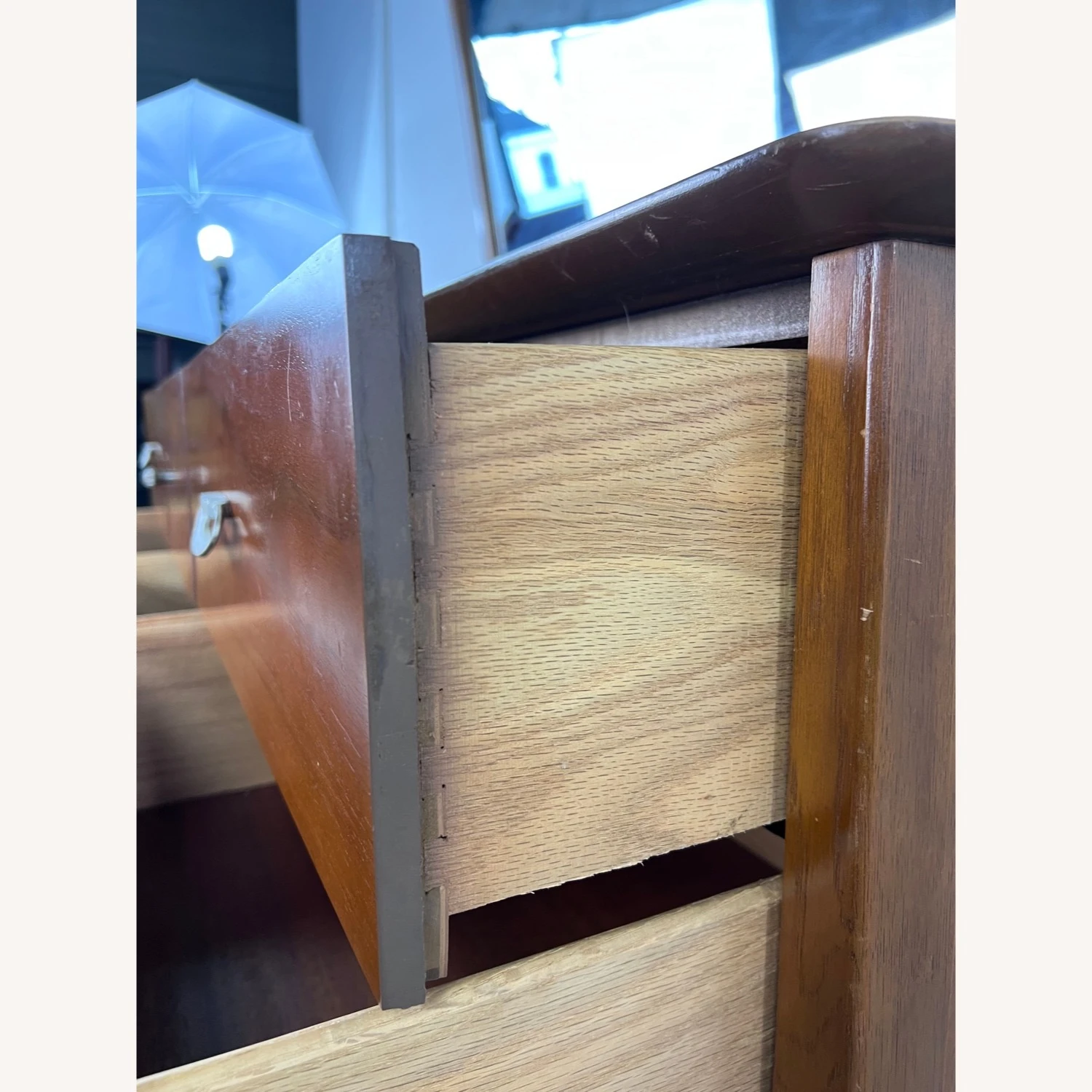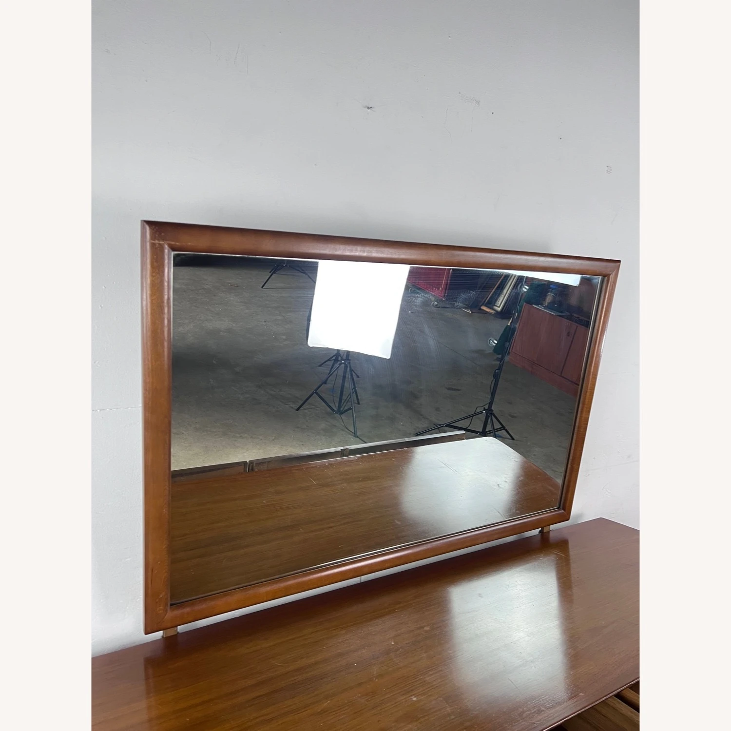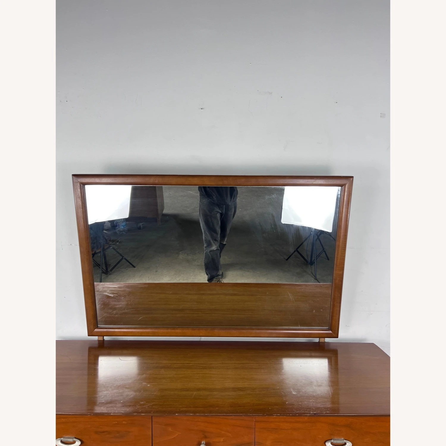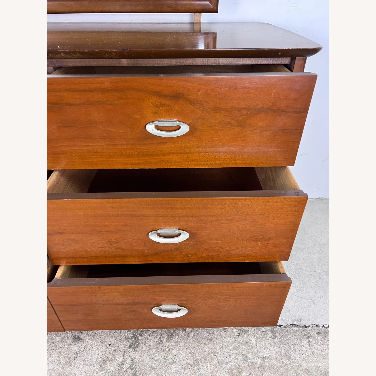Seller’s Notes: This mid century modern lowboy dresser with mounted mirror features hardwood construction, walnut veneer with original finish, nine dovetailed drawers with chrome accented hardware, and tall tapered legs.