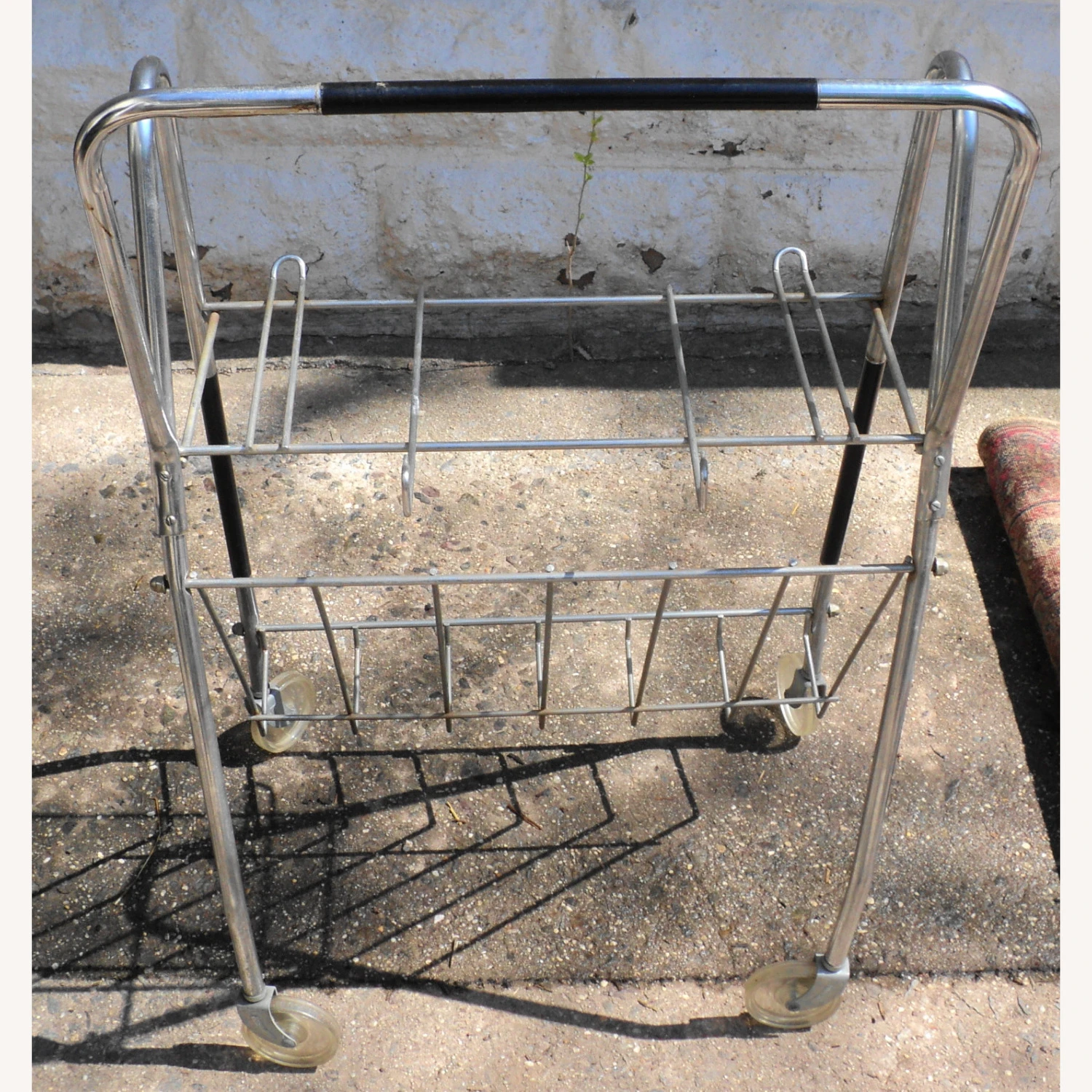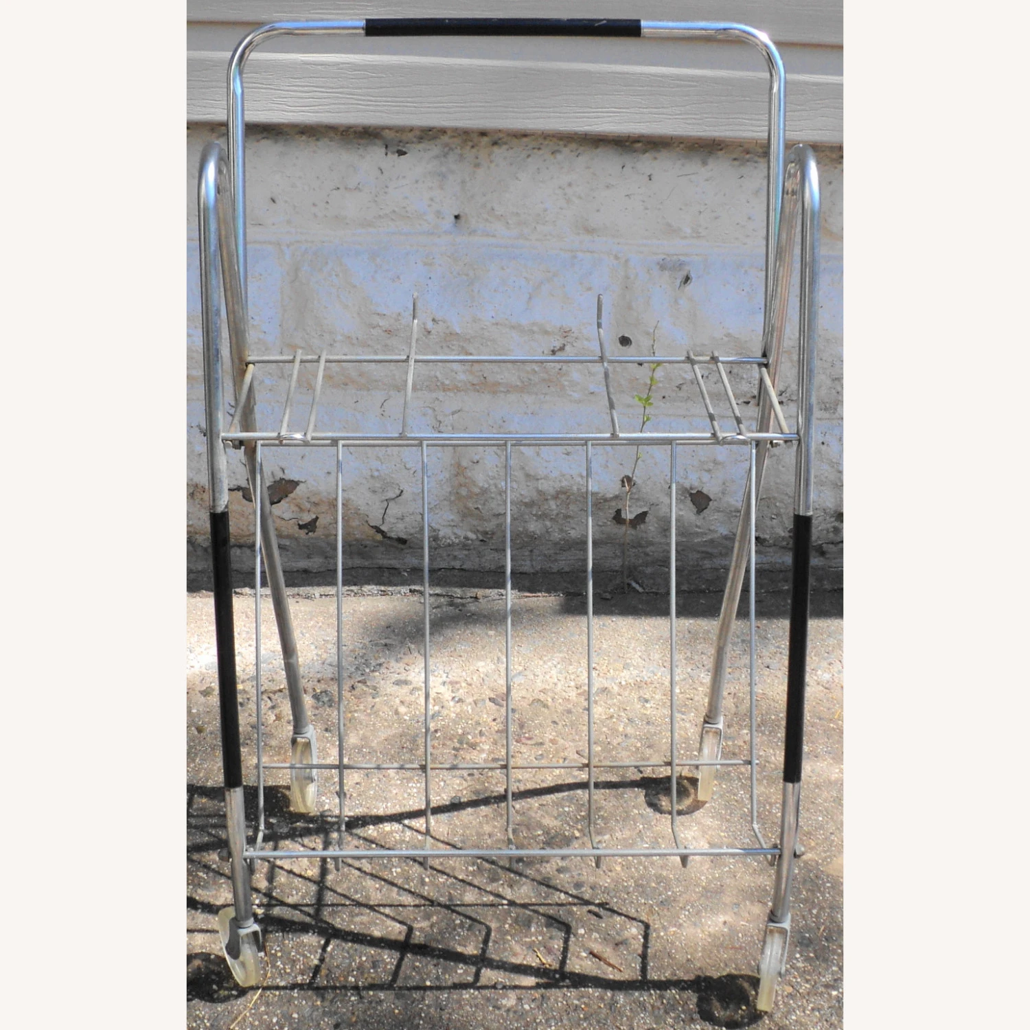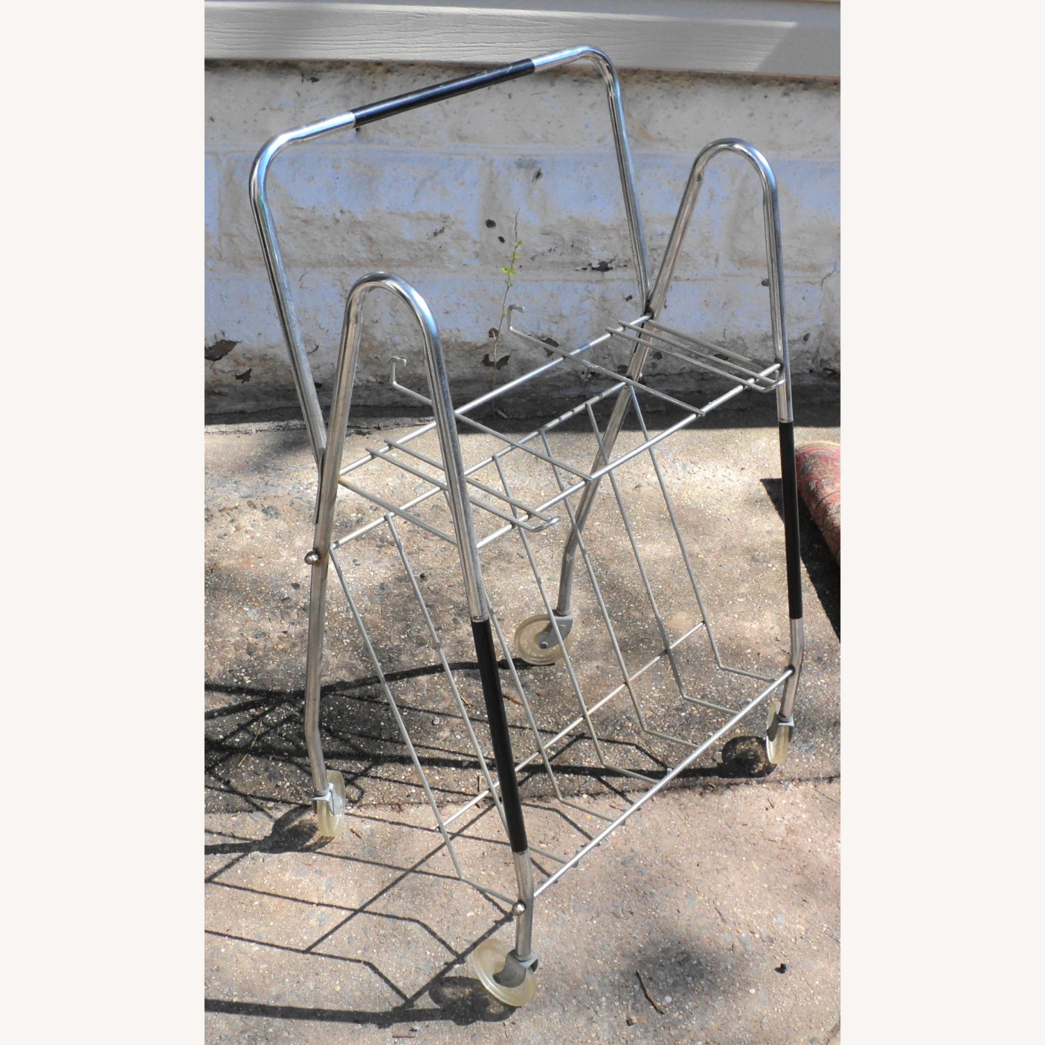 Seller’s Notes: Mid Century Modern Chrome Metal Magazine Rack Cart on Wheels. Measures “32.25 x “20 x “12. Overall good condition. I have not noticed any pitting. Wheels work well. It is disassembled for easy shipping.