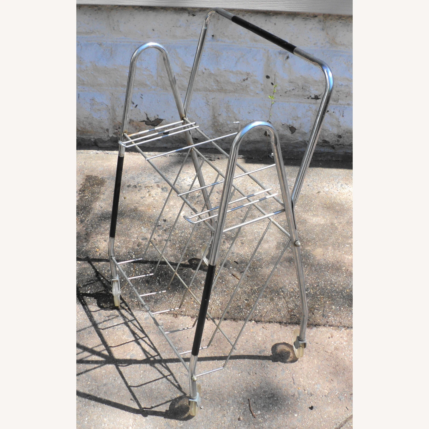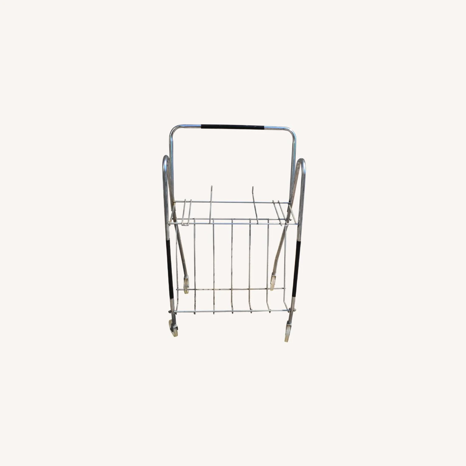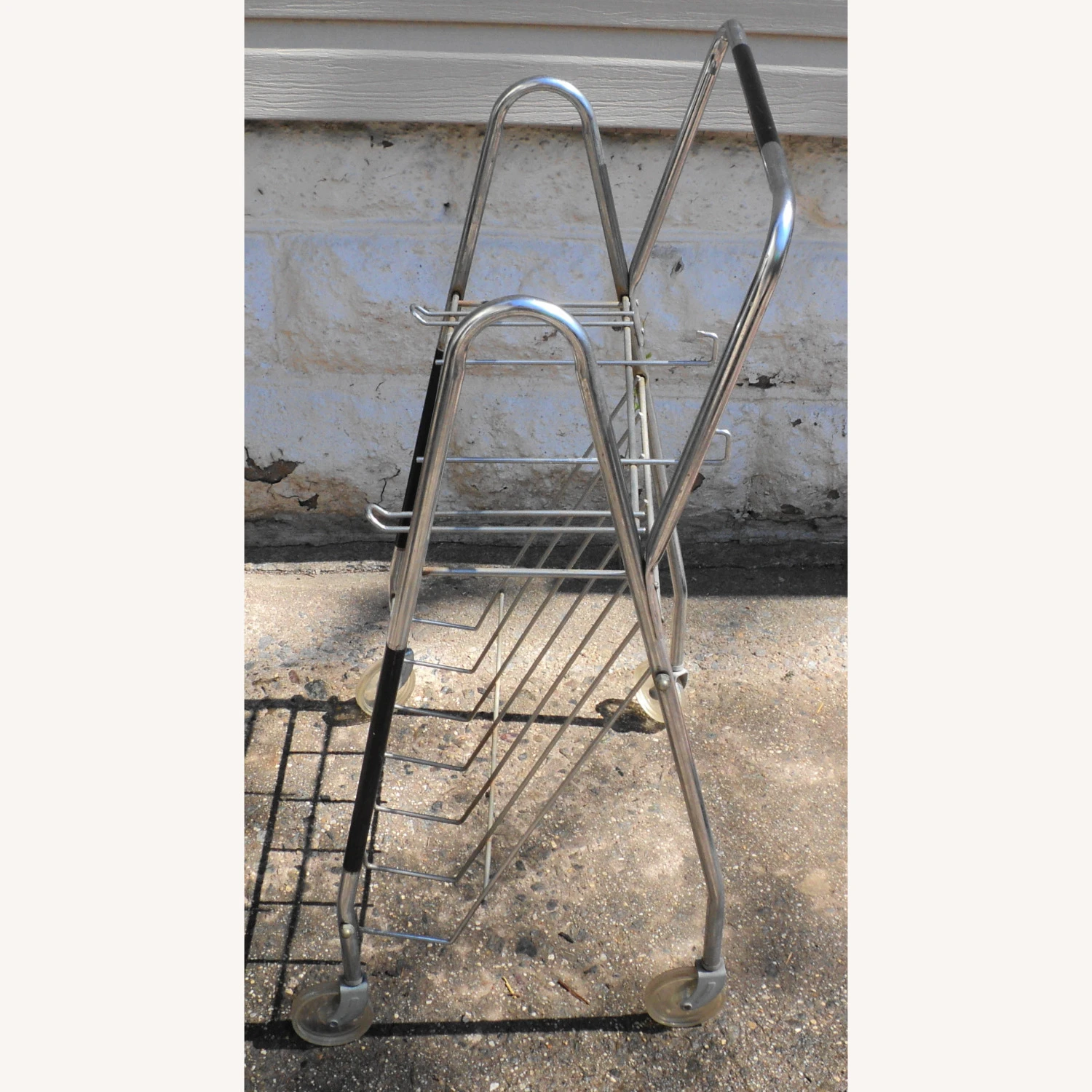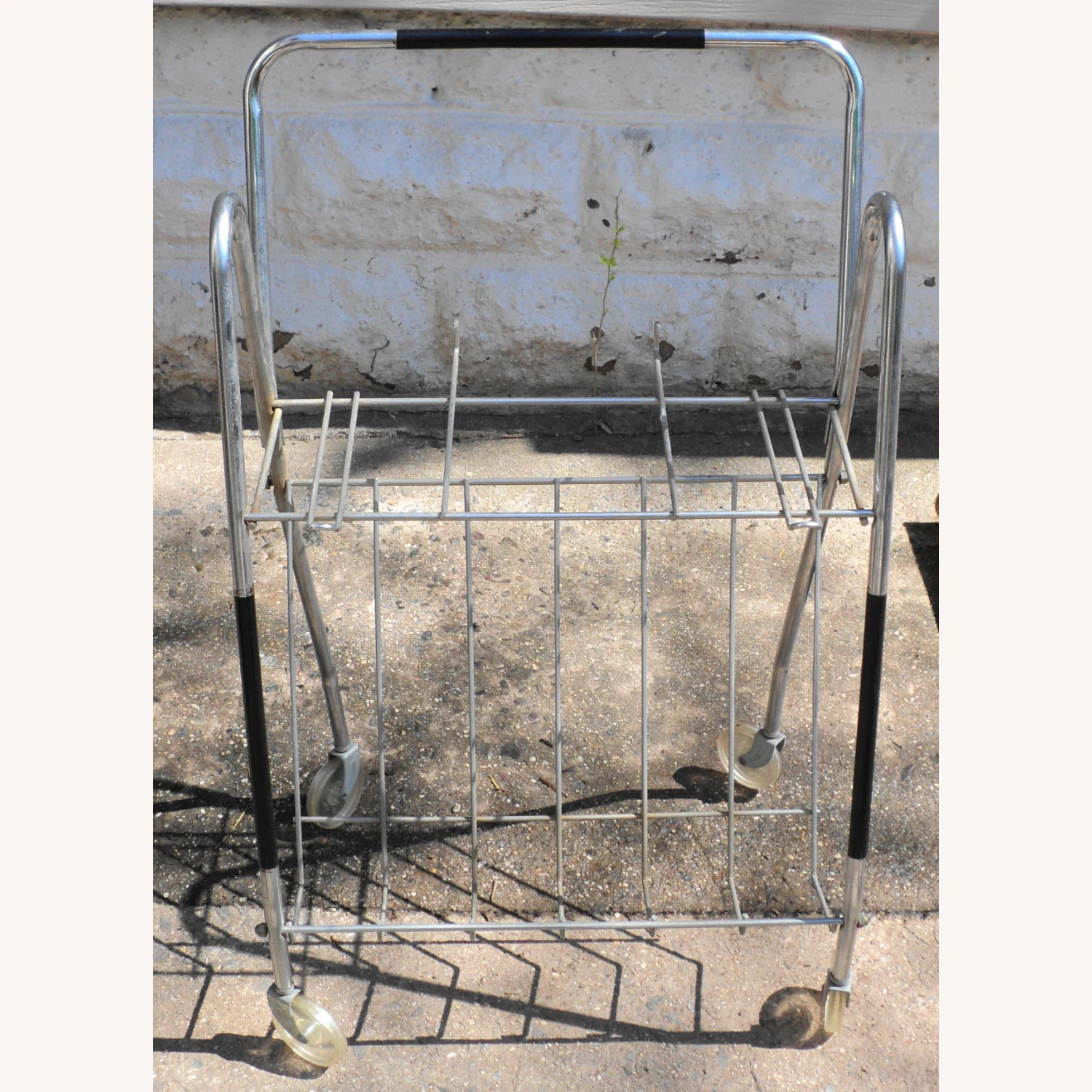 Seller’s Notes: Mid Century Modern Chrome Metal Magazine Rack Cart on Wheels. Measures “32.25 x “20 x “12. Overall good condition. I have not noticed any pitting. Wheels work well. It is disassembled for easy shipping.