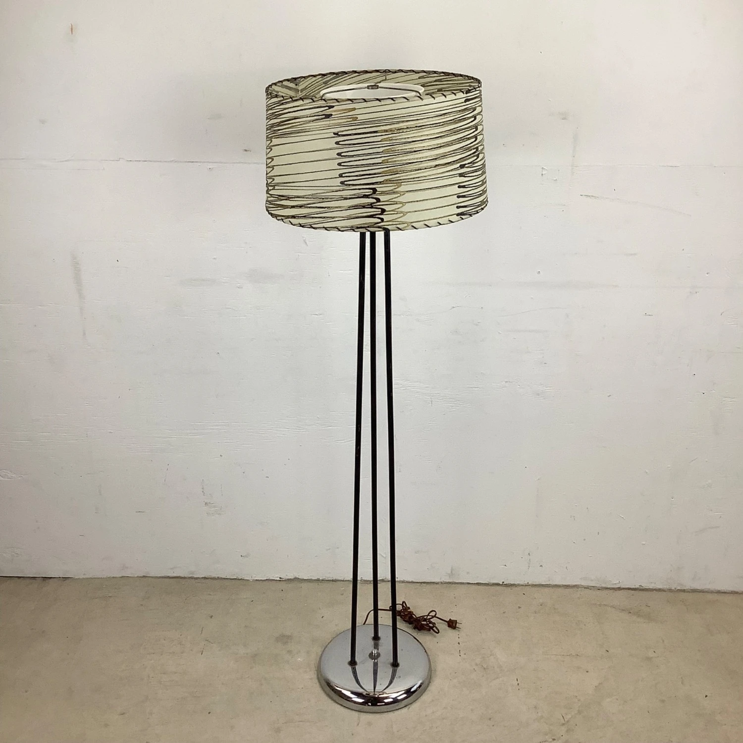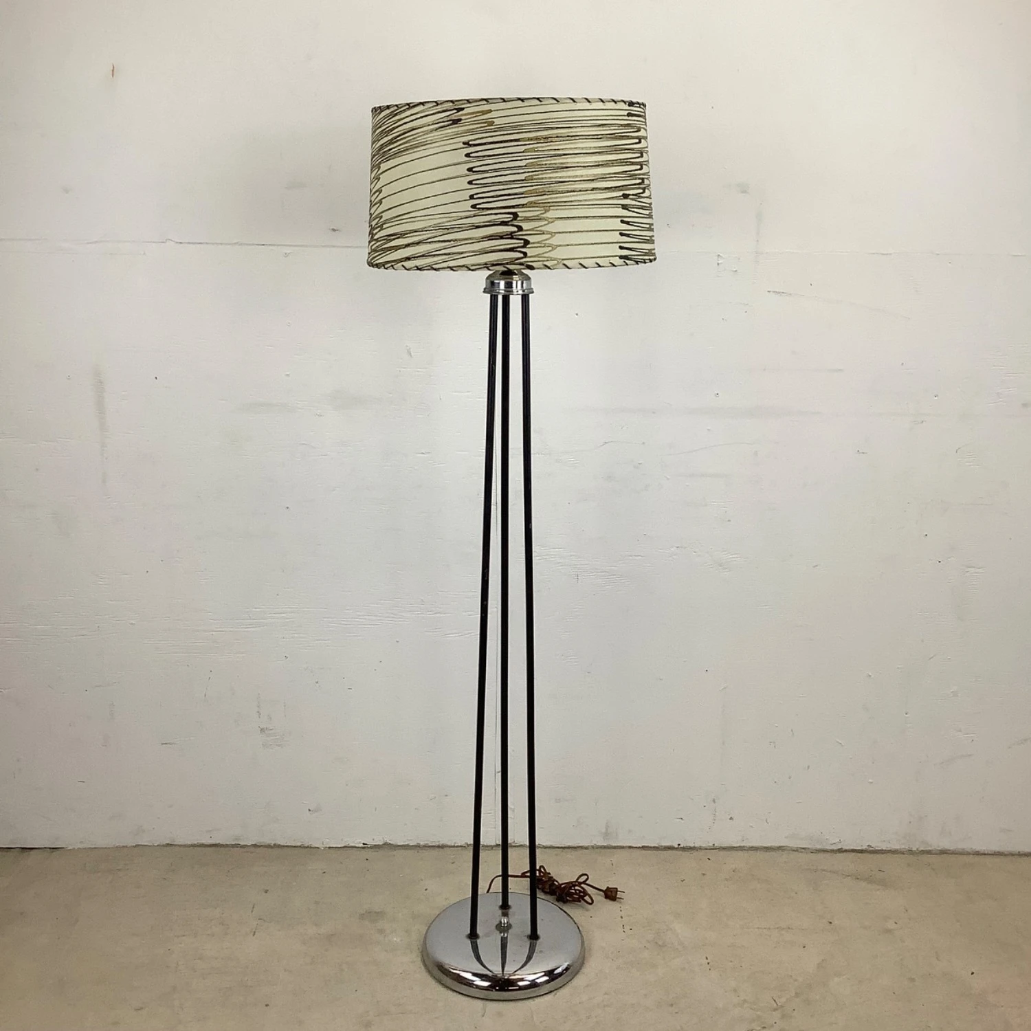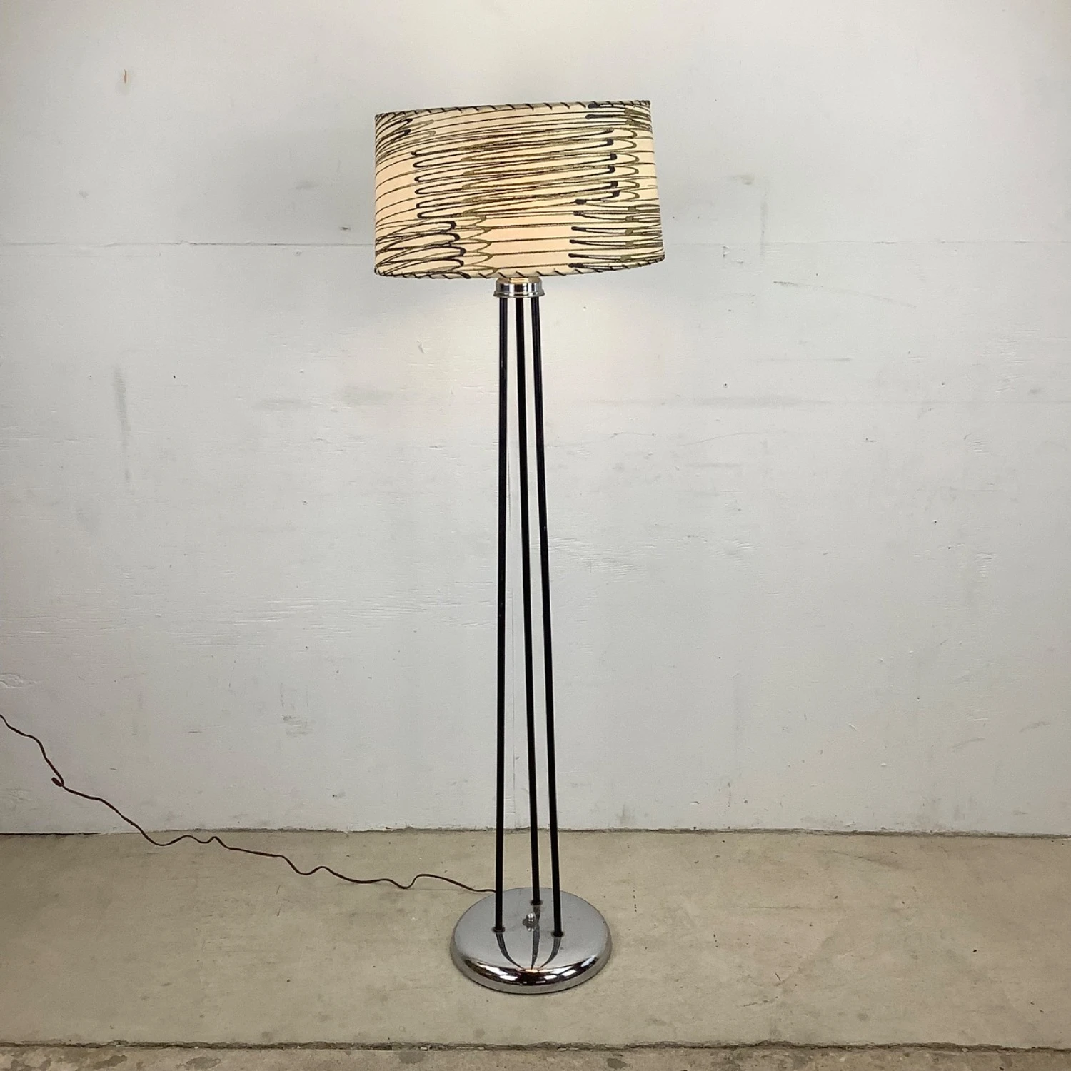 Seller’s Notes: This unique mid-century modern floor lamp features a three piece iron shaft with unique chrome detail and striped skin style shade. The eye-catching mid-century appeal of this tall retro lamp make it the perfect piece of accent lighting for home or business.