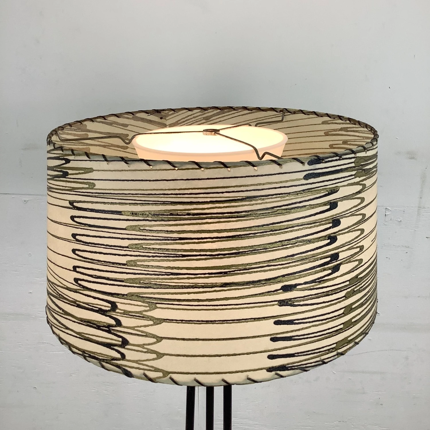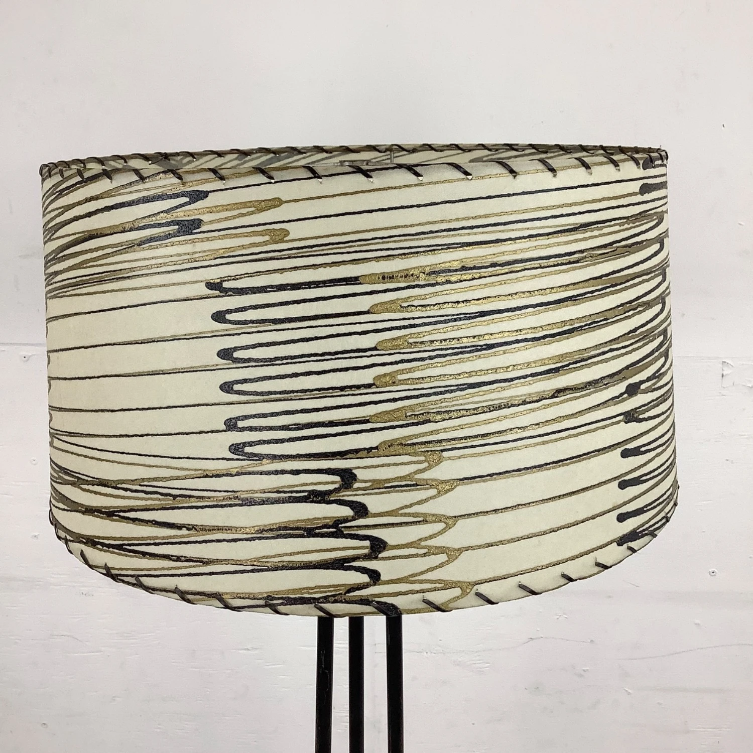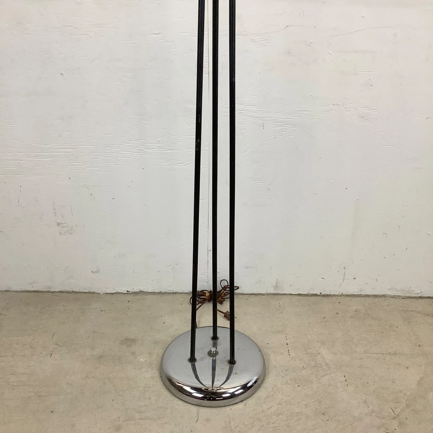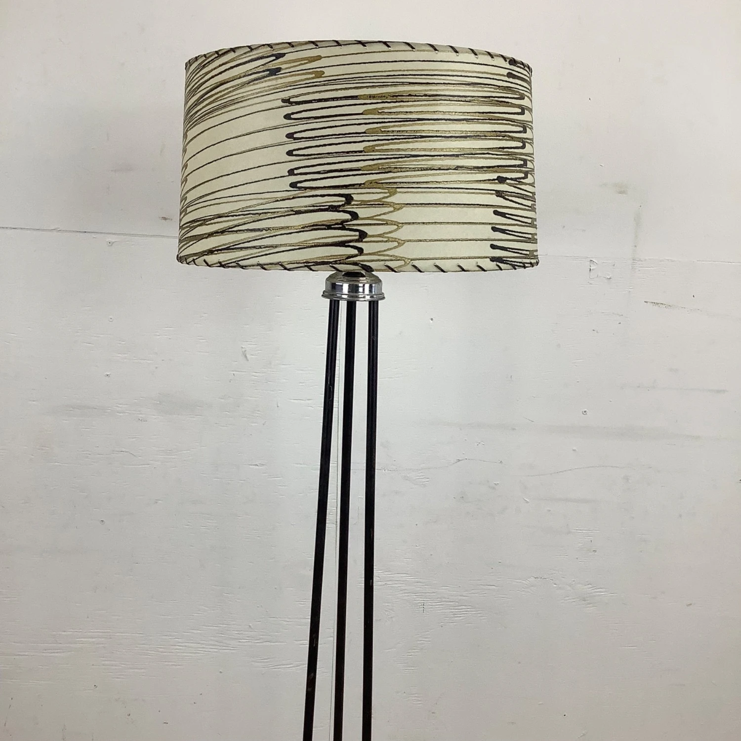 Seller’s Notes: This unique mid-century modern floor lamp features a three piece iron shaft with unique chrome detail and striped skin style shade. The eye-catching mid-century appeal of this tall retro lamp make it the perfect piece of accent lighting for home or business.