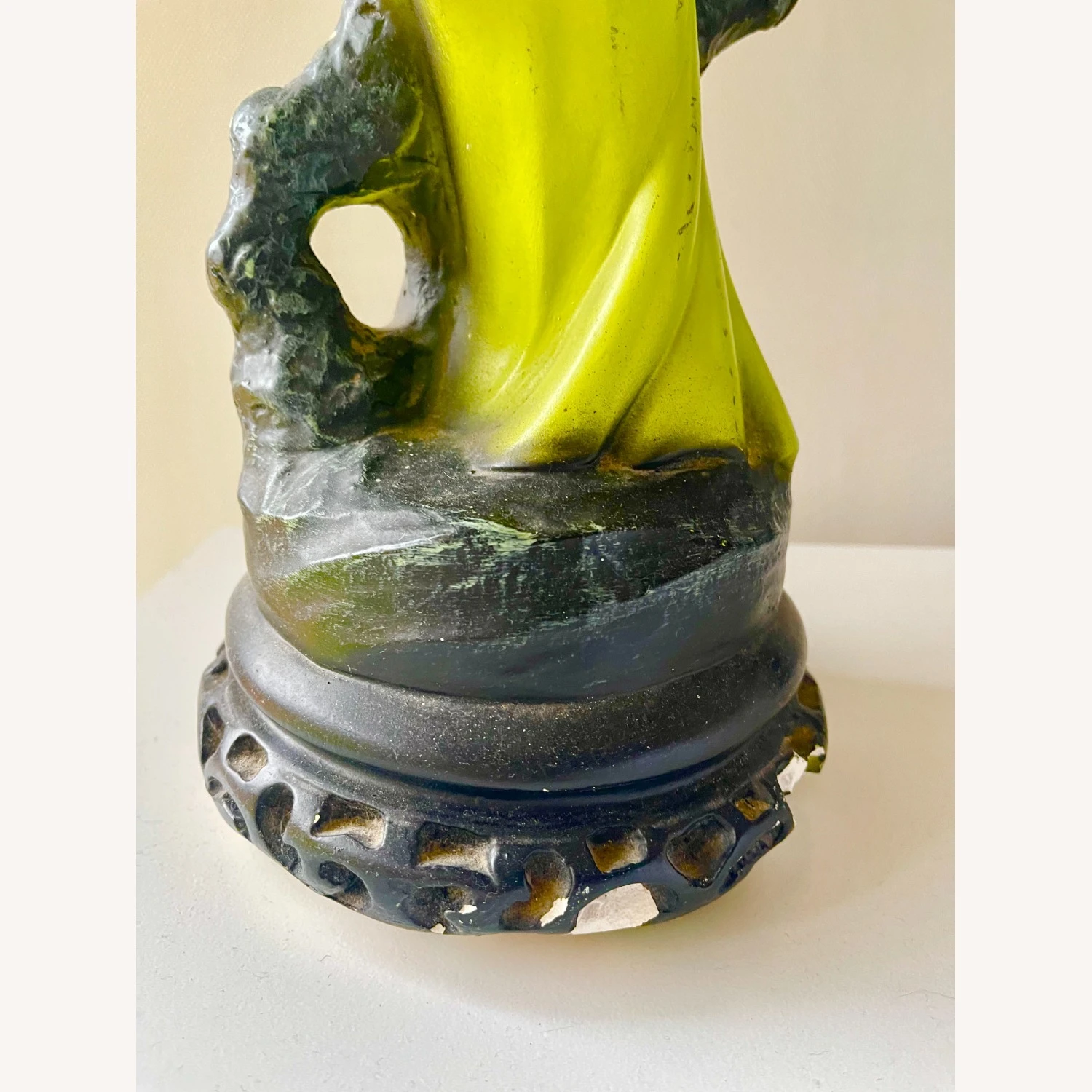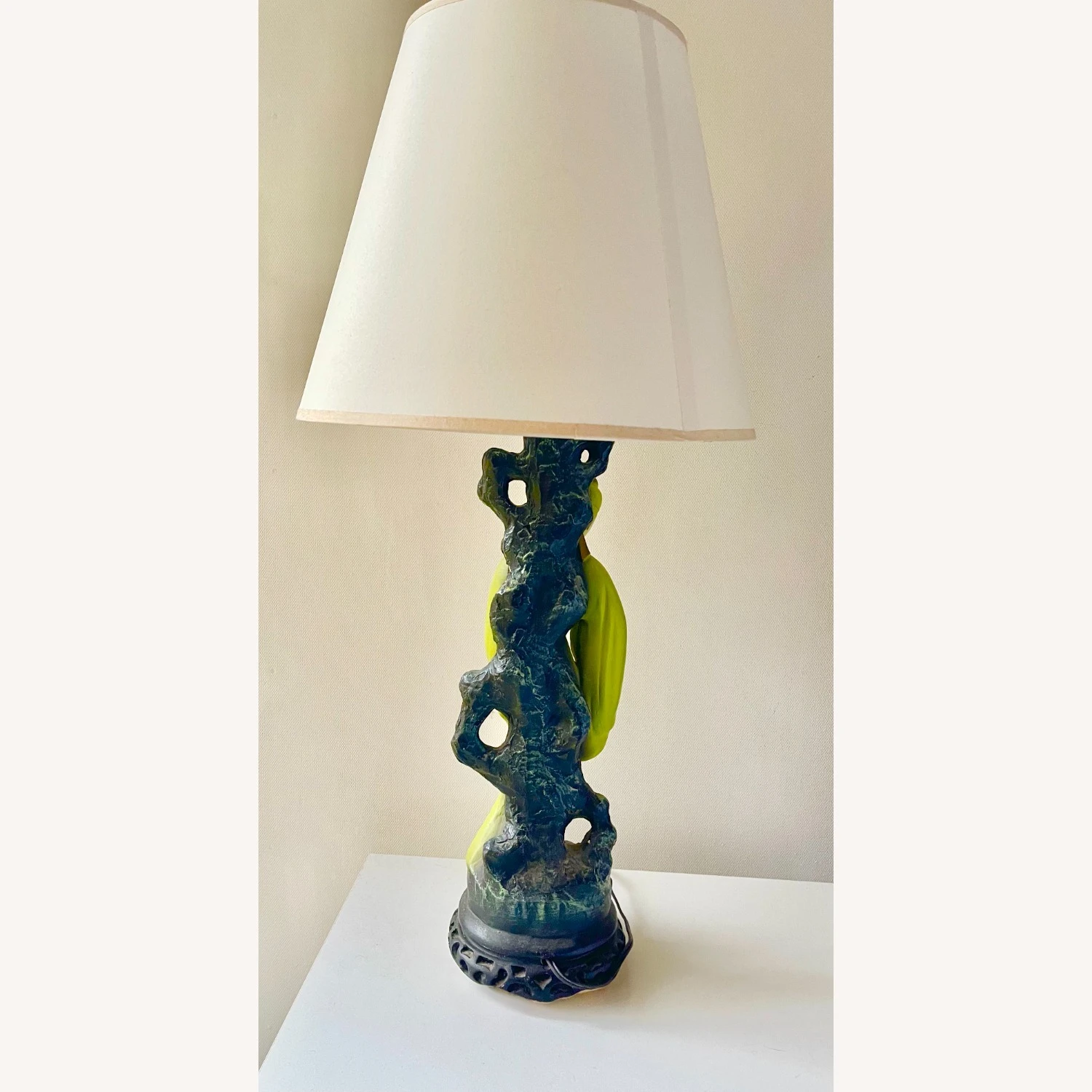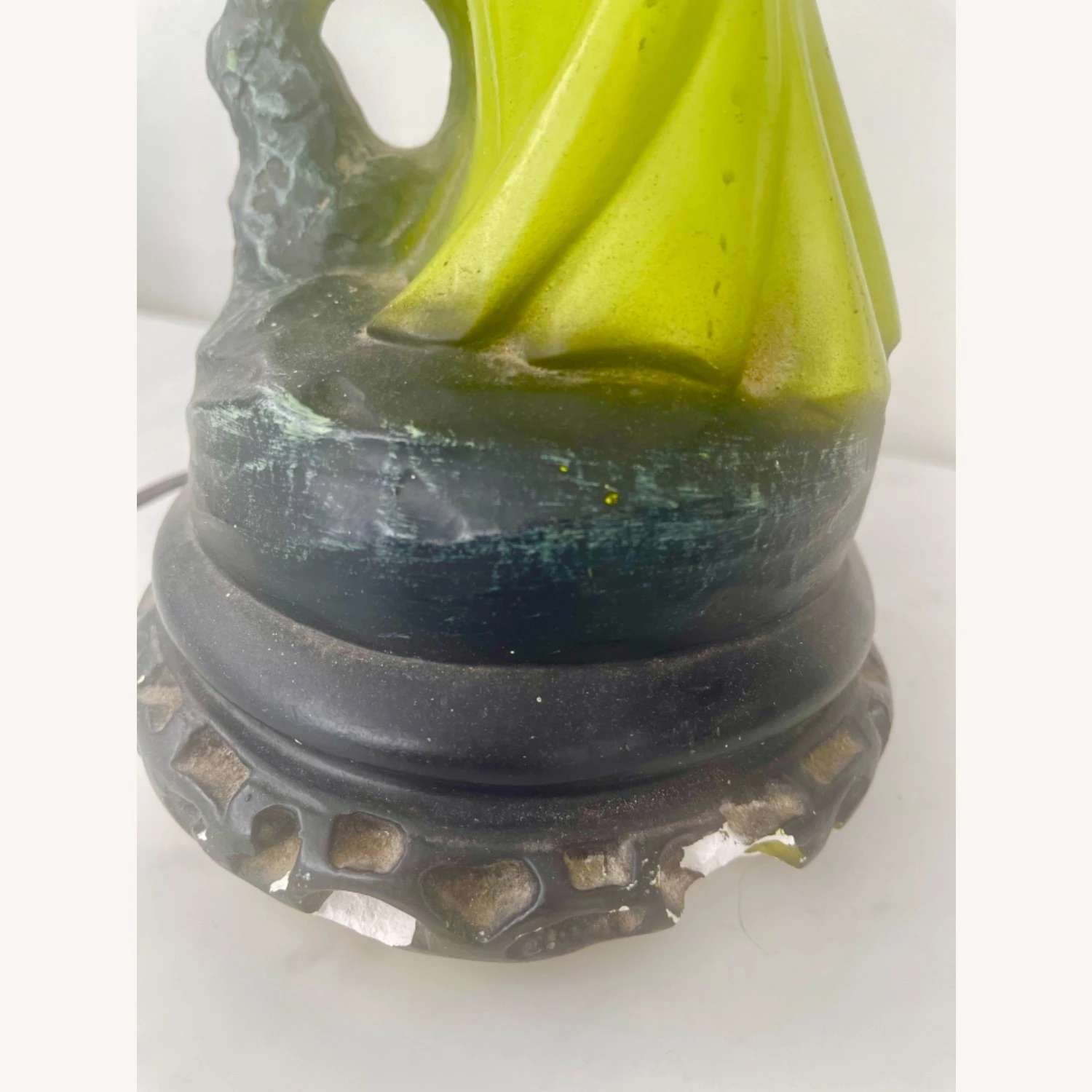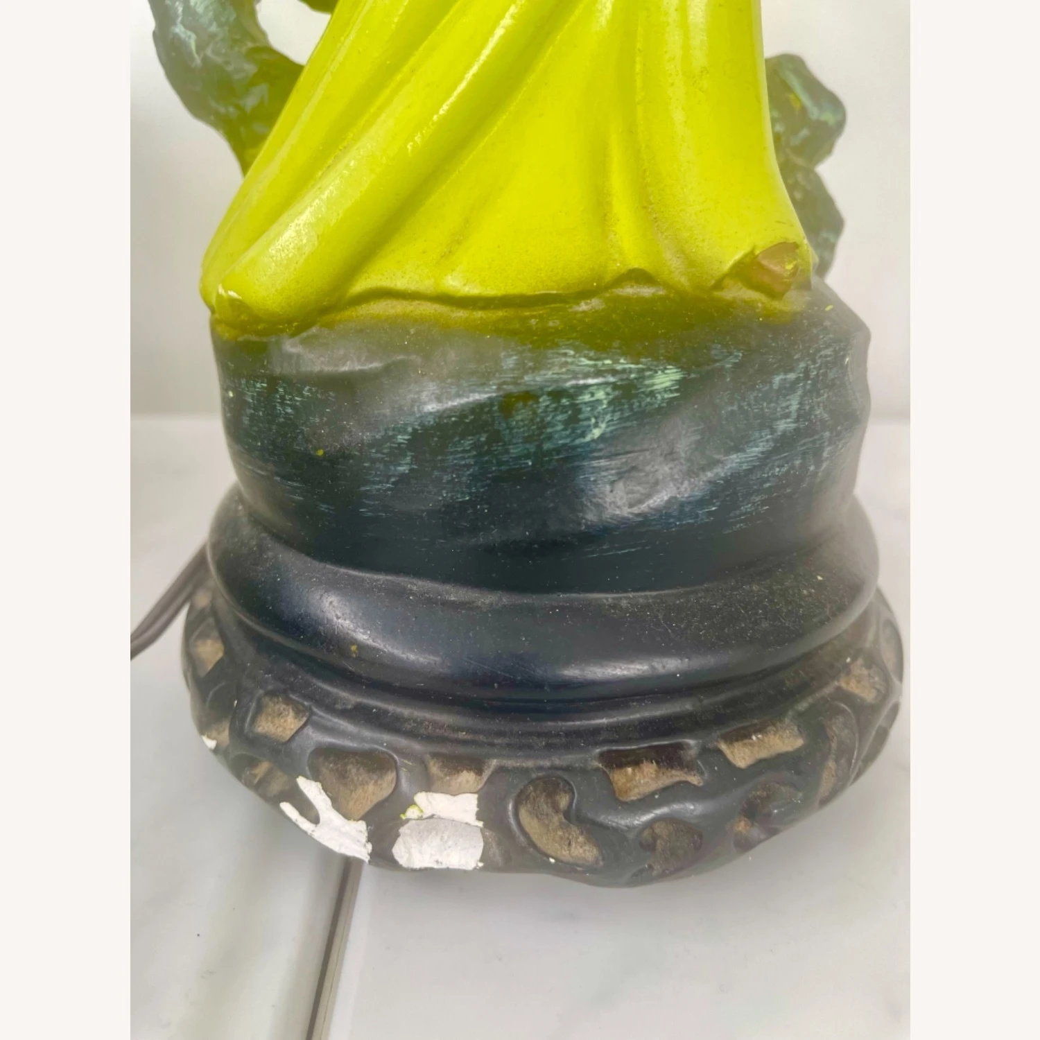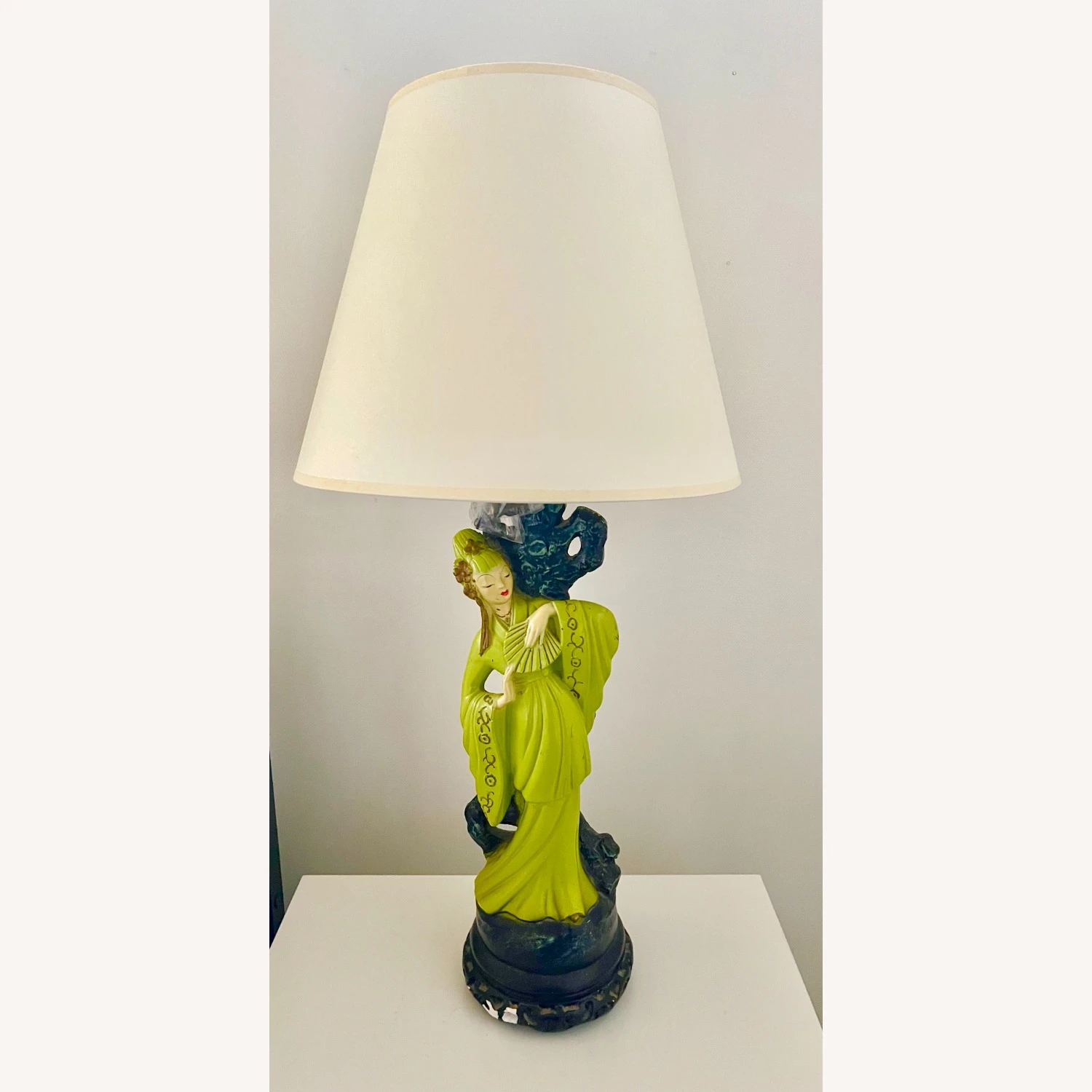 Seller’s Notes: Vintage. Mid Century Modern pair of Chinoise table lamps. Male and female figures. Made of chalkware, very common in lamps of this era. Painted. Some chips in base of both lamps. Otherwise very good condition. Most likely more than 50 years old. Includes brand new linen shades. Shades alone cost $250.00 at Oriental Lamp Shade Company. Newly wired for electricity. Add cool vintage whimsy to your space!
