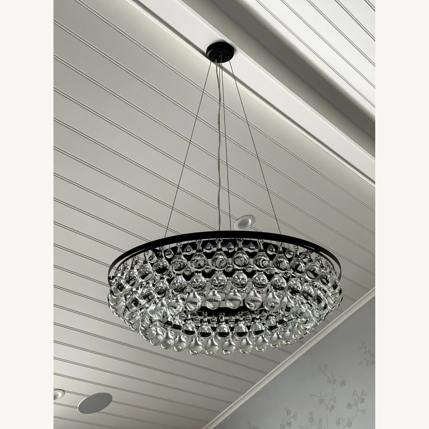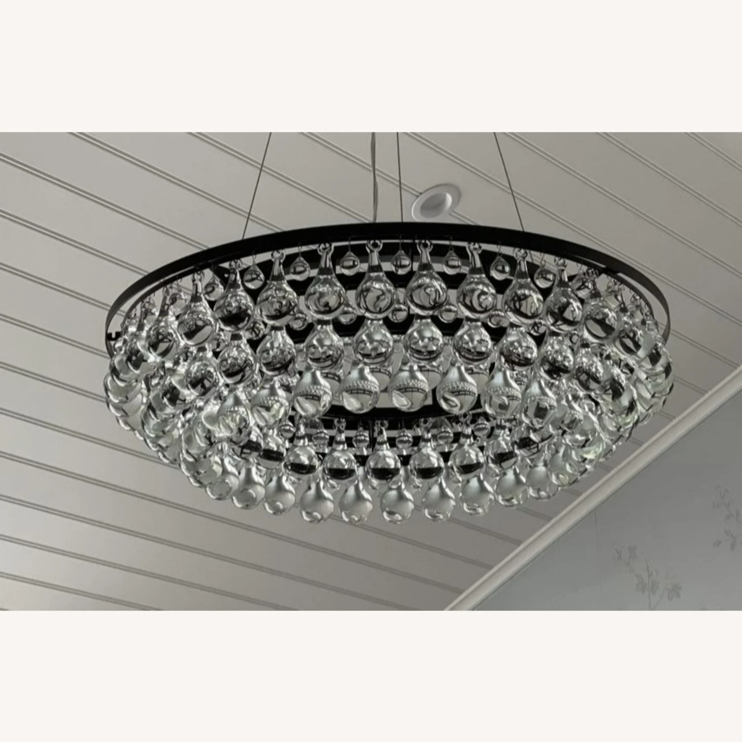 Seller’s Notes: patinated polished nickel frame with two tiered rim of clear or mercury grey glass drops