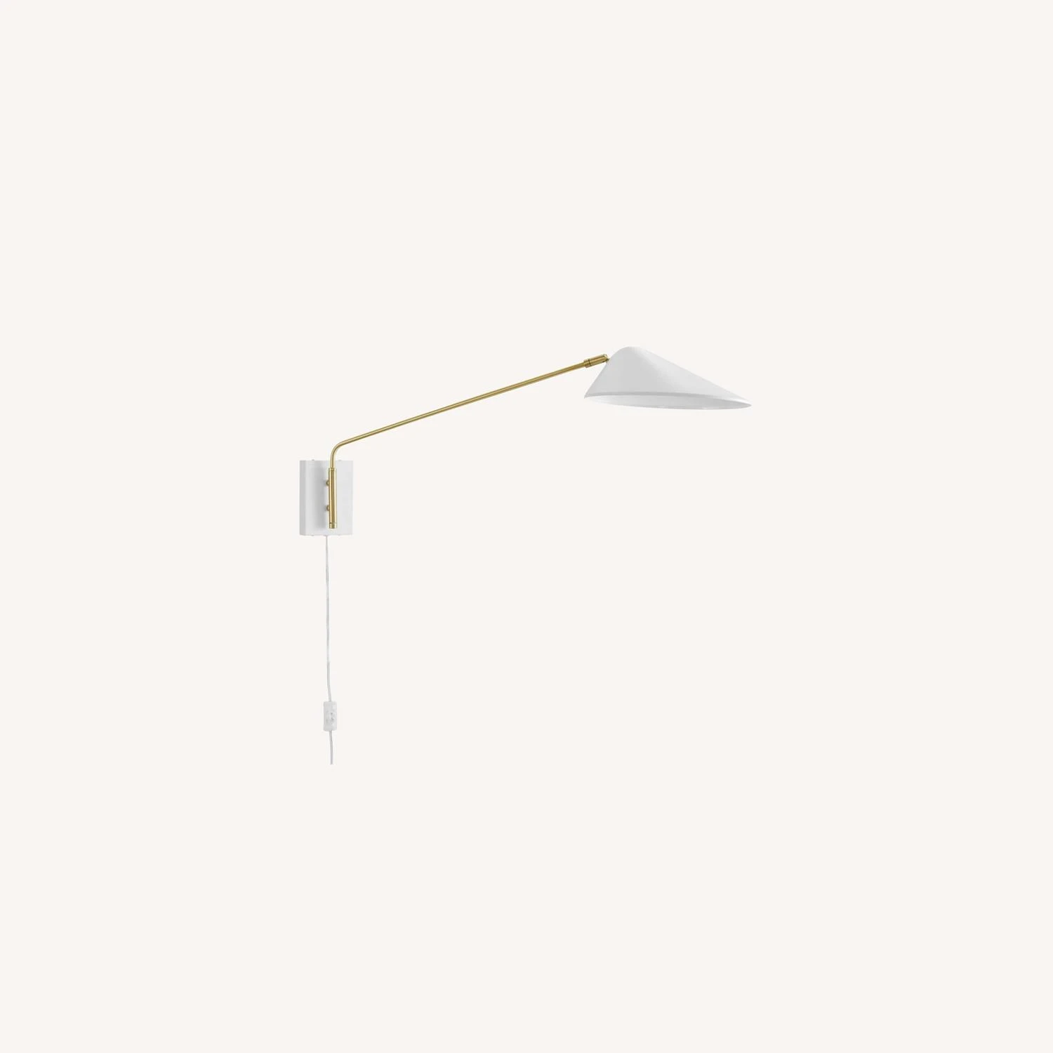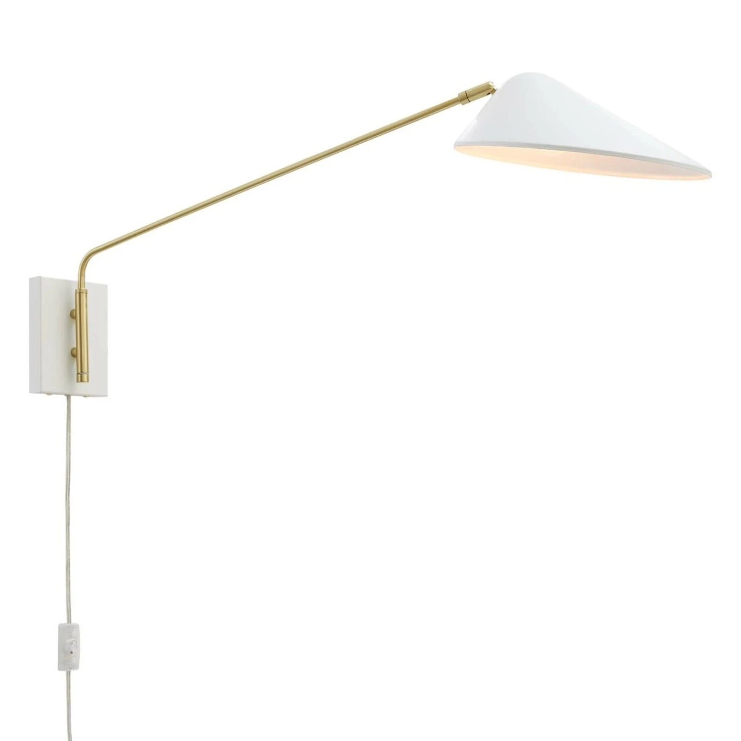 โข This mid-century modern wall lamp features a compact powder-coated metal backplate and a sleek matte shade anchored on a satin brass rod.