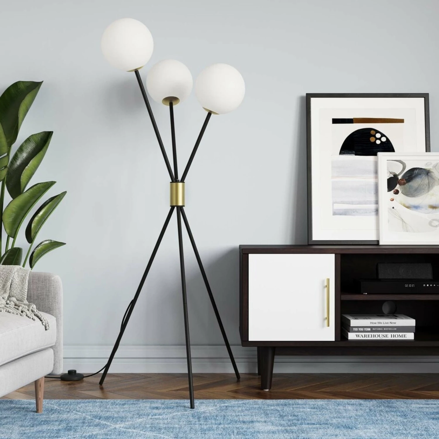 โข Three opaque white orb shades set at varying heights bestow this floor lamp with organic grandeur, complementing mid-century modern, minimalist contemporary, or eclectic decors.