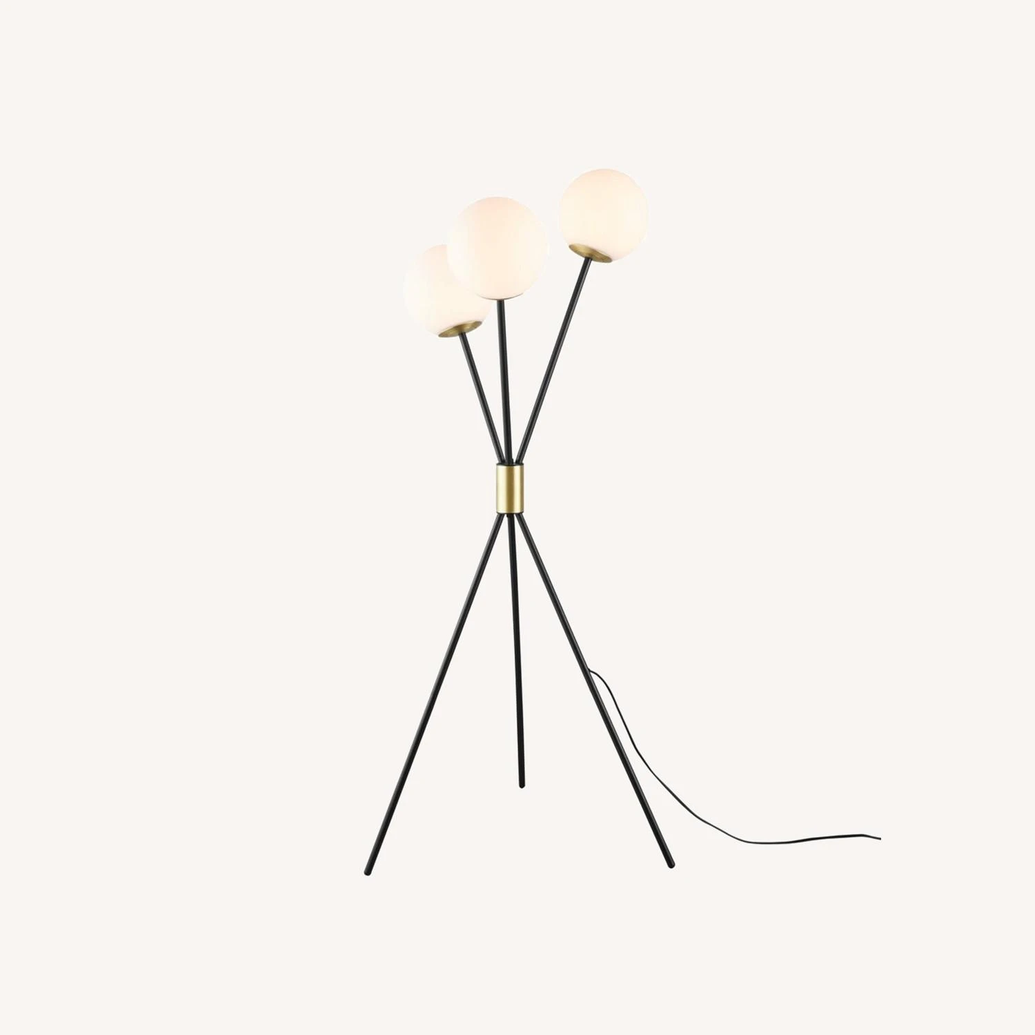 โข This contemporary floor lamp boasts a lean powder-coated black matte tripod base cinched at the center with a satin brass connector.
