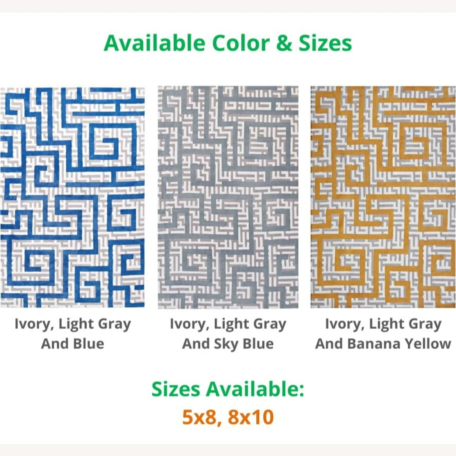This model comes in these colors: IVORY, LIGHT GRAY, and BLUE, IVORY, LIGHT GRAY, and LIGHT BLUE, & IVORY, LIGHT GRAY, and BANANA YELLOW, and these sizes: 5×8 & 8×10. If you are interested in a color/size other than that of this listing, and if the quantity you wish to purchase is greater than what is listed here, please message us for availability.