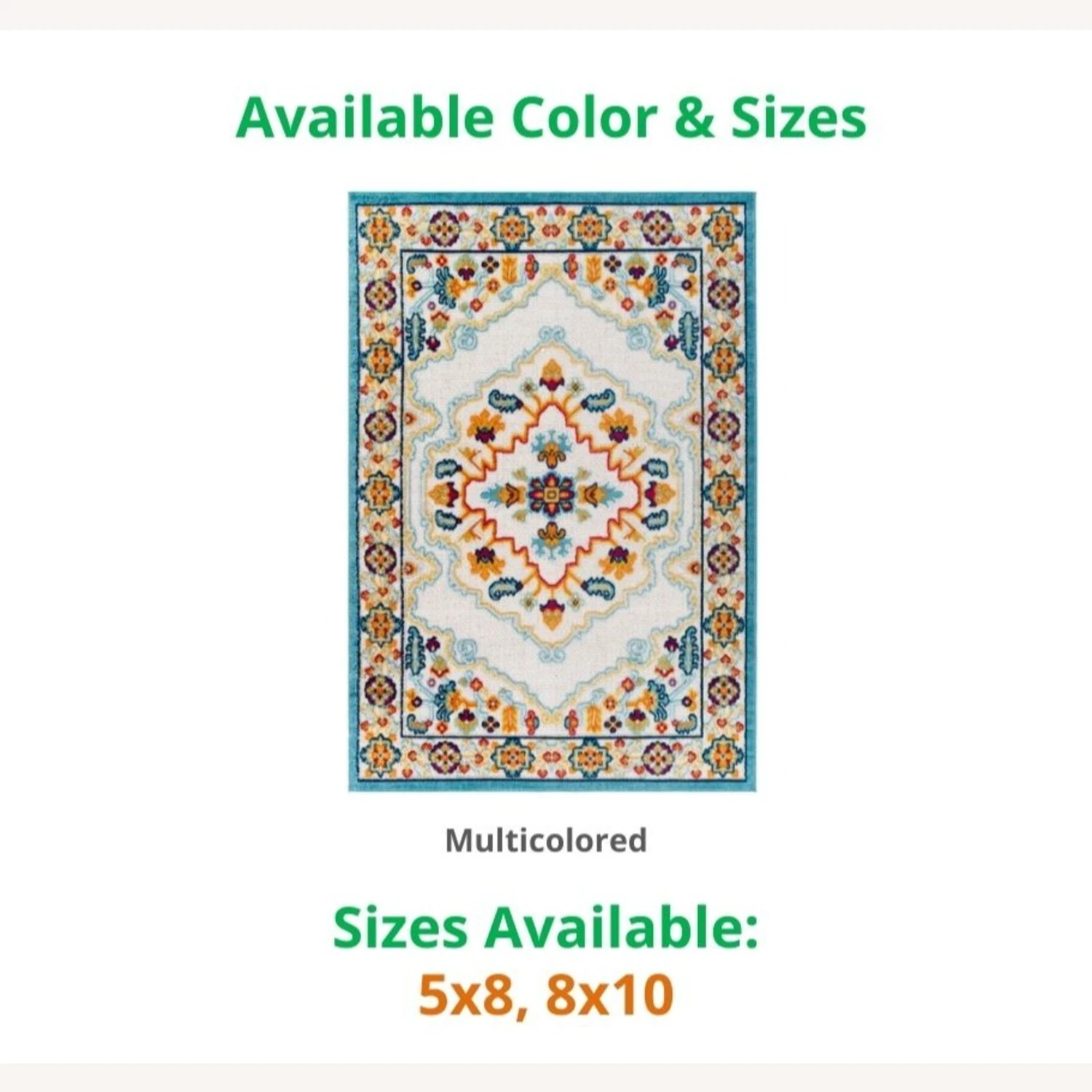This model comes in these colors: MULTICOLORED, and these sizes: 5×8 & 8×10. If you are interested in a color/size other than that of this listing, and if the quantity you wish to purchase is greater than what is listed here, please message us for availability.